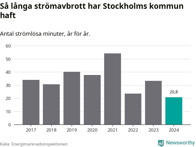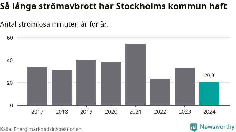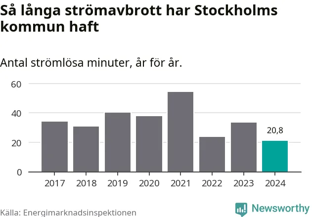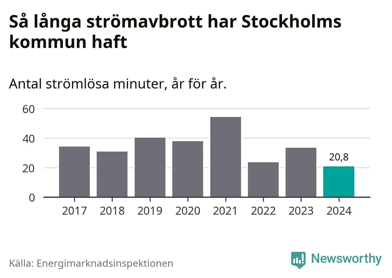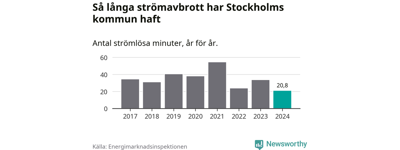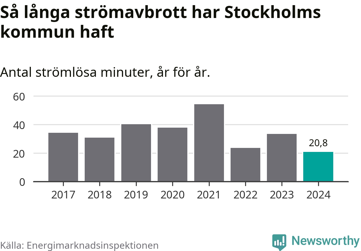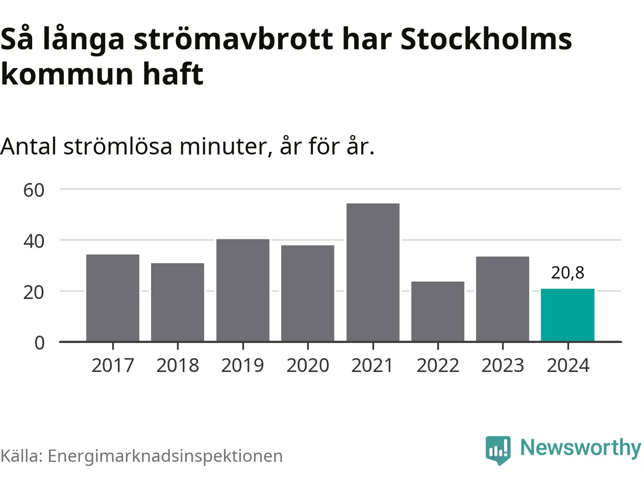 Antalet strömavbrott och total strömlös tid varierar något från år till år i Stockholms kommun. Mest tid utan ström (i alla fall under perioden 2017–2024) fick stockholmarna genomleva under 2021 – 54 minuter. Det är 21 minuter längre än under ett normalår.