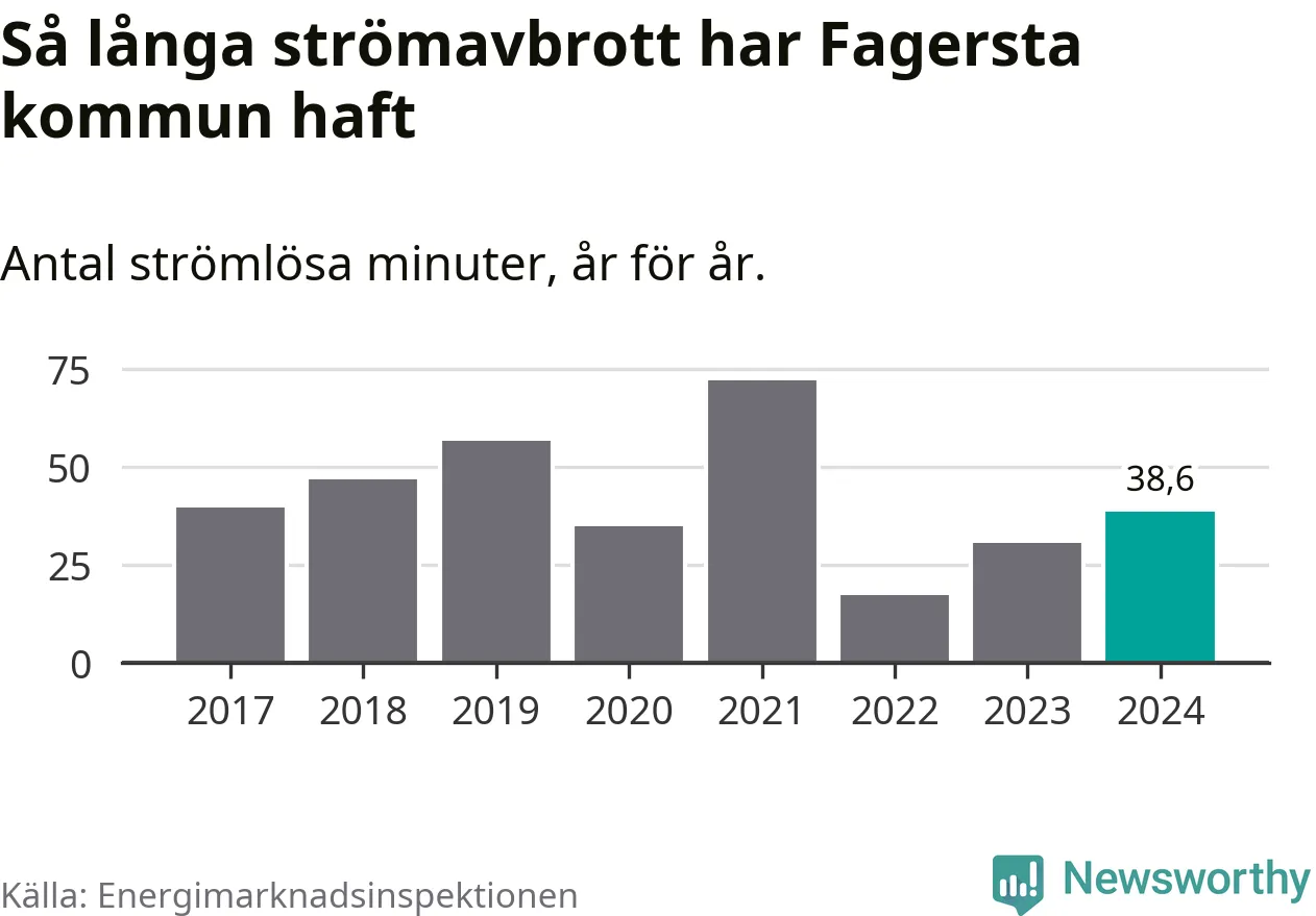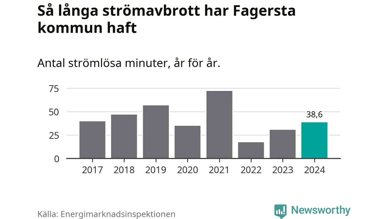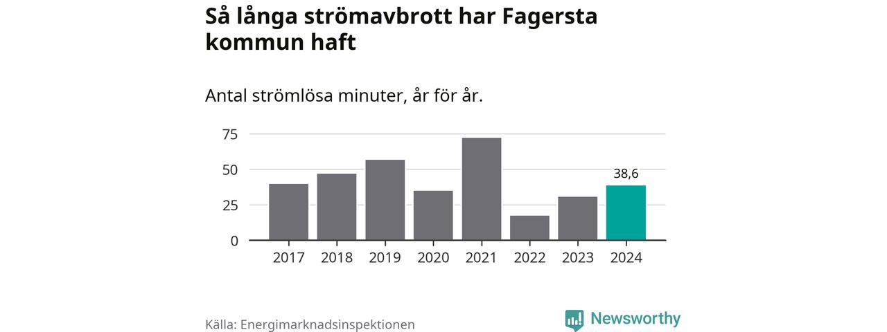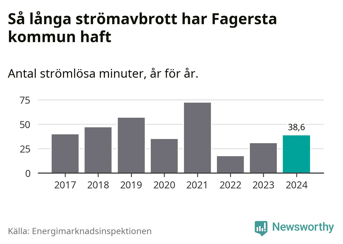Antalet strömavbrott och total strömlös tid varierar något från år till år i Fagersta kommun. Mest tid utan ström (i alla fall under perioden 2017–2024) fick Fagerstaborna genomleva under 2021 – en timme och tolv minuter. Det är 33 minuter längre än under ett normalår.