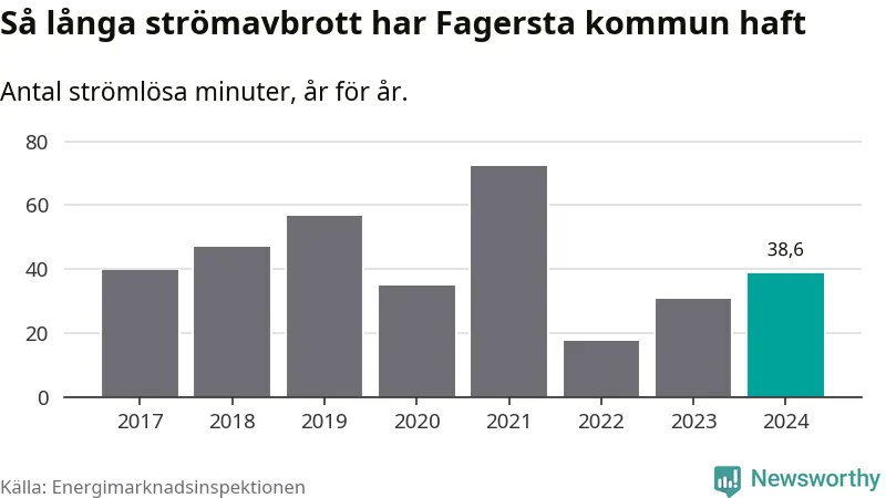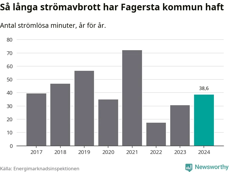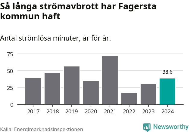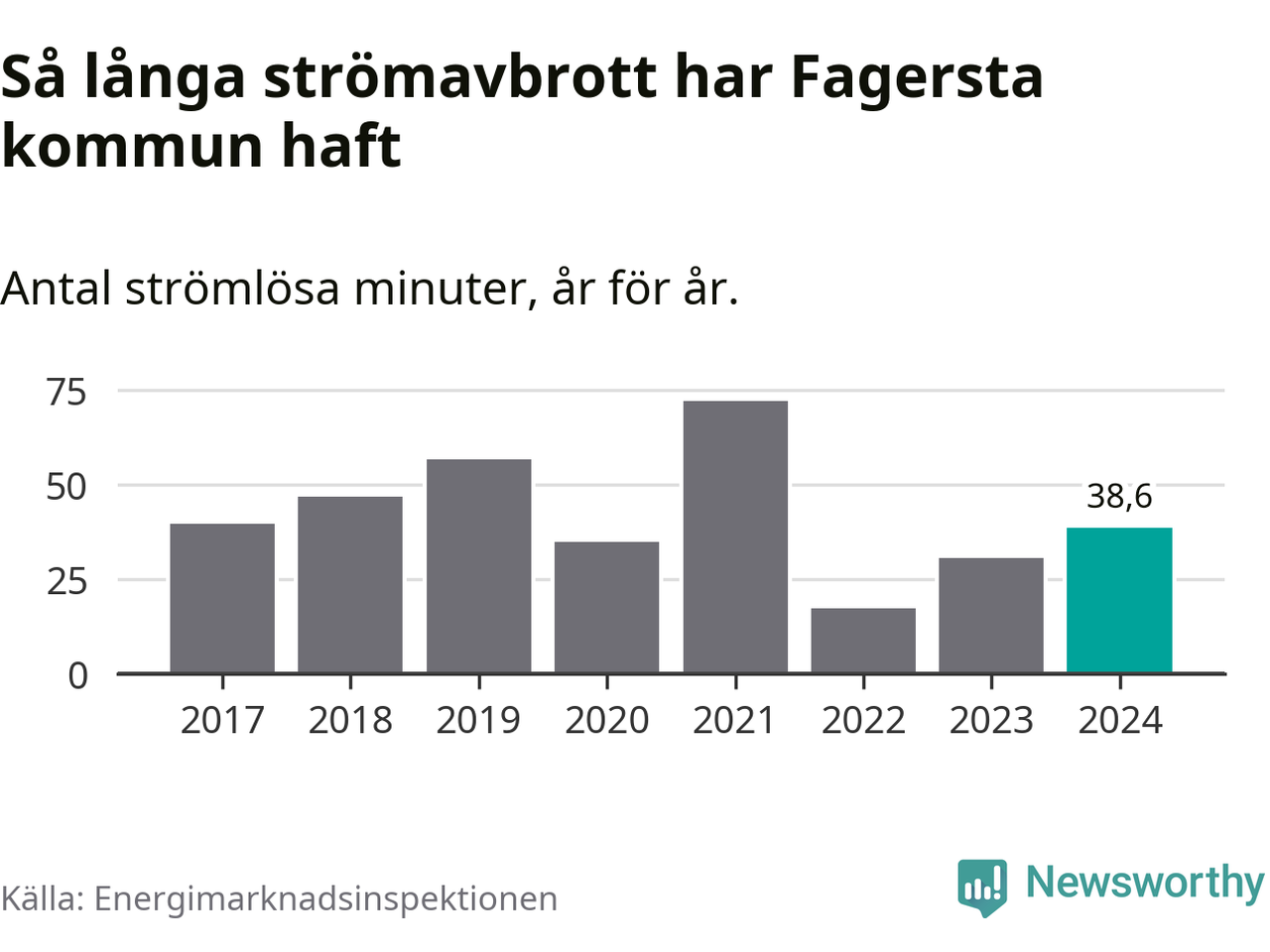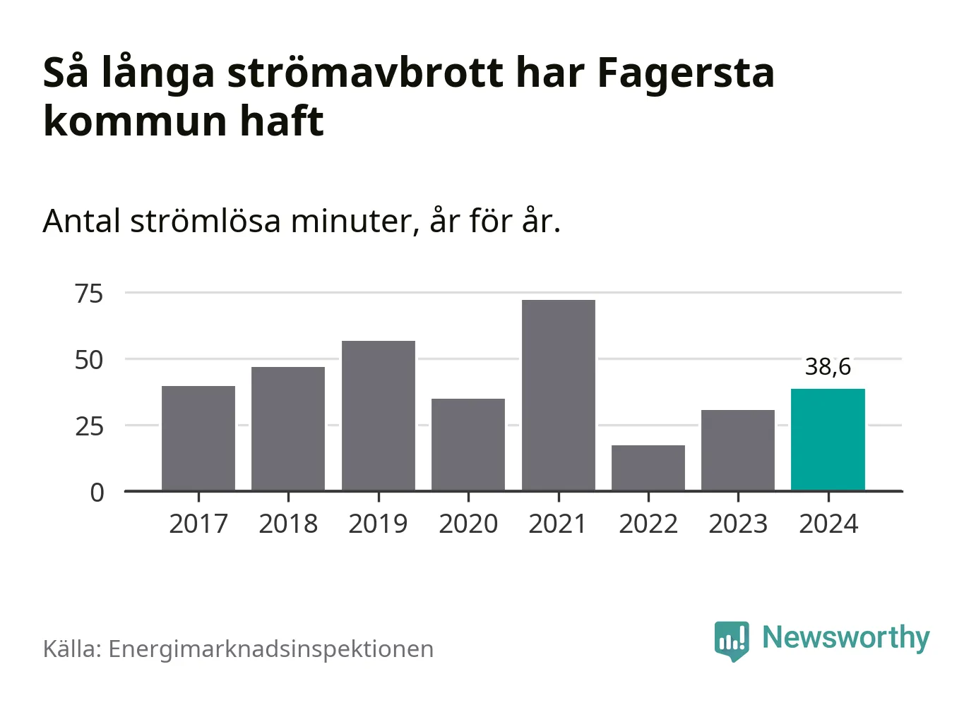 Antalet strömavbrott och total strömlös tid varierar något från år till år i Fagersta kommun. Mest tid utan ström (i alla fall under perioden 2017–2024) fick Fagerstaborna genomleva under 2021 – en timme och tolv minuter. Det är 33 minuter längre än under ett normalår.