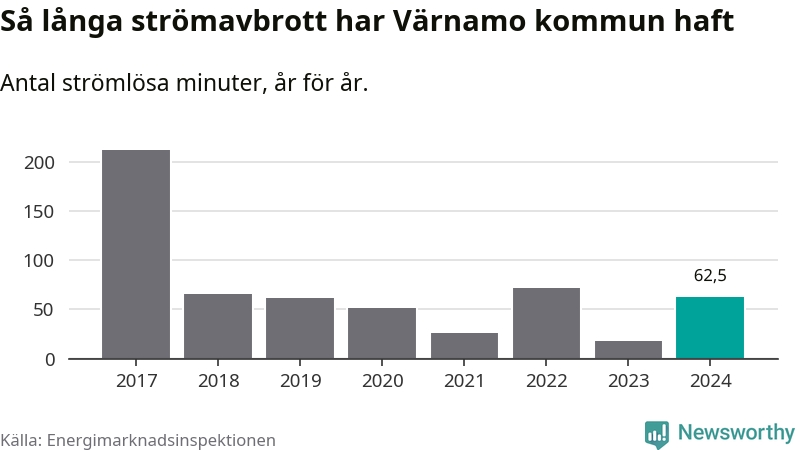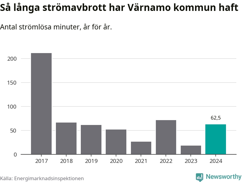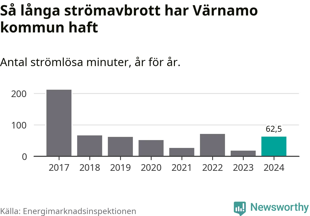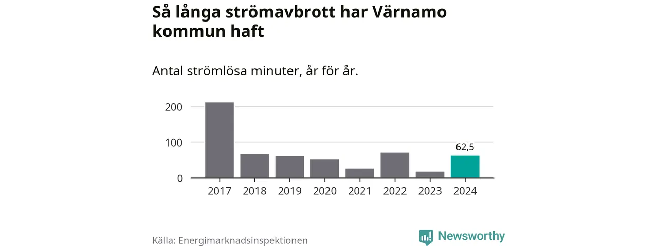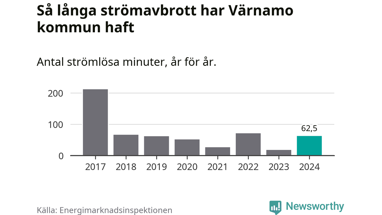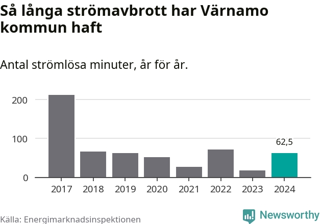 Antalet strömavbrott och total strömlös tid varierar från år till år i Värnamo kommun. Mest tid utan ström (i alla fall under perioden 2017–2024) fick Värnamoborna genomleva under 2017 – tre timmar och 32 minuter. Det är två timmar och 30 minuter längre än under ett normalår.