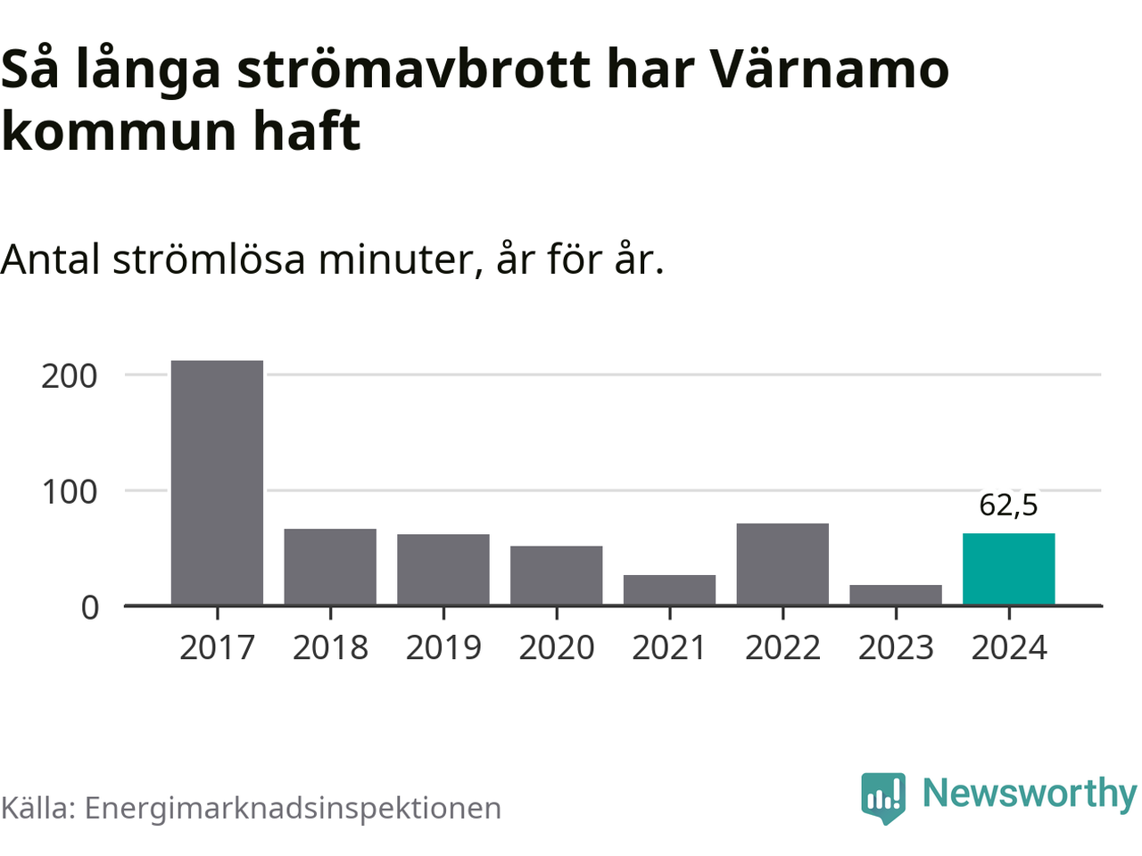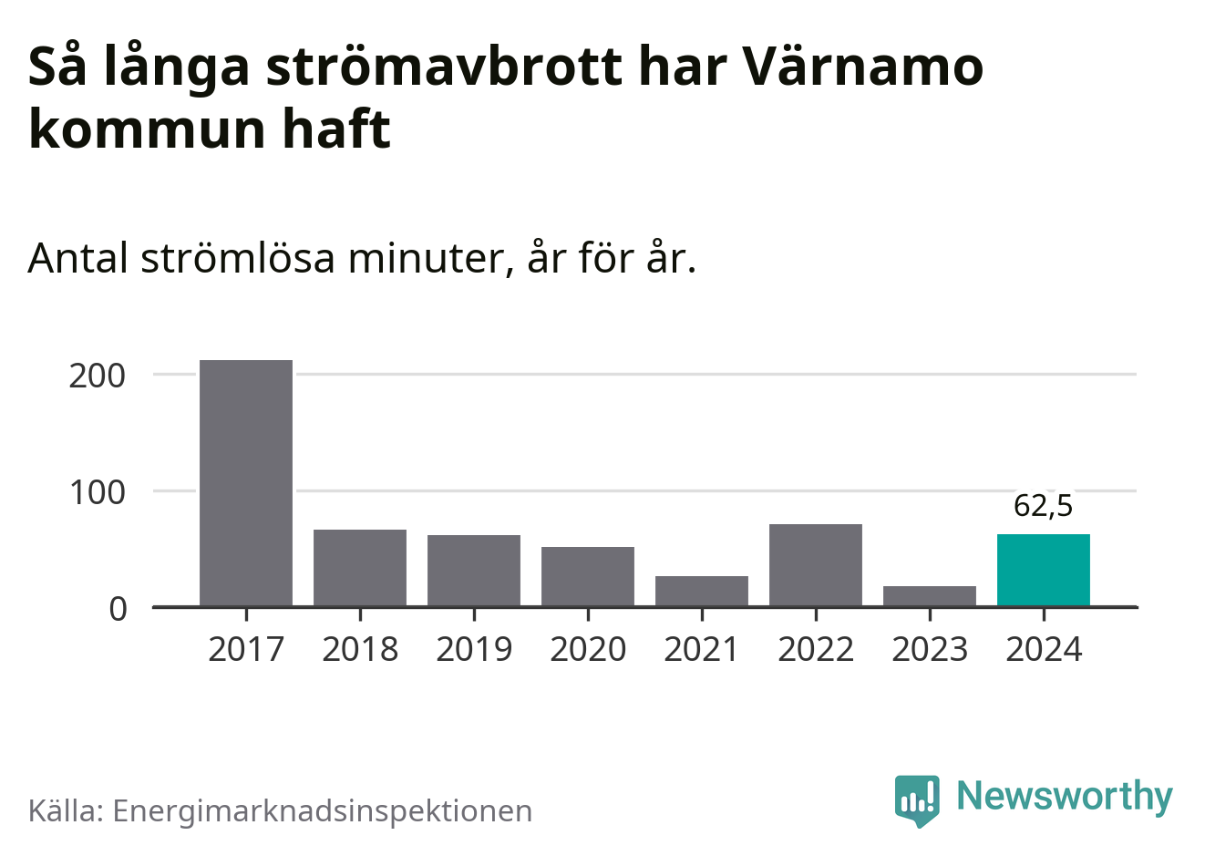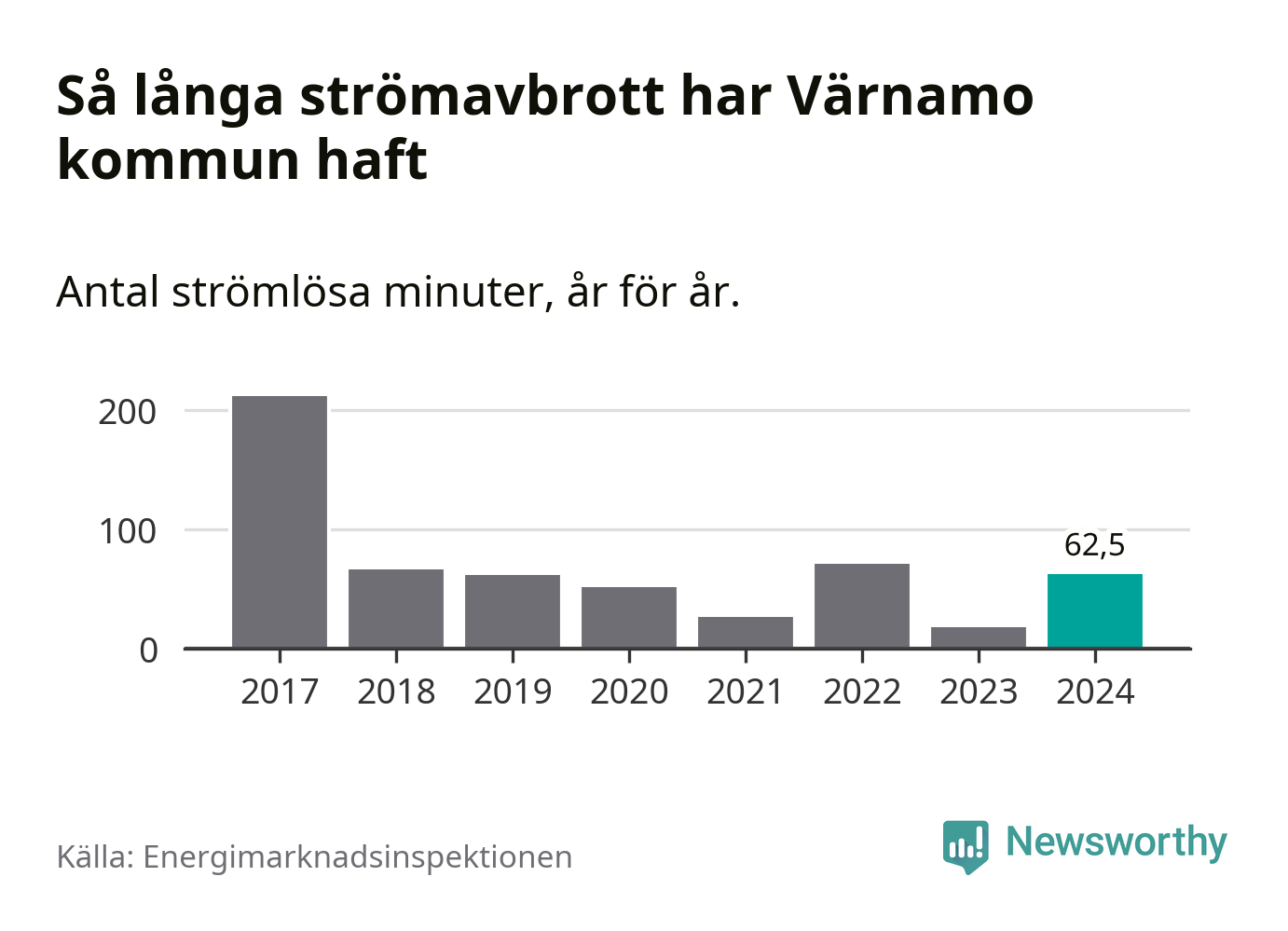 Antalet strömavbrott och total strömlös tid varierar från år till år i Värnamo kommun. Mest tid utan ström (i alla fall under perioden 2017–2024) fick Värnamoborna genomleva under 2017 – tre timmar och 32 minuter. Det är två timmar och 30 minuter längre än under ett normalår.