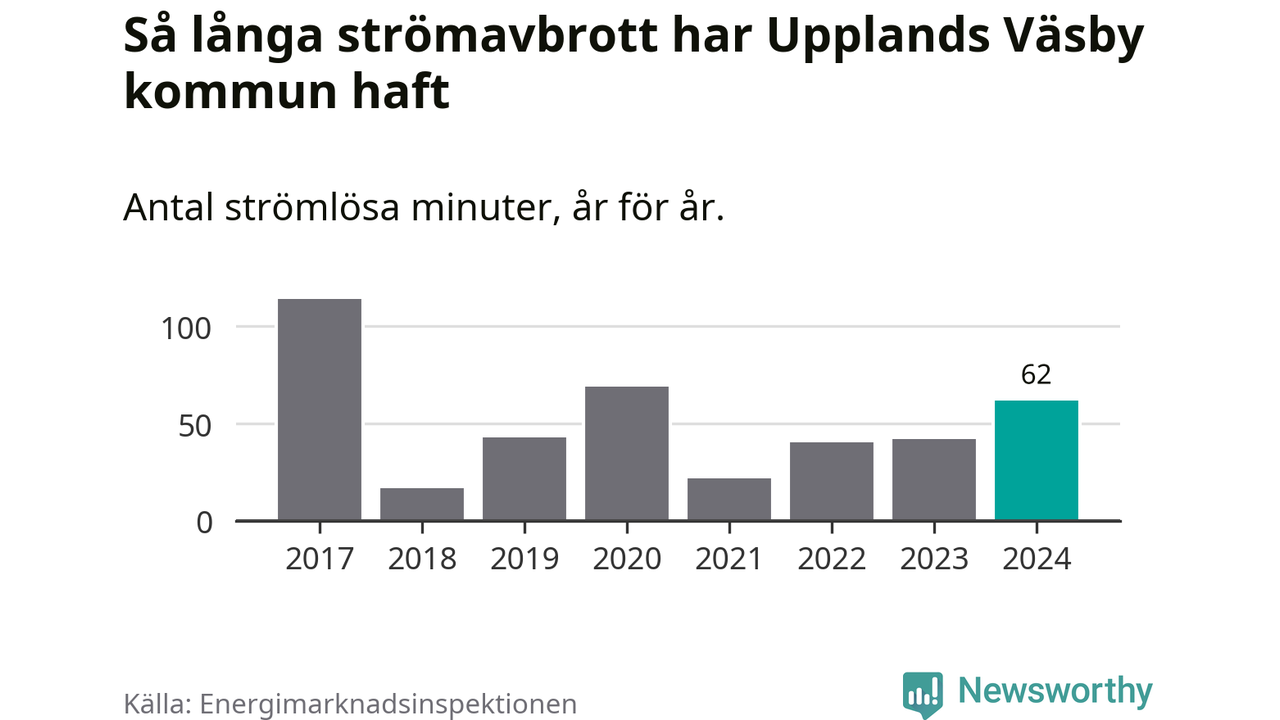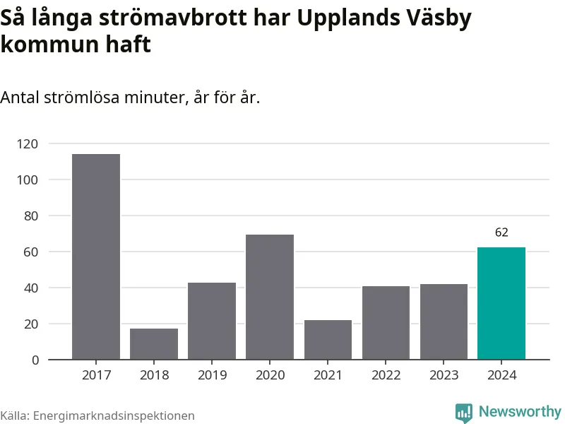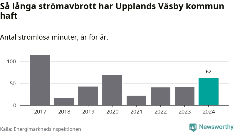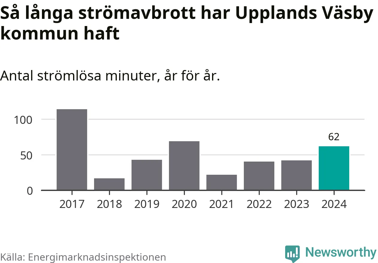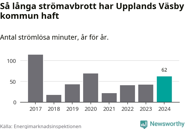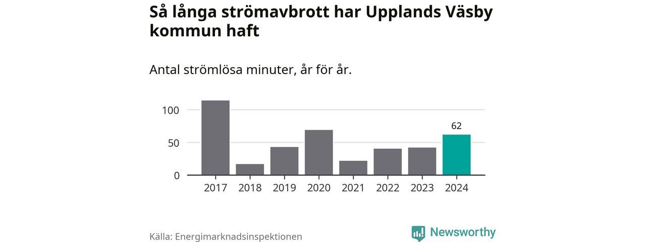 Antalet strömavbrott och total strömlös tid varierar något från år till år i Upplands Väsby kommun. Mest tid utan ström (i alla fall under perioden 2017–2024) fick Väsbyborna genomleva under 2017 – en timme och 54 minuter. Det är en timme och tolv minuter längre än under ett normalår.