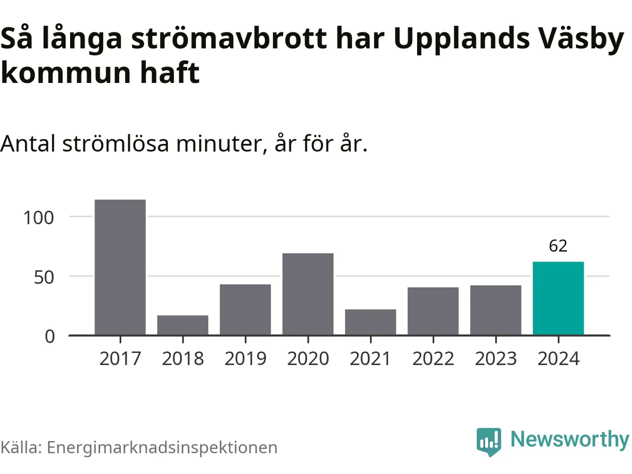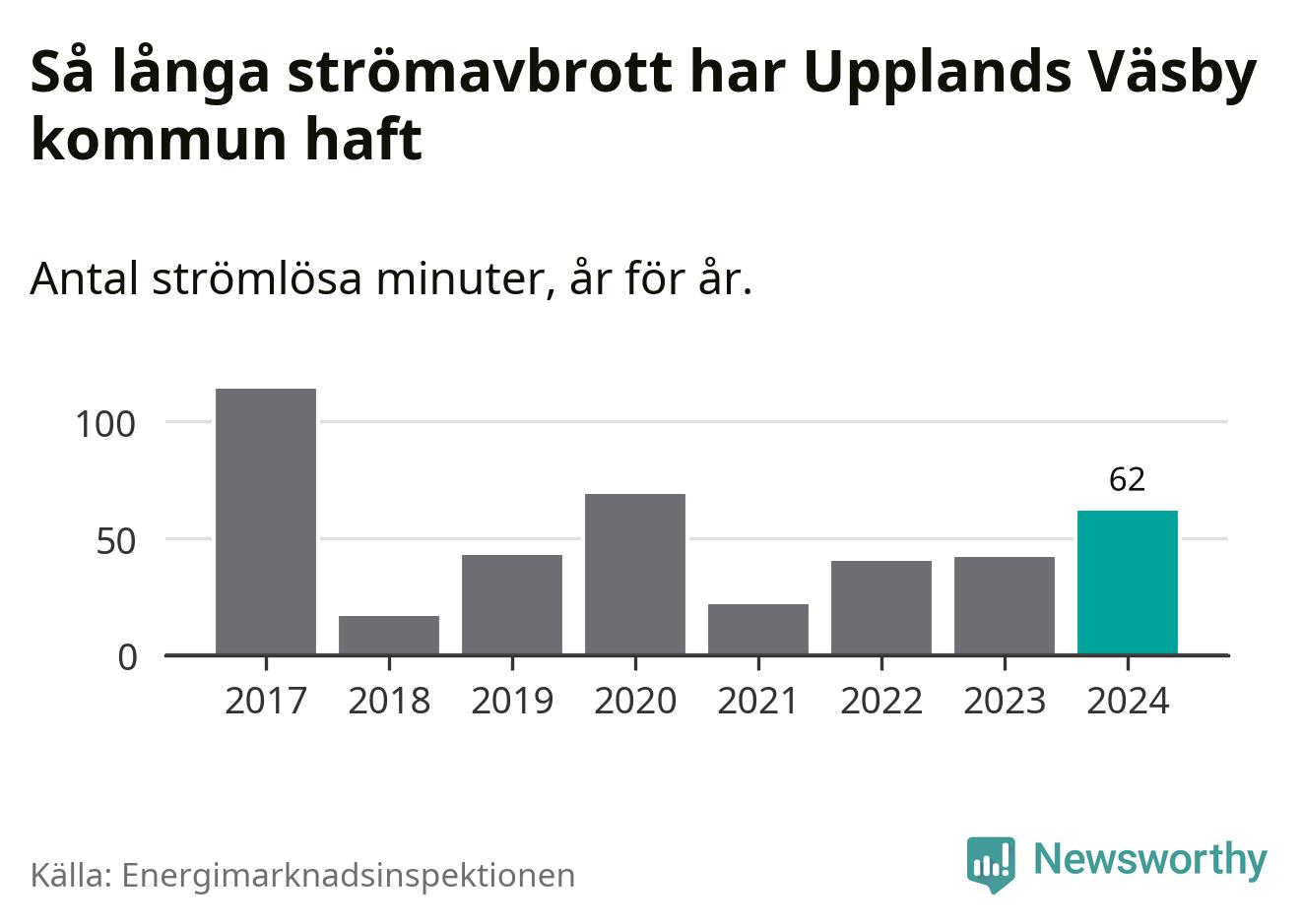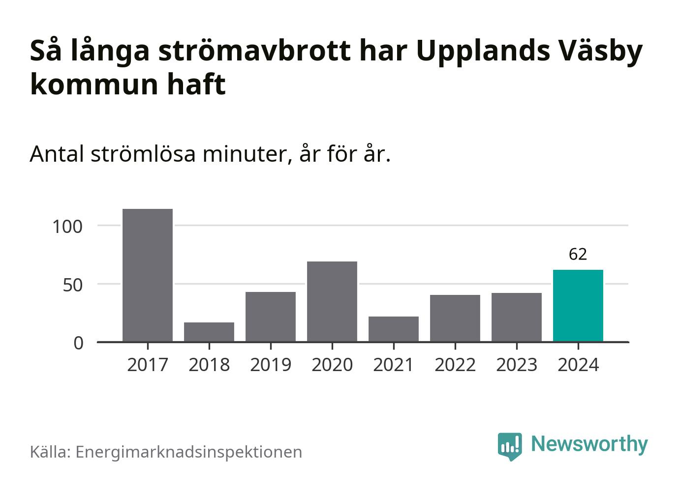 Antalet strömavbrott och total strömlös tid varierar något från år till år i Upplands Väsby kommun. Mest tid utan ström (i alla fall under perioden 2017–2024) fick Väsbyborna genomleva under 2017 – en timme och 54 minuter. Det är en timme och tolv minuter längre än under ett normalår.