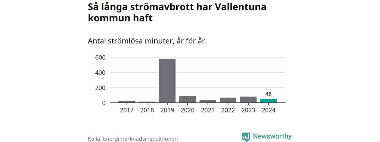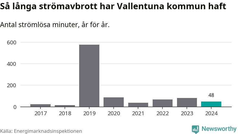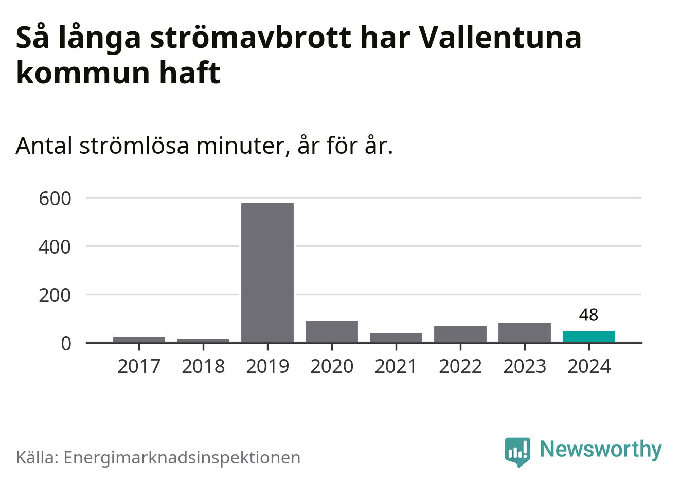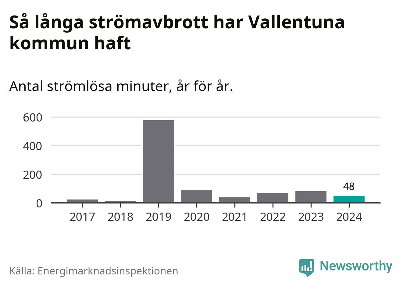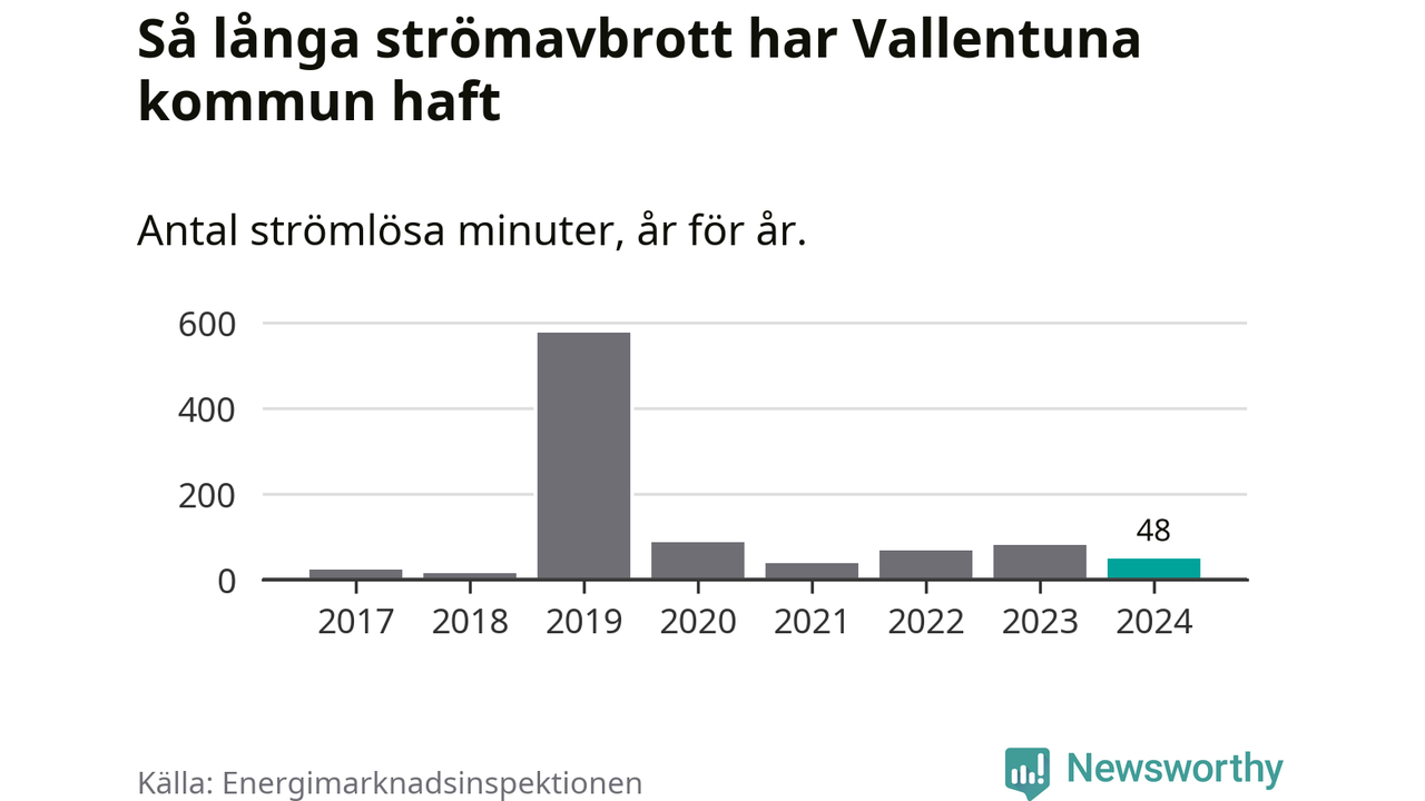 Antalet strömavbrott och total strömlös tid varierar från år till år i Vallentuna kommun. Mest tid utan ström (i alla fall under perioden 2017–2024) fick Vallentunaborna genomleva under 2019 – nio timmar och 37 minuter. Det är ungefär lika lång tid som det tar att se hela ”Sagan om ringen"-filmtrilogin.