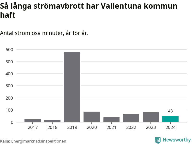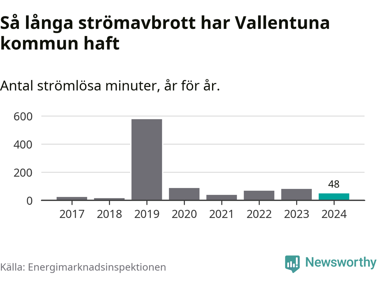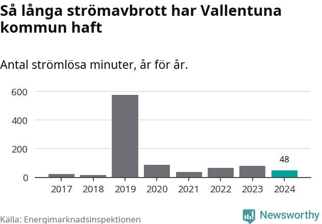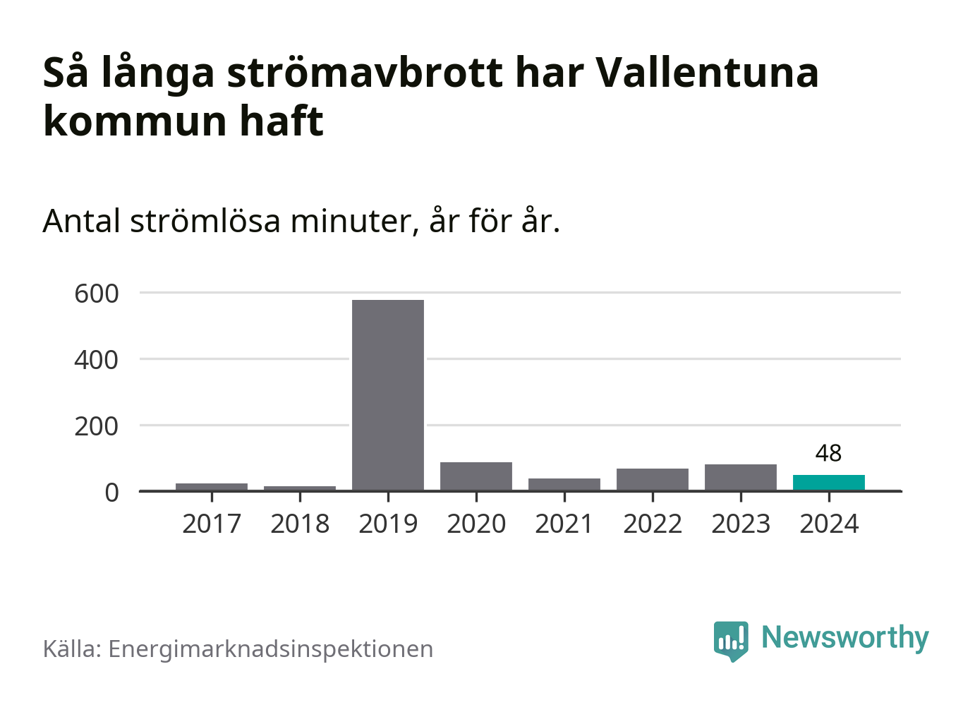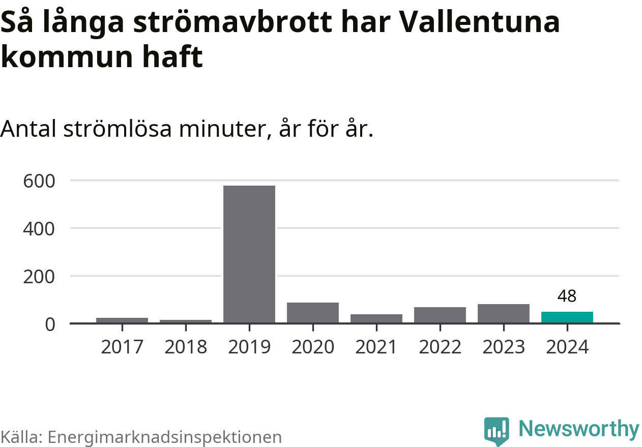 Antalet strömavbrott och total strömlös tid varierar från år till år i Vallentuna kommun. Mest tid utan ström (i alla fall under perioden 2017–2024) fick Vallentunaborna genomleva under 2019 – nio timmar och 37 minuter. Det är ungefär lika lång tid som det tar att se hela ”Sagan om ringen"-filmtrilogin.