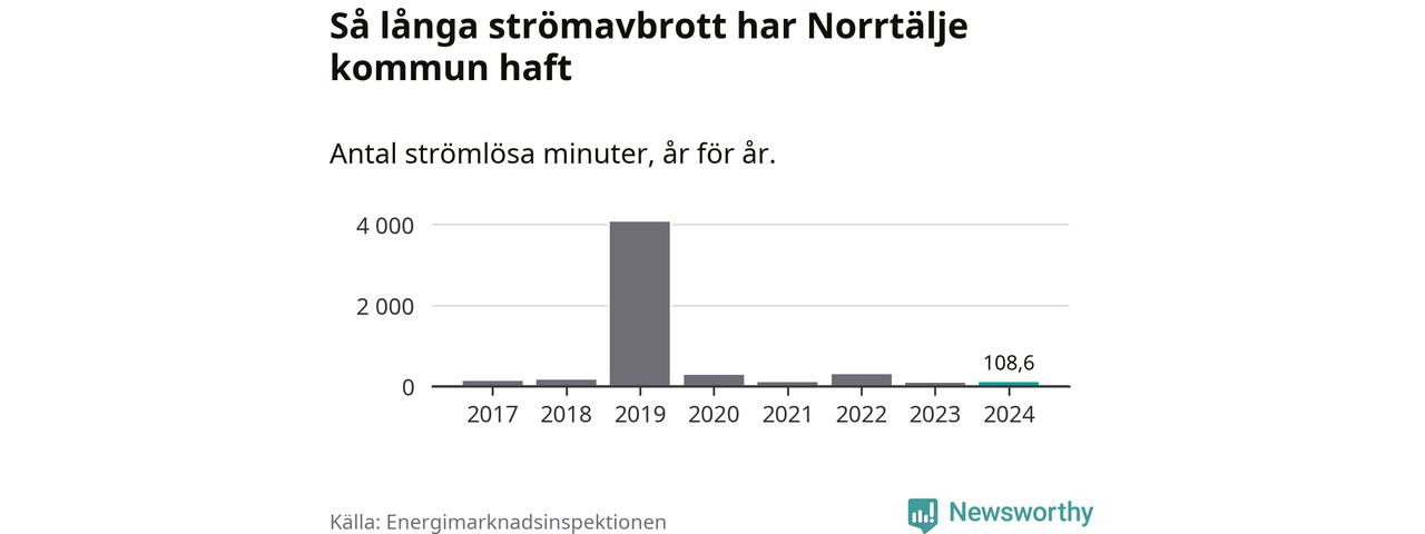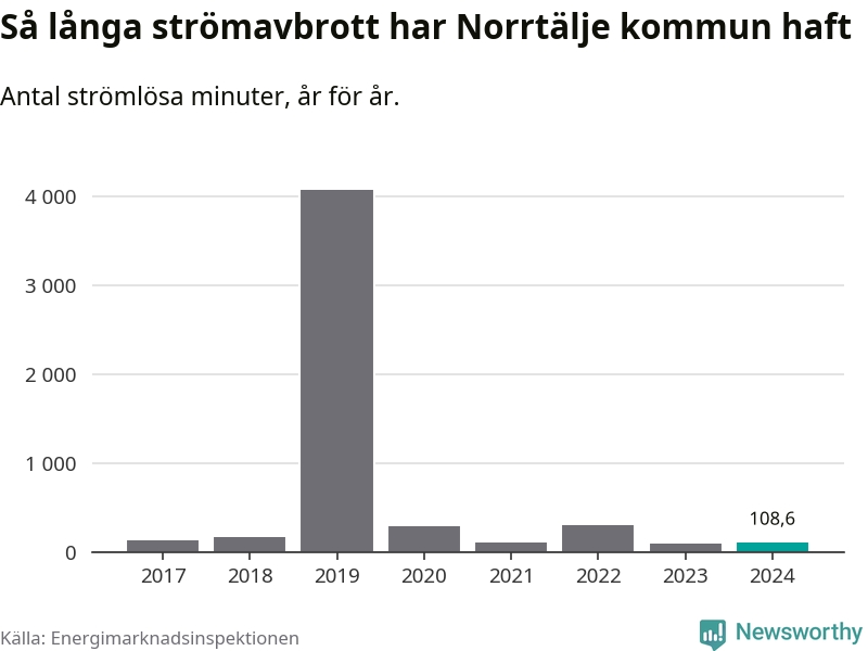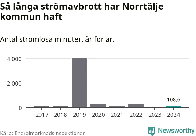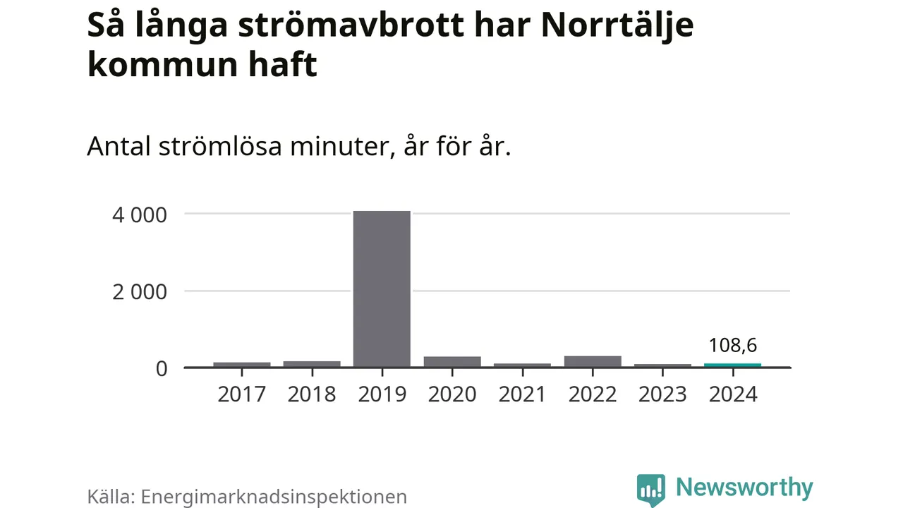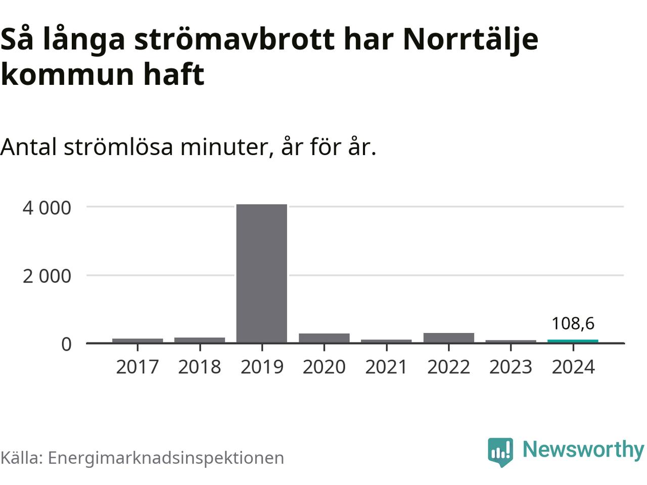 Antalet strömavbrott och total strömlös tid varierar från år till år i Norrtälje kommun. Mest tid utan ström (i alla fall under perioden 2017–2024) fick Norrtäljeborna genomleva under 2019 – 67 timmar och 49 minuter. Det är nästan lika lång tid som det tar att se alla säsonger av serien ”Game of thrones”