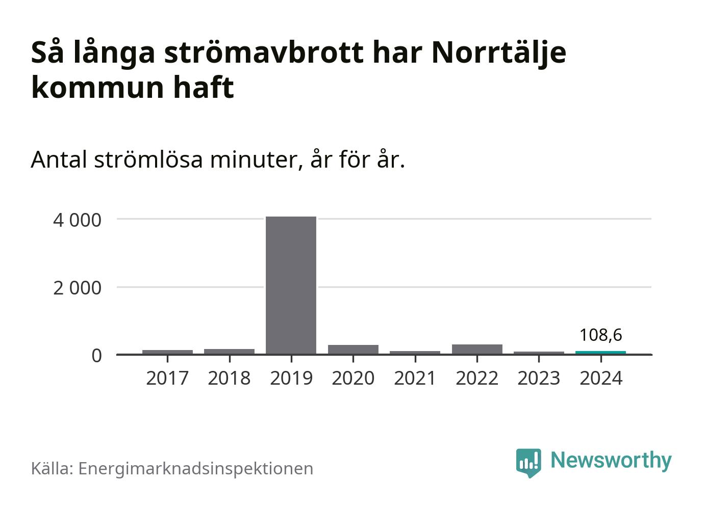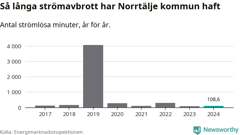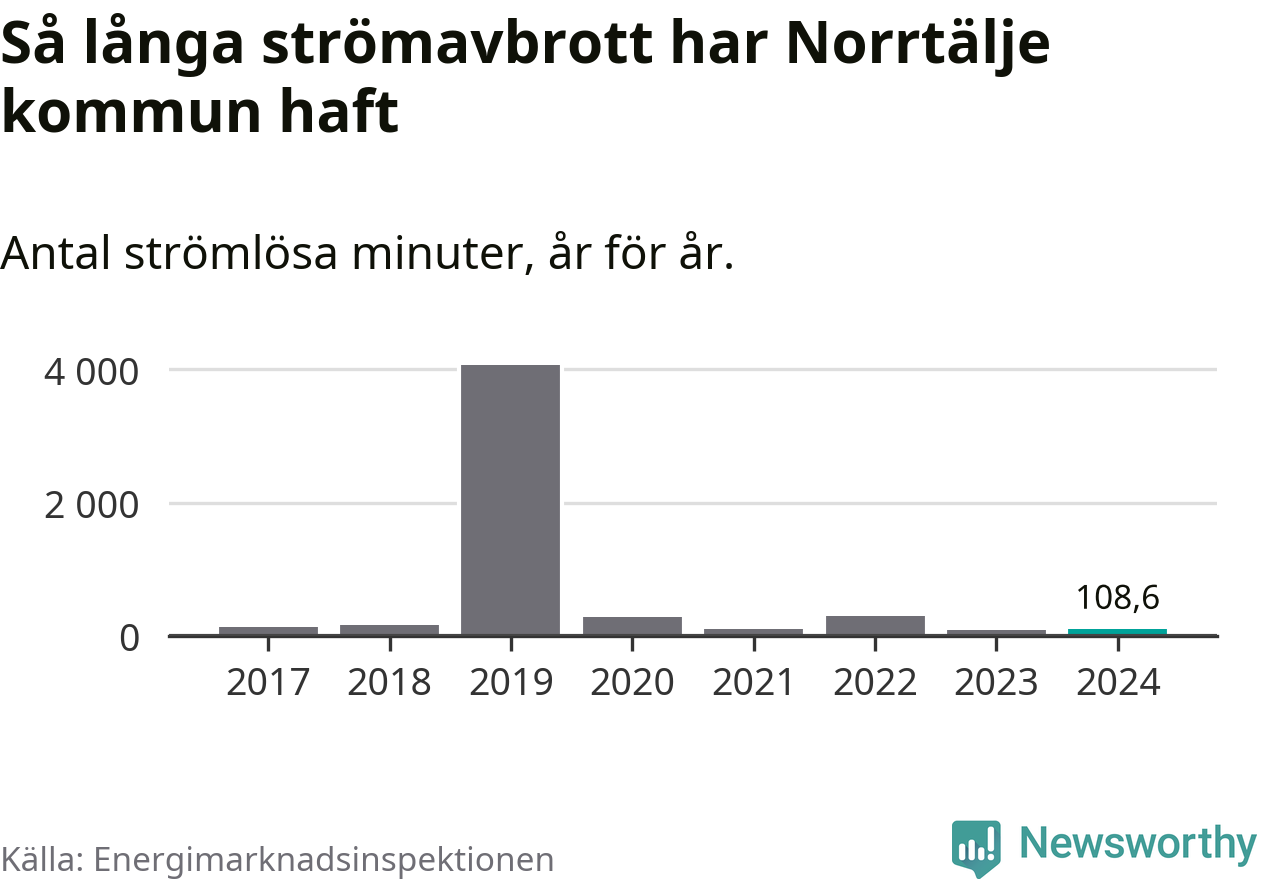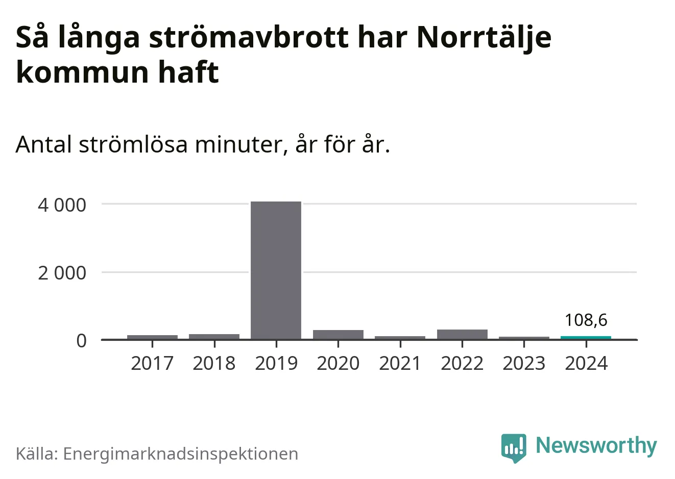 Antalet strömavbrott och total strömlös tid varierar från år till år i Norrtälje kommun. Mest tid utan ström (i alla fall under perioden 2017–2024) fick Norrtäljeborna genomleva under 2019 – 67 timmar och 49 minuter. Det är nästan lika lång tid som det tar att se alla säsonger av serien ”Game of thrones”