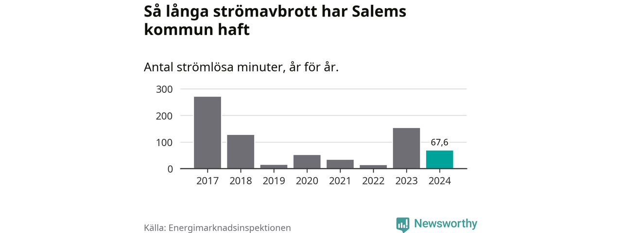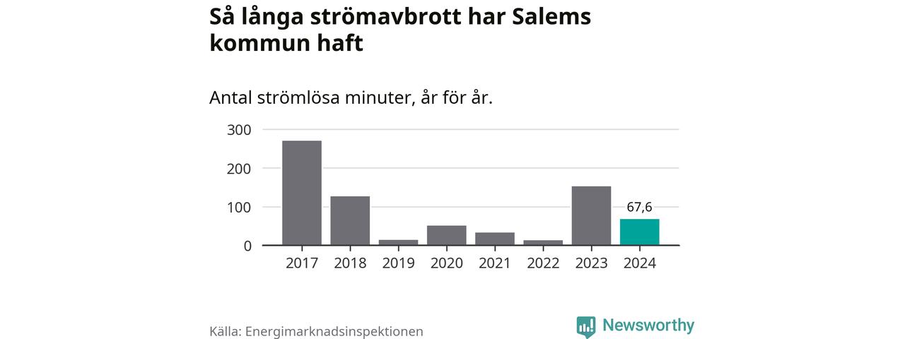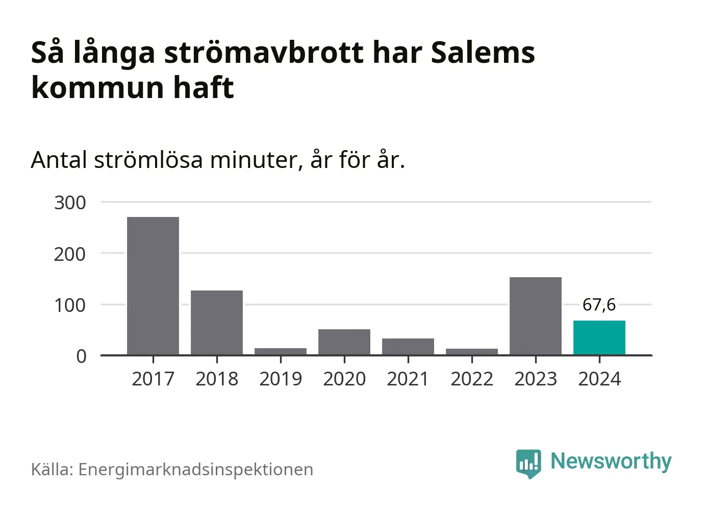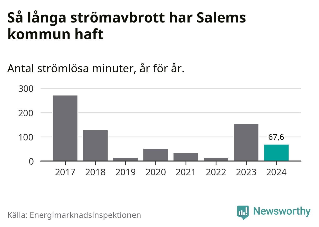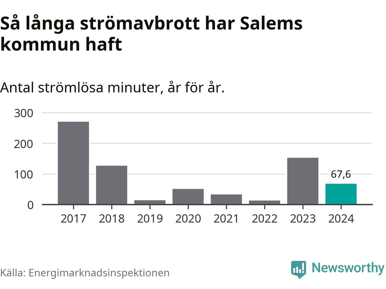 Antalet strömavbrott och total strömlös tid varierar från år till år i Salems kommun. Mest tid utan ström (i alla fall under perioden 2017–2024) fick Salemborna genomleva under 2017 – fyra timmar och 30 minuter. Det är tre timmar och 31 minuter längre än under ett normalår.