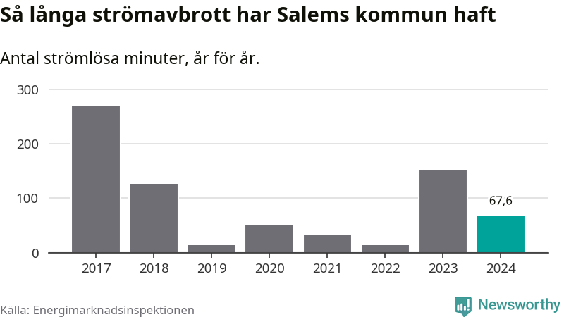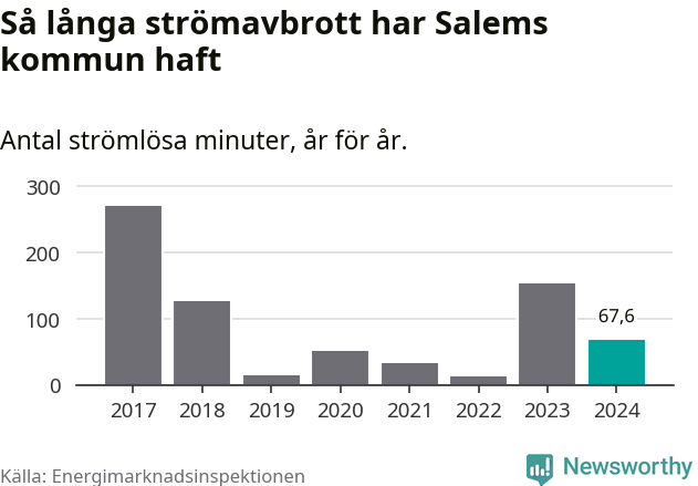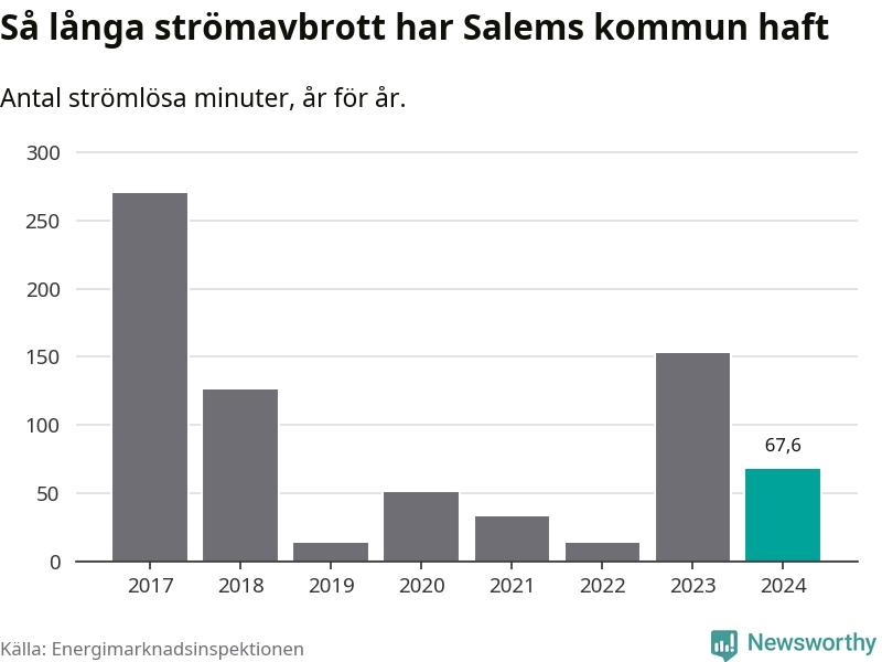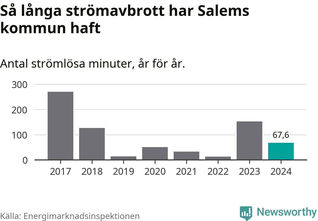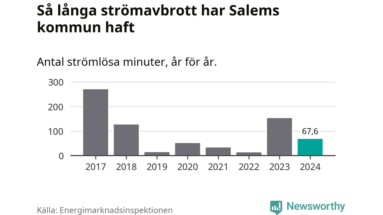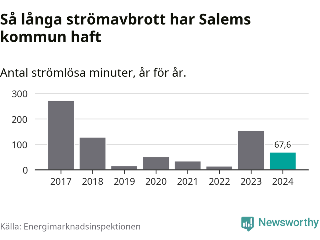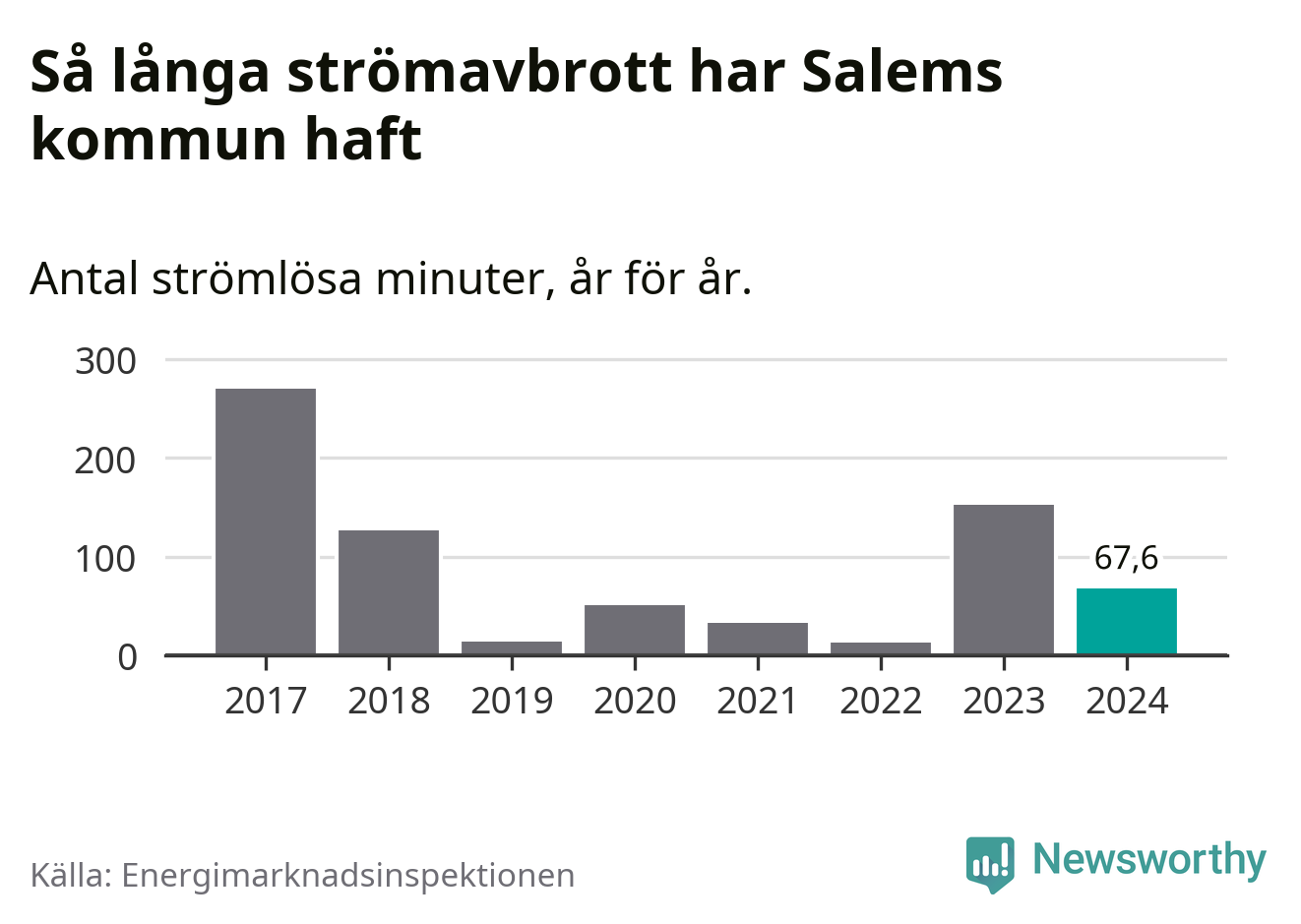 Antalet strömavbrott och total strömlös tid varierar från år till år i Salems kommun. Mest tid utan ström (i alla fall under perioden 2017–2024) fick Salemborna genomleva under 2017 – fyra timmar och 30 minuter. Det är tre timmar och 31 minuter längre än under ett normalår.