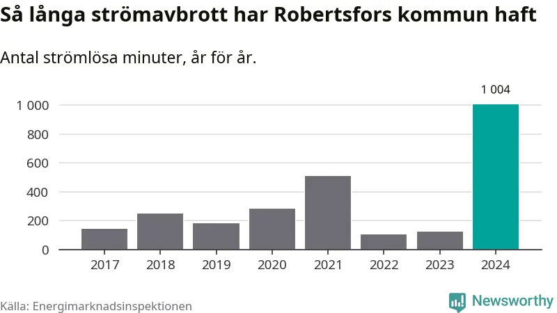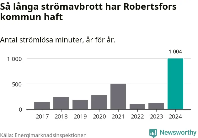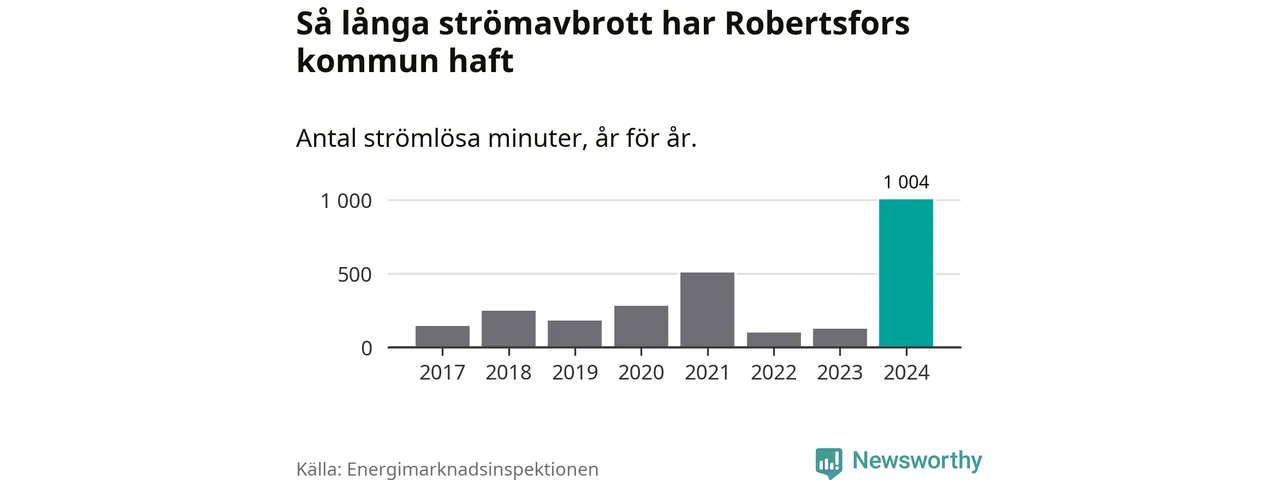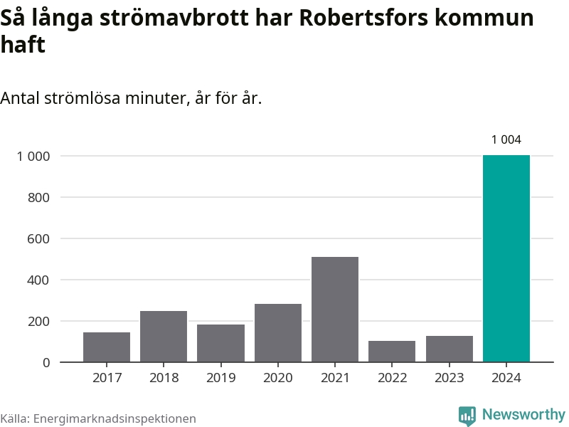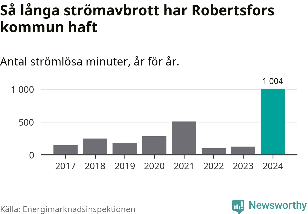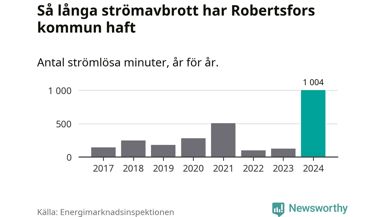 Antalet strömavbrott och total strömlös tid varierar från år till år i Robertsfors kommun. Mest tid utan ström (i alla fall under perioden 2017–2024) fick Robertsforsborna genomleva under 2024 – 16 timmar och 44 minuter. Det är 13 timmar och elva minuter längre än under ett normalår.