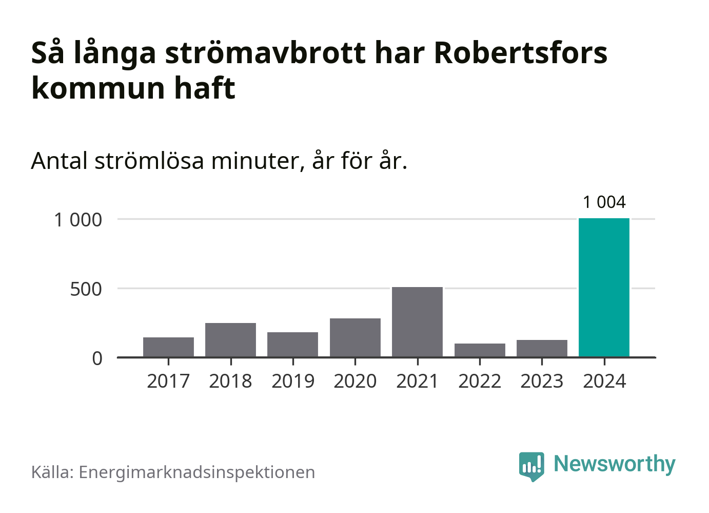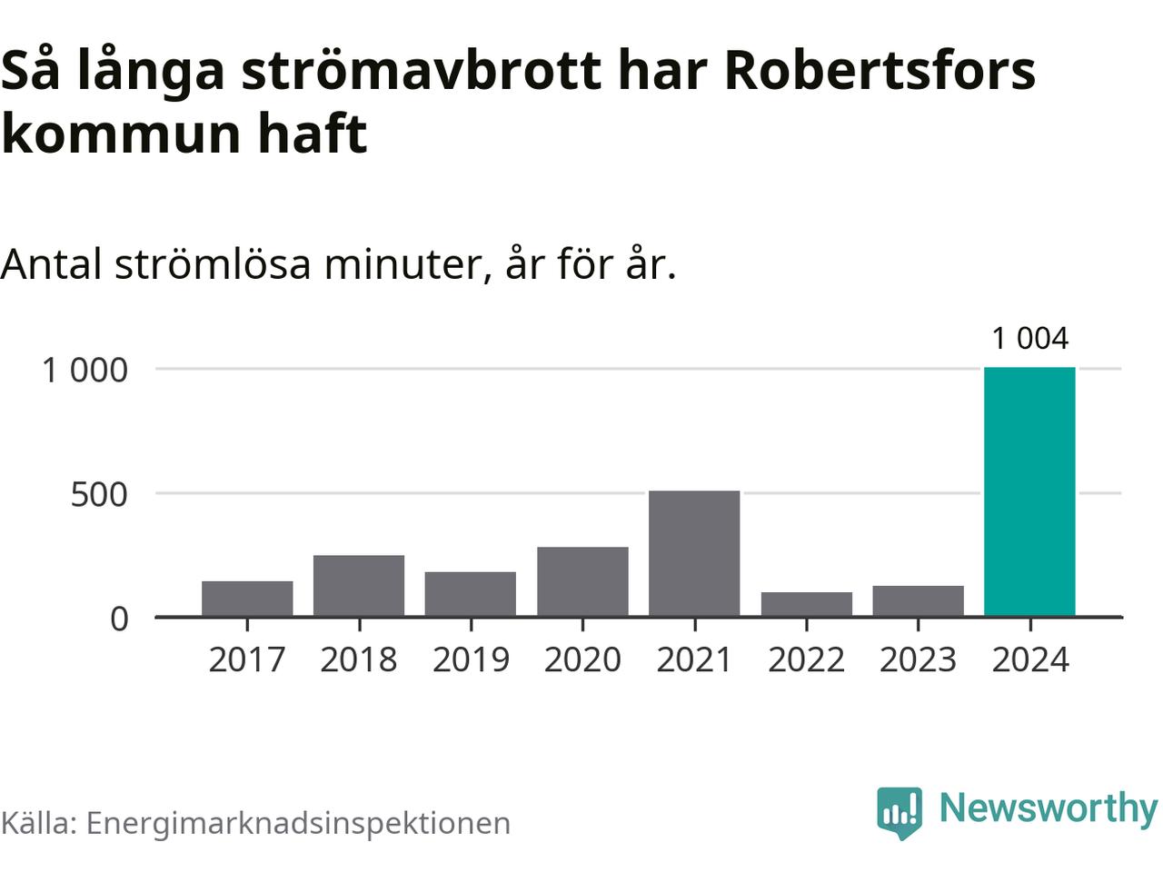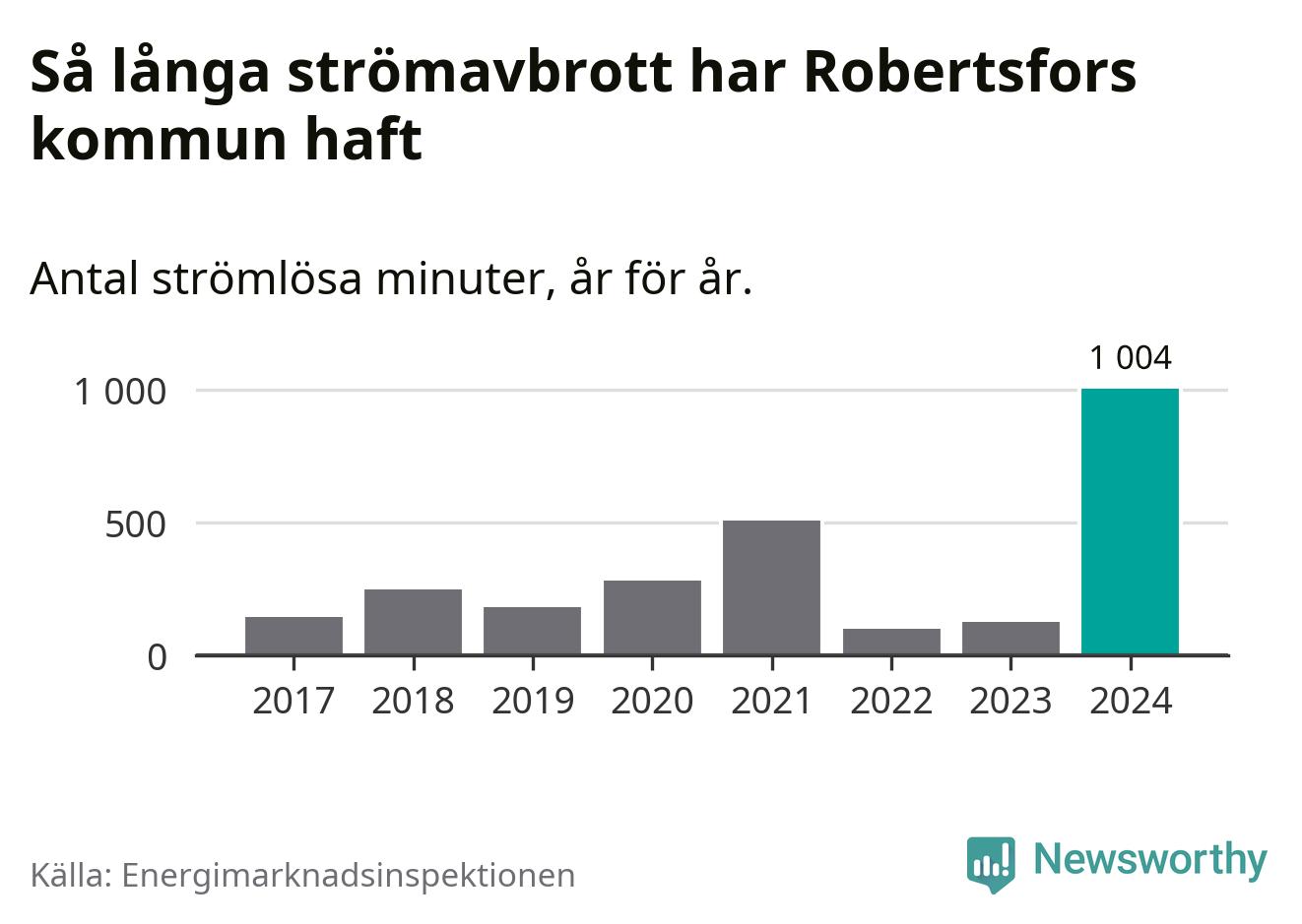 Antalet strömavbrott och total strömlös tid varierar från år till år i Robertsfors kommun. Mest tid utan ström (i alla fall under perioden 2017–2024) fick Robertsforsborna genomleva under 2024 – 16 timmar och 44 minuter. Det är 13 timmar och elva minuter längre än under ett normalår.