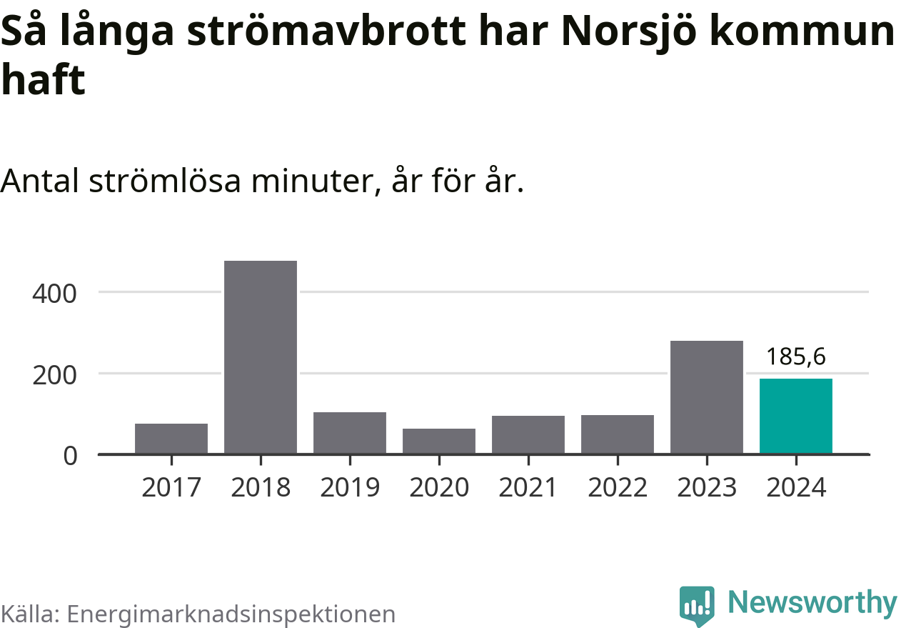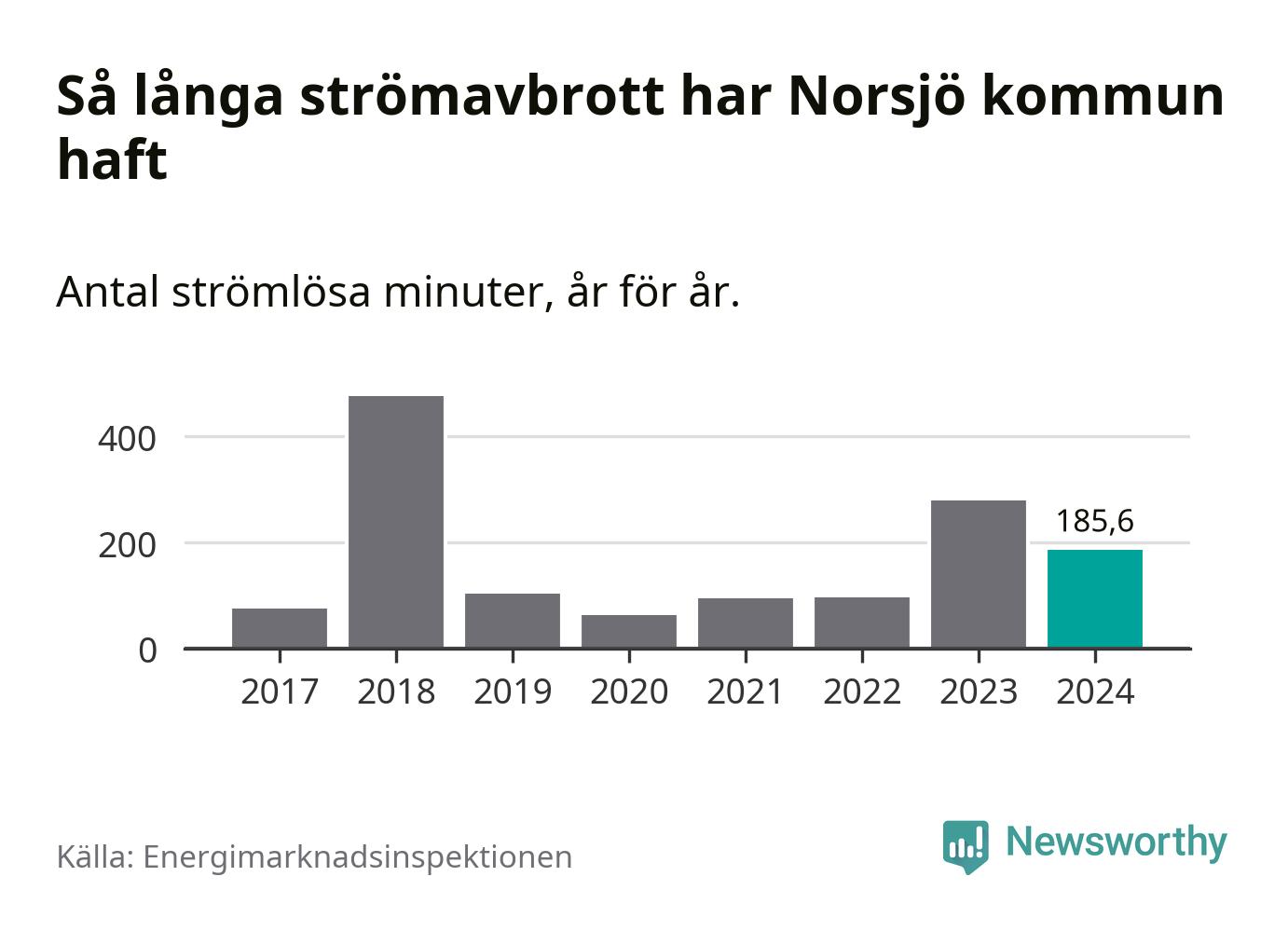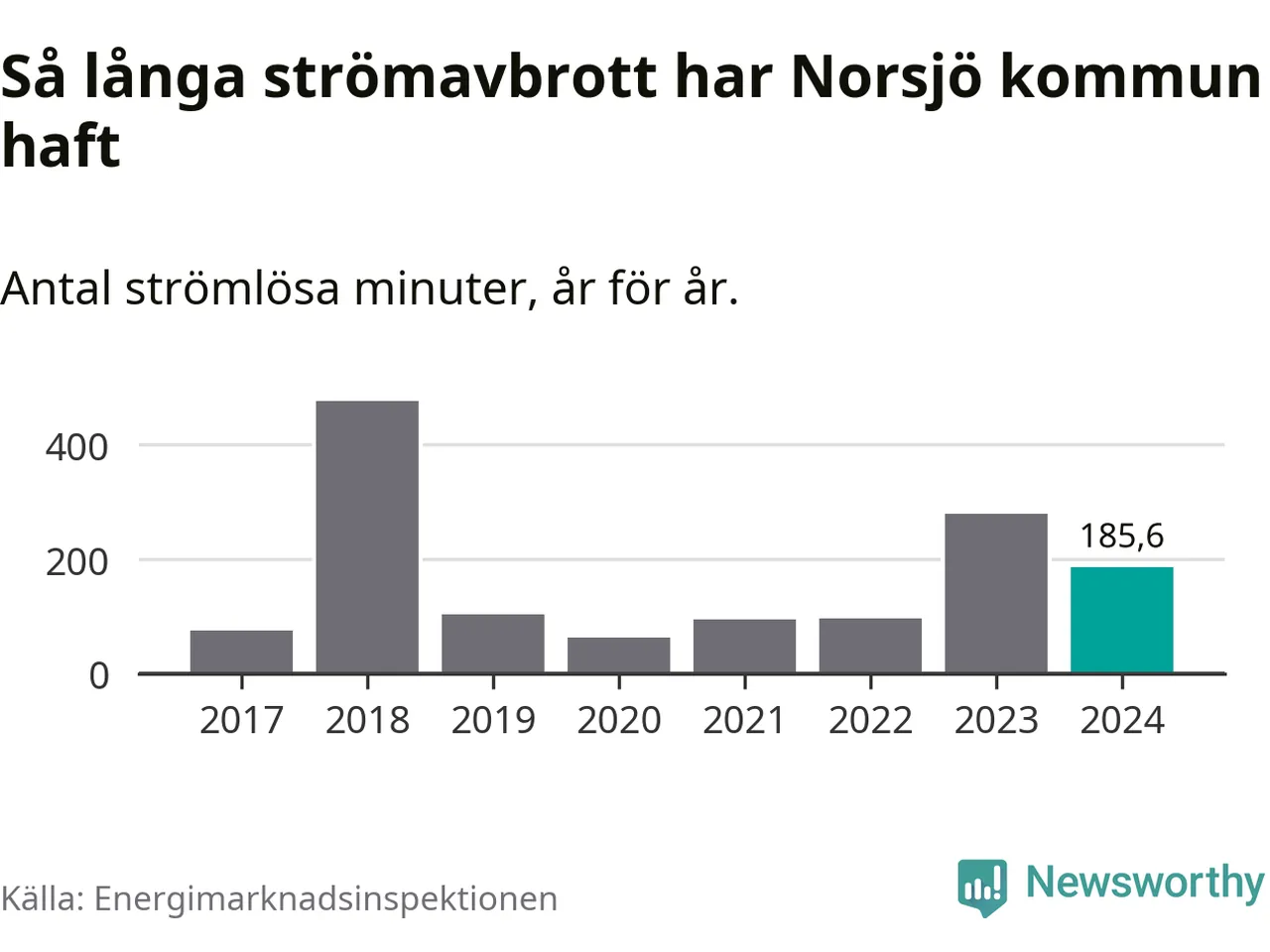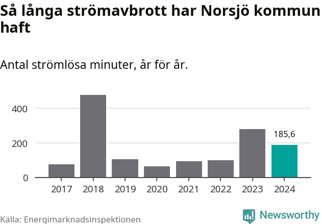 Antalet strömavbrott och total strömlös tid varierar från år till år i Norsjö kommun. Mest tid utan ström (i alla fall under perioden 2017–2024) fick Norsjöborna genomleva under 2018 – sju timmar och 56 minuter. Det är ungefär lika lång tid som det tar att se hela ”The Hobbit”-trilogin.