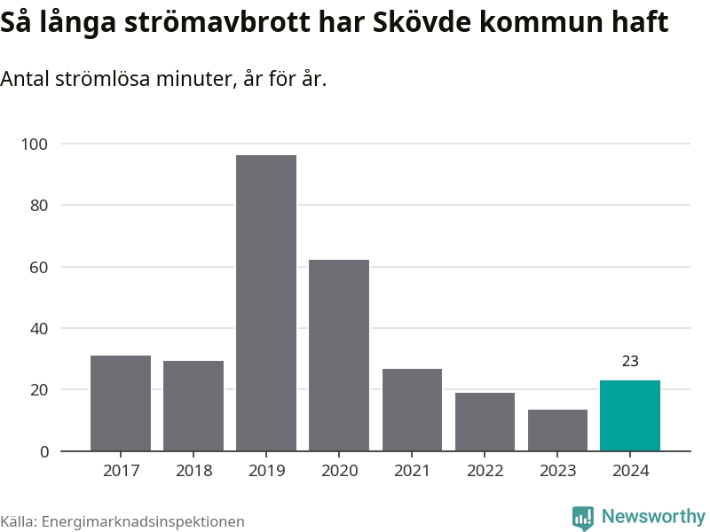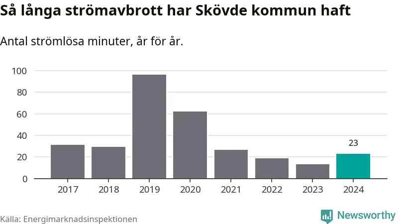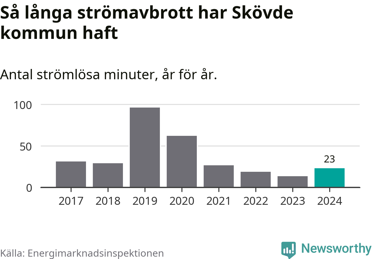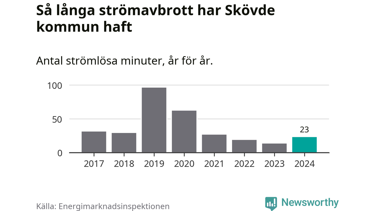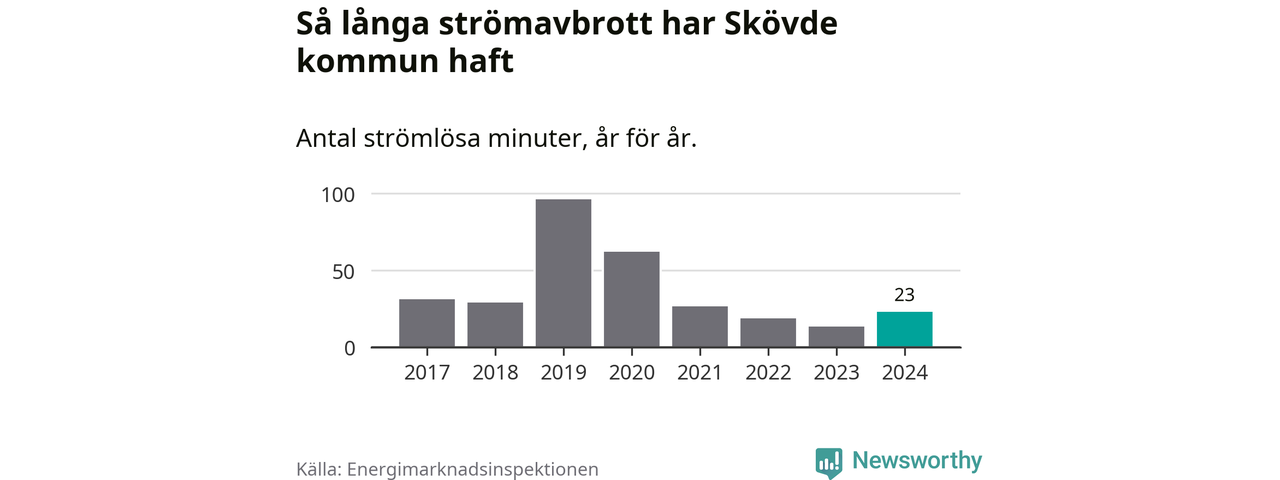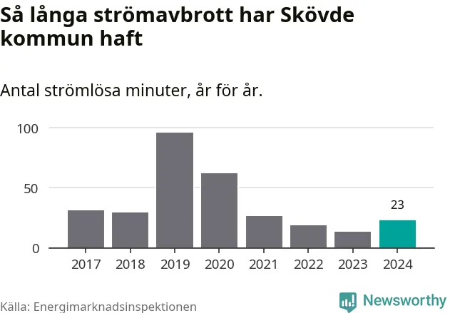 Antalet strömavbrott och total strömlös tid varierar något från år till år i Skövde kommun. Mest tid utan ström (i alla fall under perioden 2017–2024) fick Skövdeborna genomleva under 2019 – en timme och 36 minuter. Det är en timme och åtta minuter längre än under ett normalår.