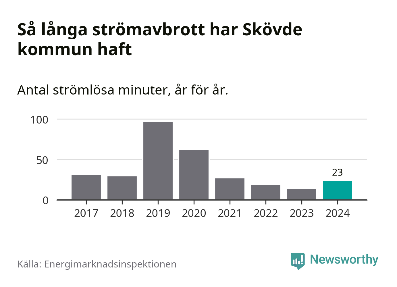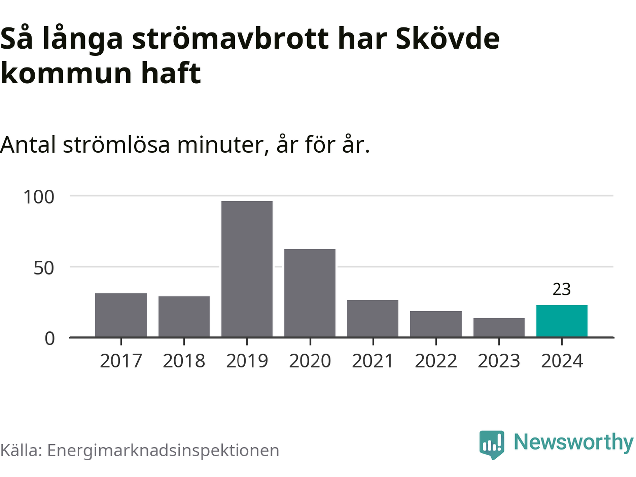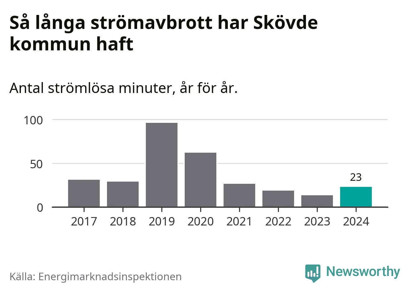 Antalet strömavbrott och total strömlös tid varierar något från år till år i Skövde kommun. Mest tid utan ström (i alla fall under perioden 2017–2024) fick Skövdeborna genomleva under 2019 – en timme och 36 minuter. Det är en timme och åtta minuter längre än under ett normalår.