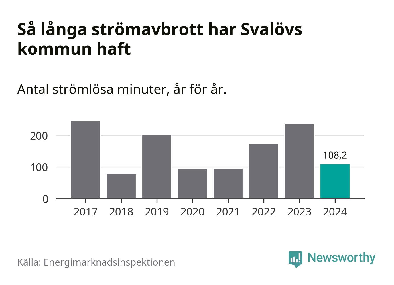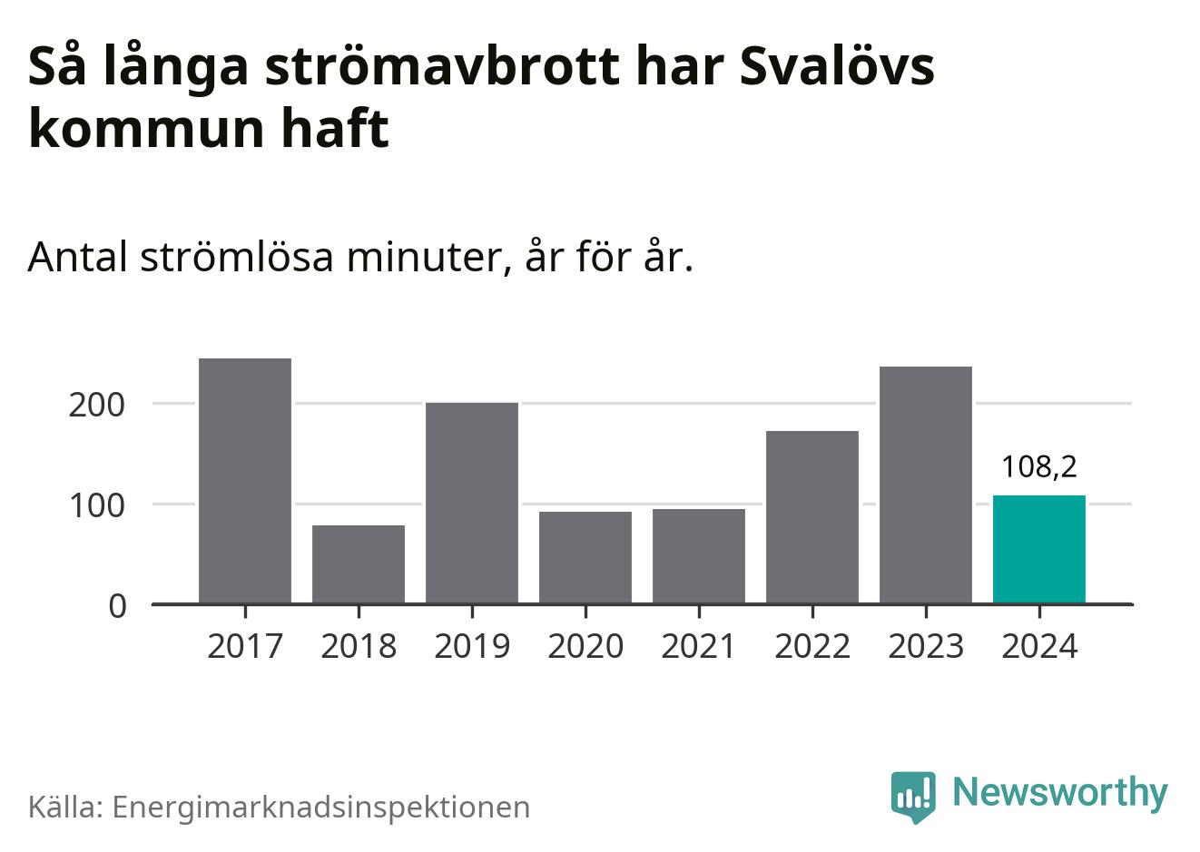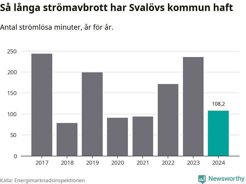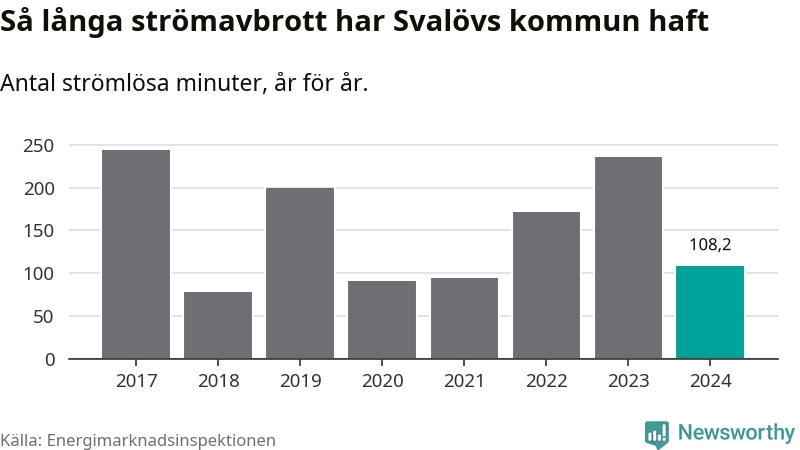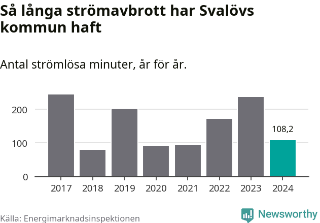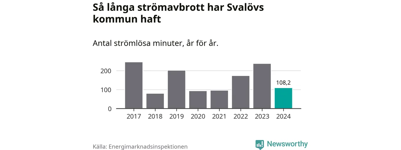 Antalet strömavbrott och total strömlös tid varierar något från år till år i Svalövs kommun. Mest tid utan ström (i alla fall under perioden 2017–2024) fick Svalövsborna genomleva under 2017 – fyra timmar och fyra minuter. Det är en timme och 44 minuter längre än under ett normalår.