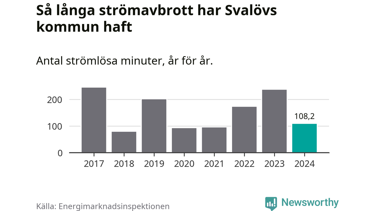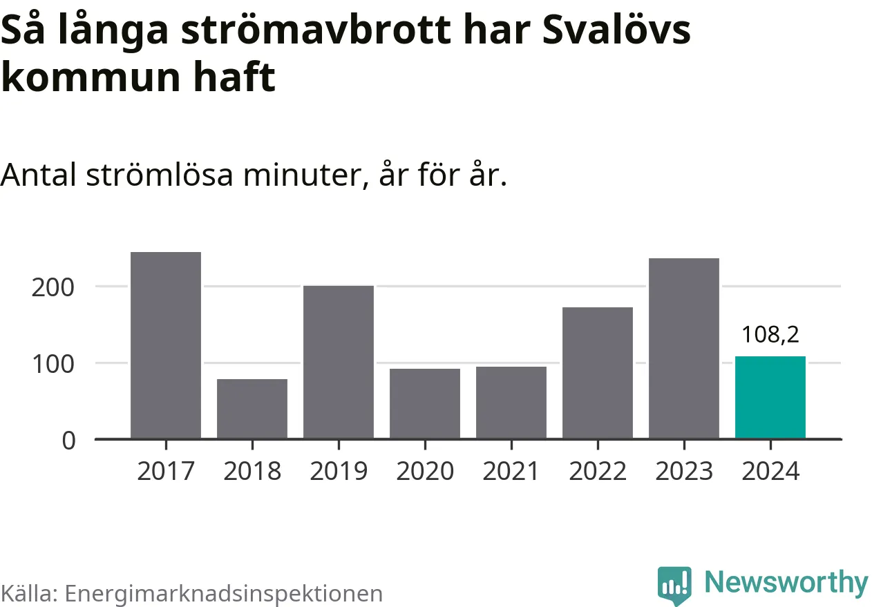 Hushåll i Sverige kan drabbas av högst tre långa, oaviserade strömavbrott för att leveranskvaliteten ska anses vara god, enligt Energimarknadsinspektionen. Normalt är det omkring tolv procent av hushållen i Svalöv som inte uppnår det kravet. År 2023 var det så många som 41 procent som hade minst fyra långa strömavbrott.