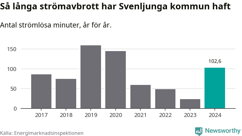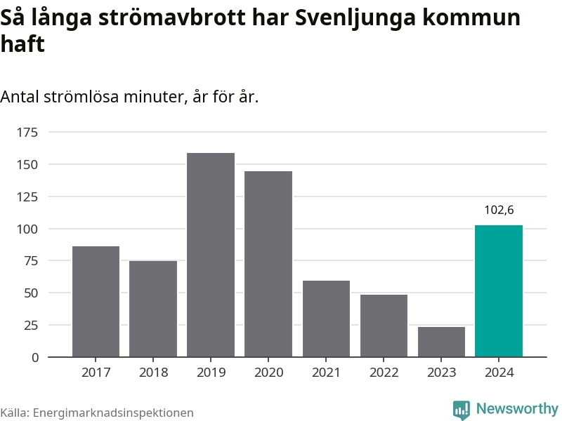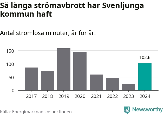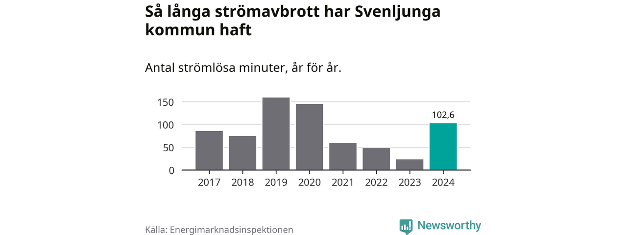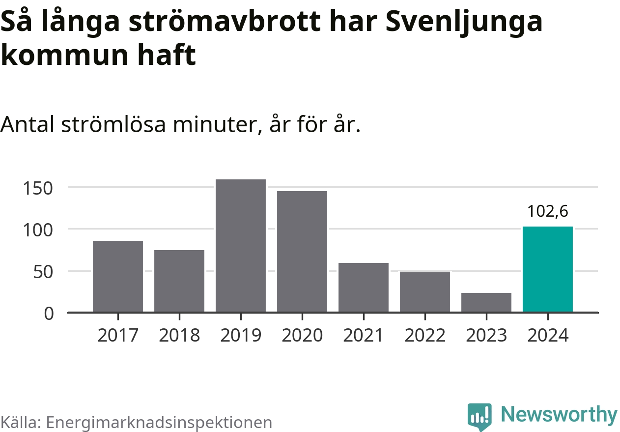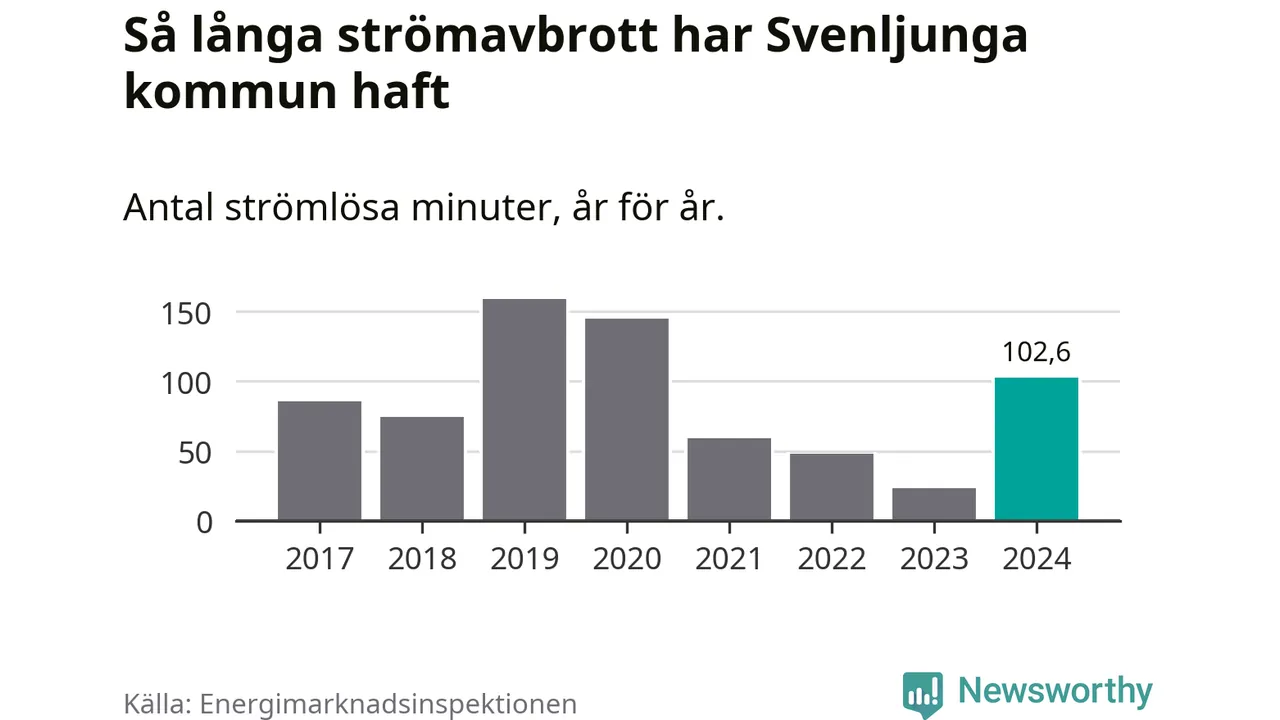 Antalet strömavbrott och total strömlös tid varierar något från år till år i Svenljunga kommun. Mest tid utan ström (i alla fall under perioden 2017–2024) fick Svenljungaborna genomleva under 2019 – två timmar och 39 minuter. Det är en timme och 19 minuter längre än under ett normalår.