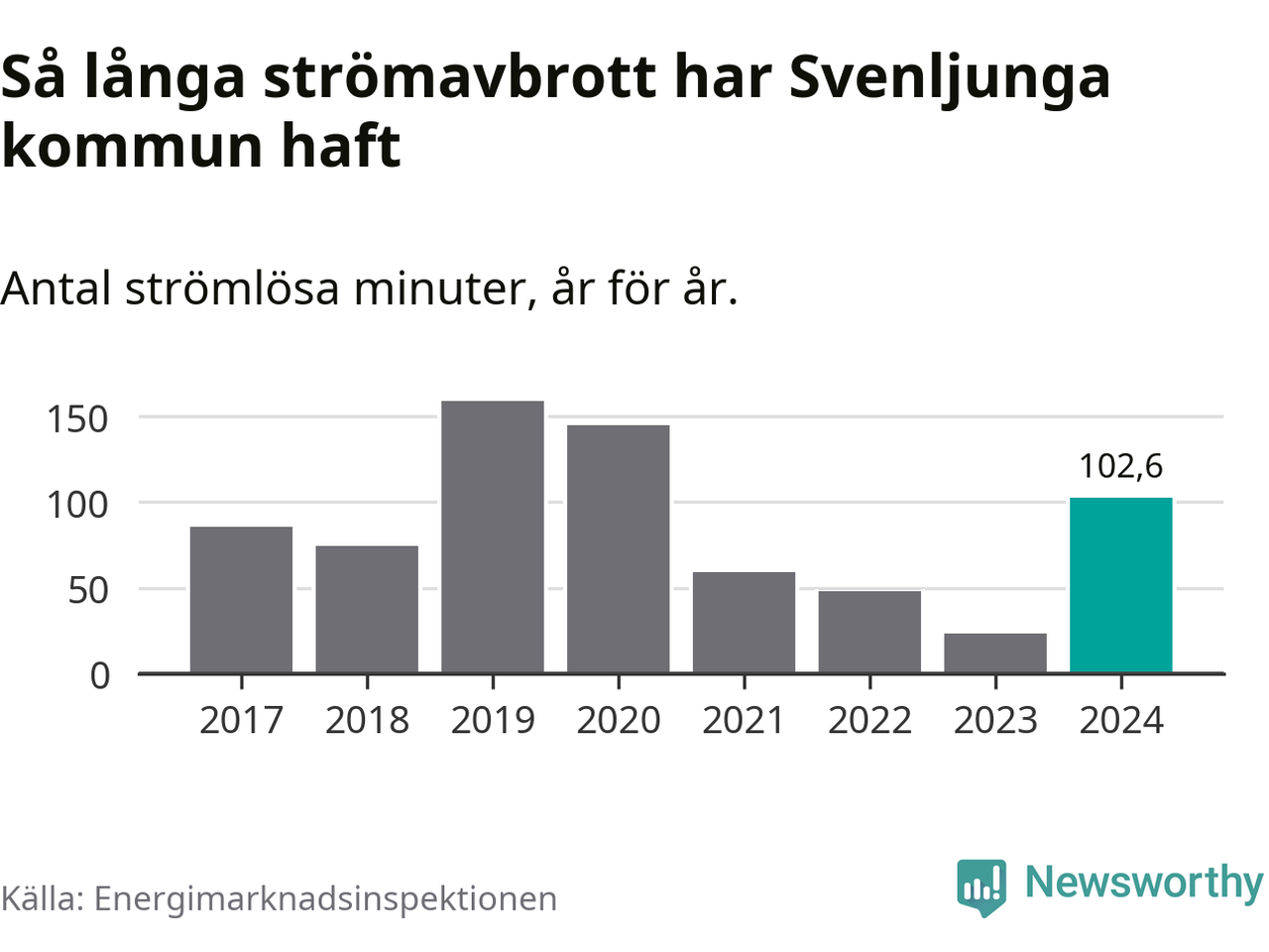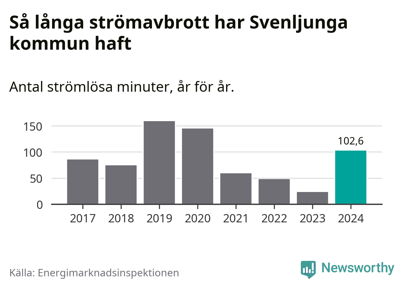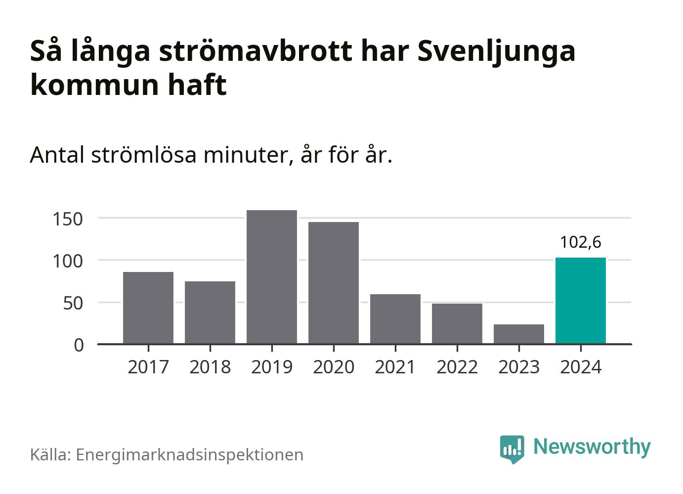 Antalet strömavbrott och total strömlös tid varierar något från år till år i Svenljunga kommun. Mest tid utan ström (i alla fall under perioden 2017–2024) fick Svenljungaborna genomleva under 2019 – två timmar och 39 minuter. Det är en timme och 19 minuter längre än under ett normalår.