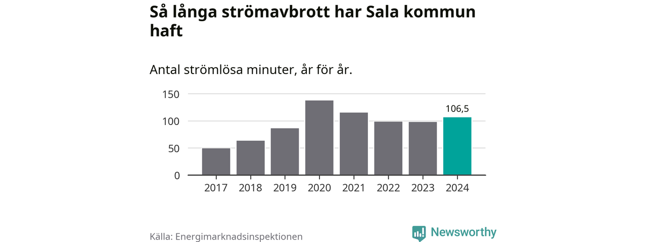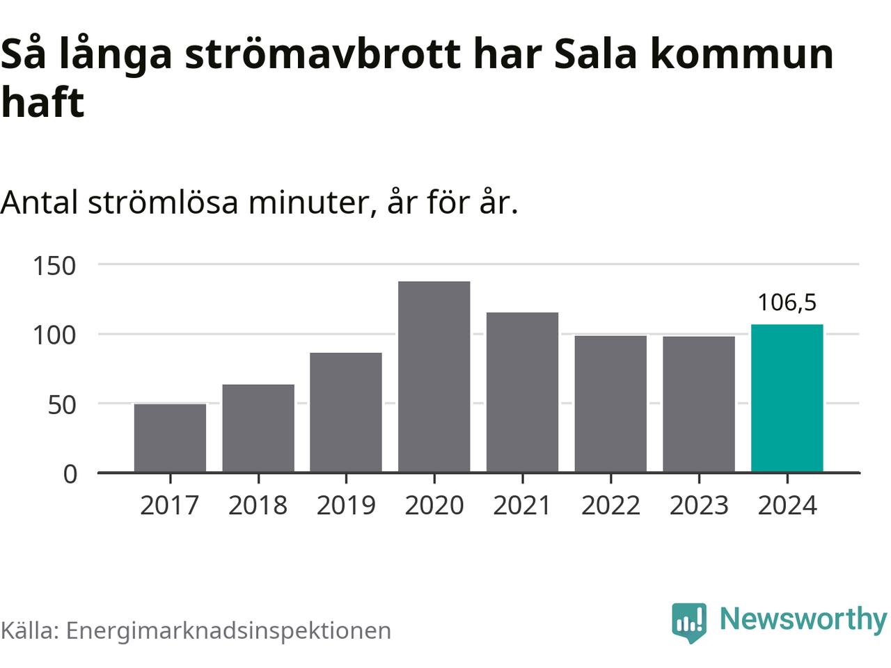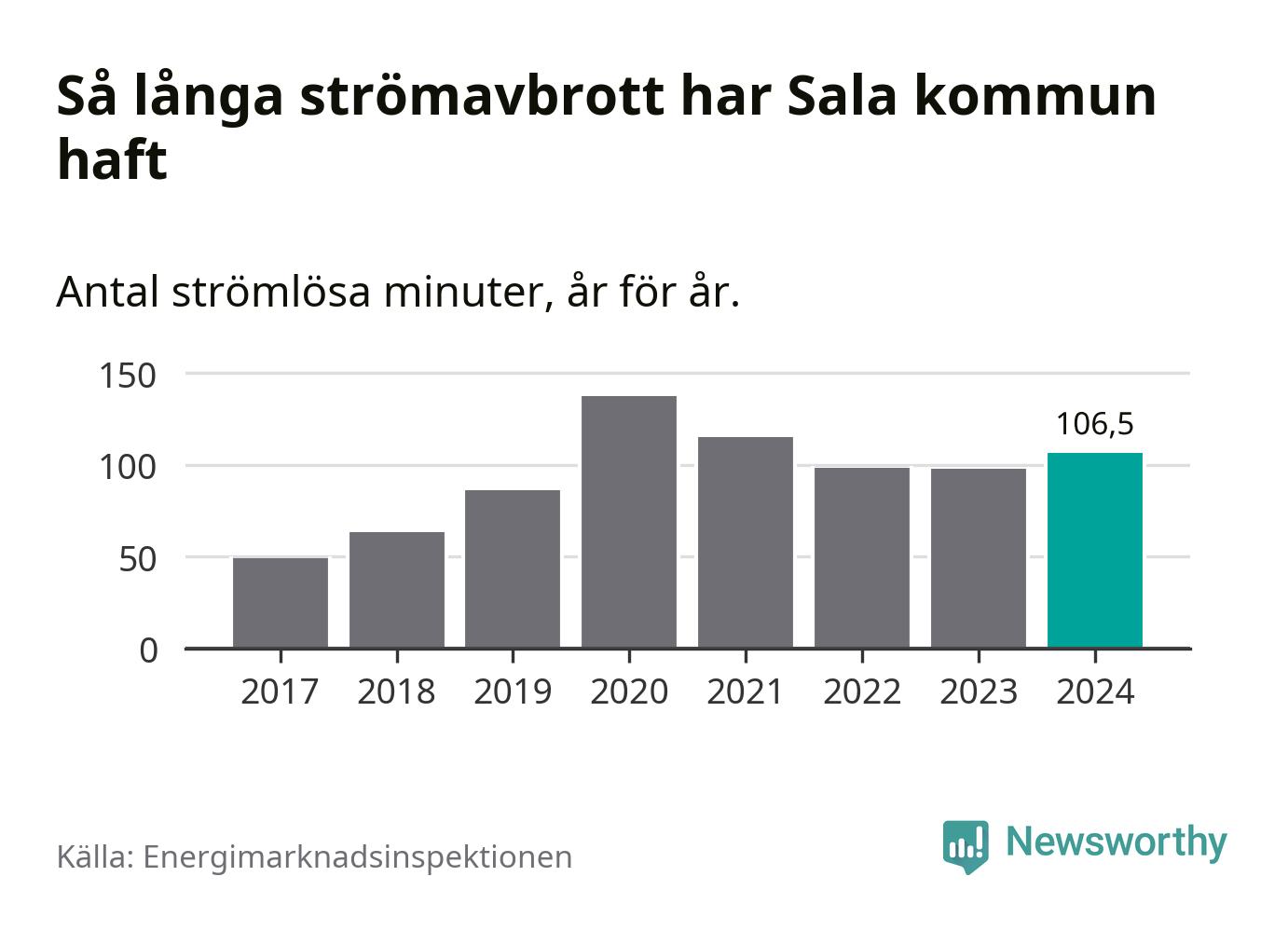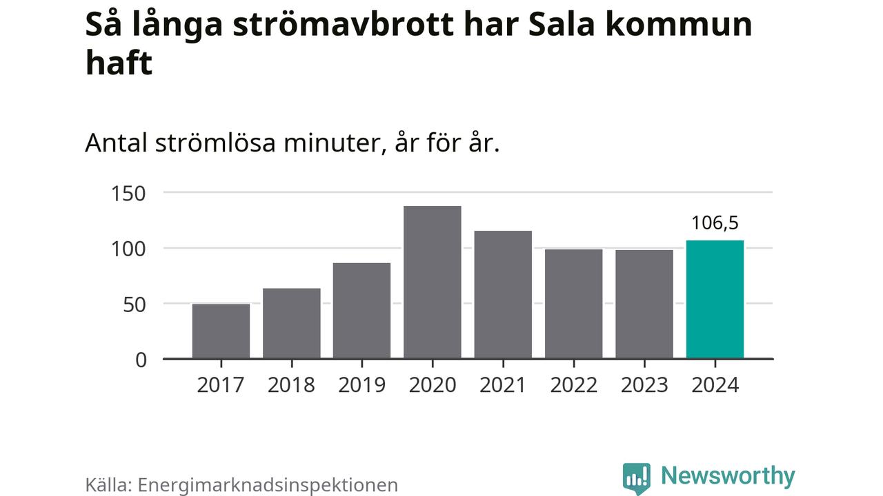 Antalet strömavbrott och total strömlös tid varierar något från år till år i Sala kommun. Mest tid utan ström (i alla fall under perioden 2017–2024) fick Salaborna genomleva under 2020 – två timmar och 18 minuter. Det är 39 minuter längre än under ett normalår.