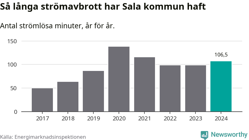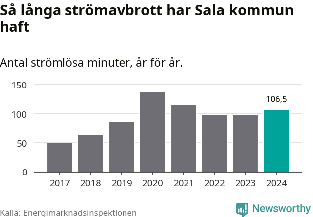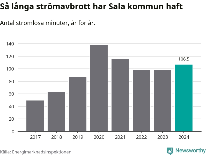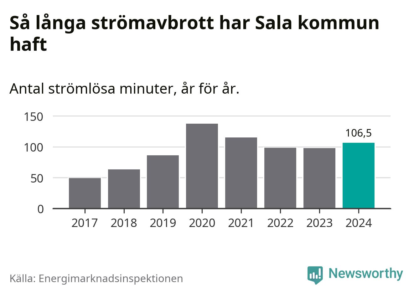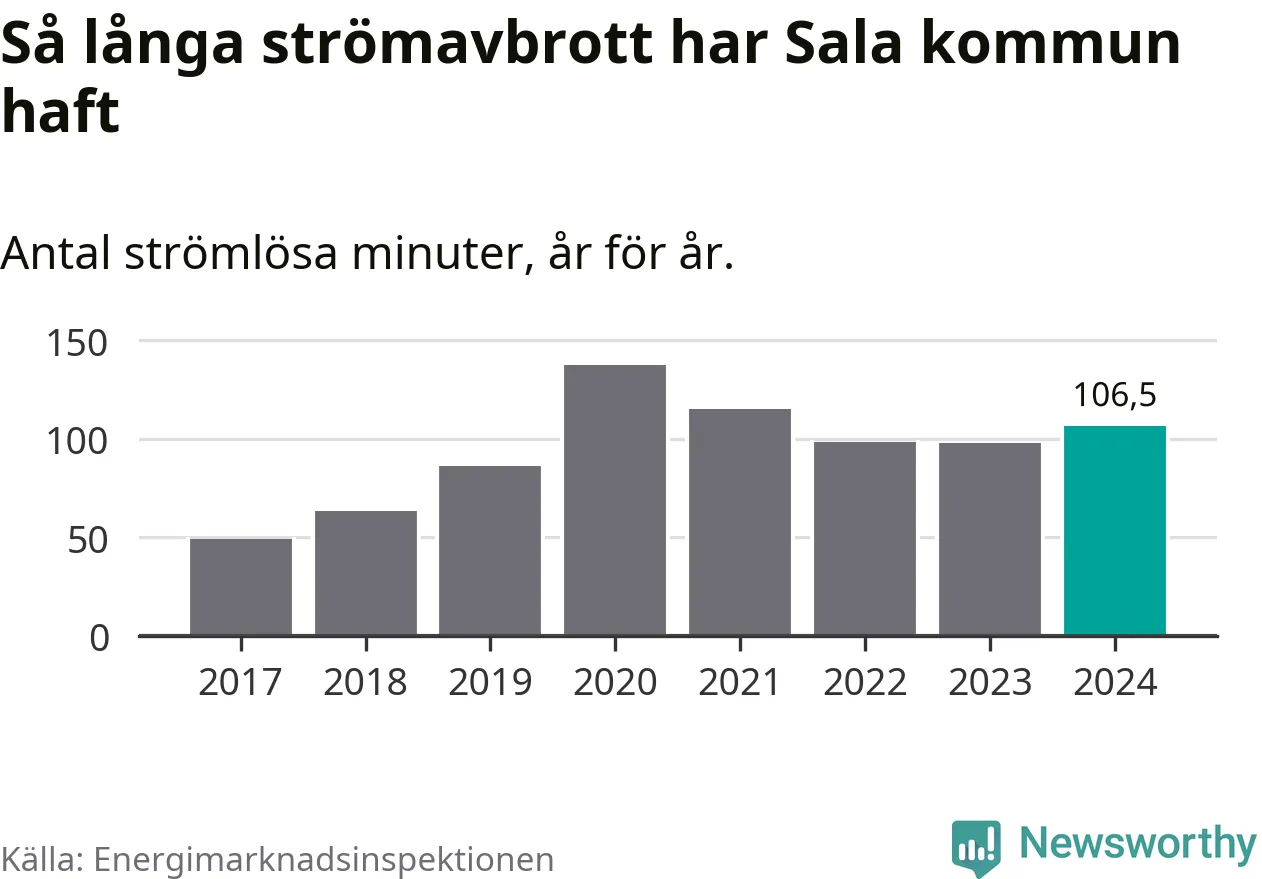 Antalet strömavbrott och total strömlös tid varierar något från år till år i Sala kommun. Mest tid utan ström (i alla fall under perioden 2017–2024) fick Salaborna genomleva under 2020 – två timmar och 18 minuter. Det är 39 minuter längre än under ett normalår.