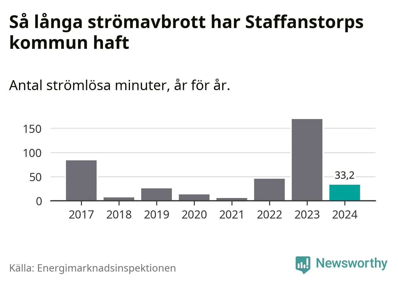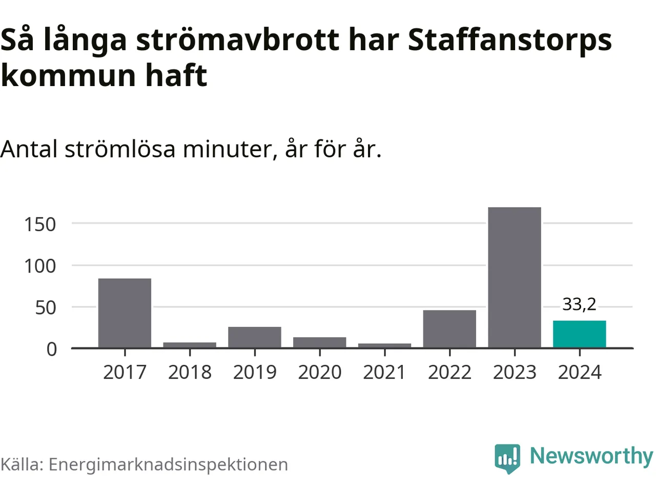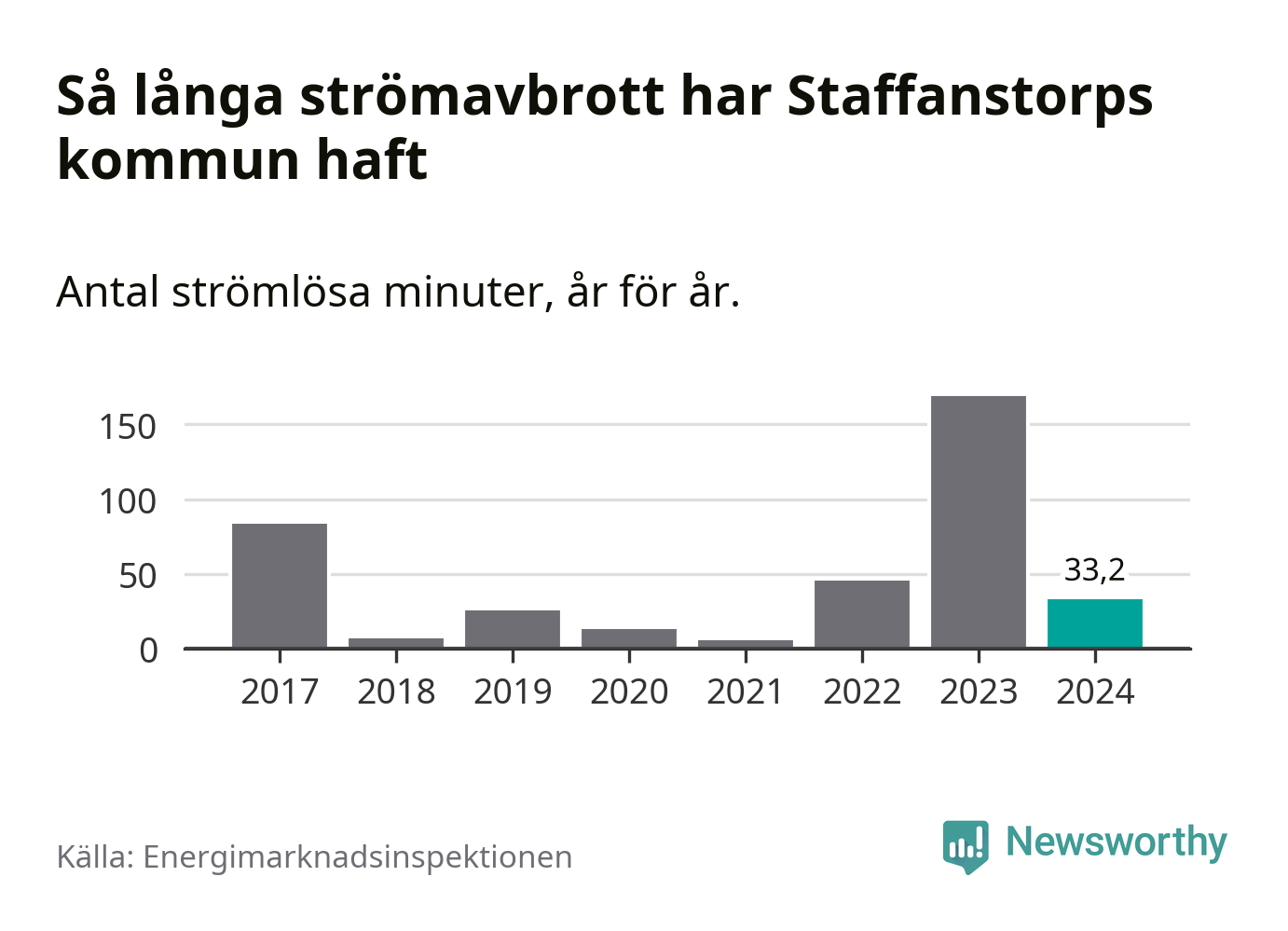 Antalet strömavbrott och total strömlös tid varierar från år till år i Staffanstorps kommun. Mest tid utan ström (i alla fall under perioden 2017–2024) fick Staffanstorpsborna genomleva under 2023 – två timmar och 49 minuter. Det är två timmar och 19 minuter längre än under ett normalår.
