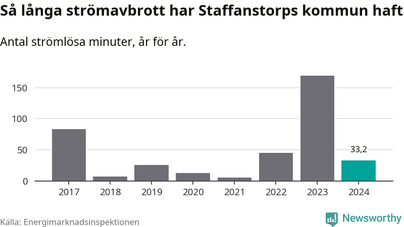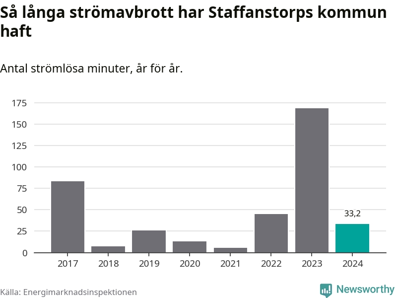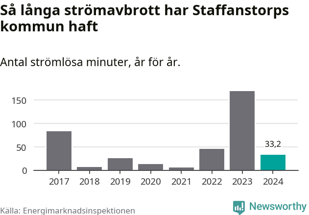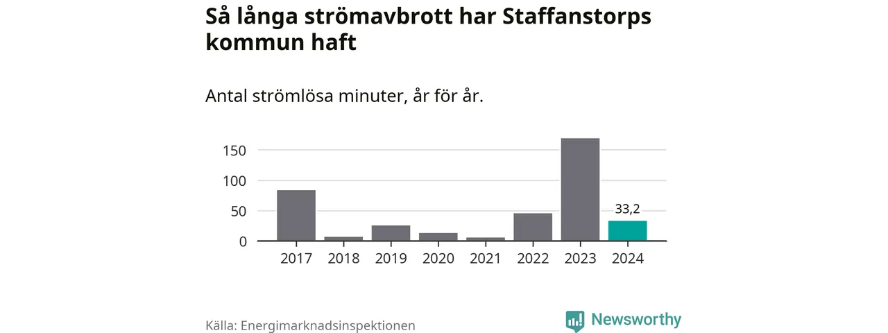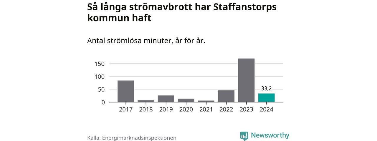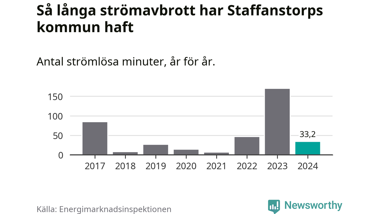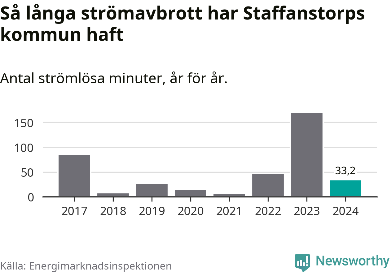 Antalet strömavbrott och total strömlös tid varierar från år till år i Staffanstorps kommun. Mest tid utan ström (i alla fall under perioden 2017–2024) fick Staffanstorpsborna genomleva under 2023 – två timmar och 49 minuter. Det är två timmar och 19 minuter längre än under ett normalår.