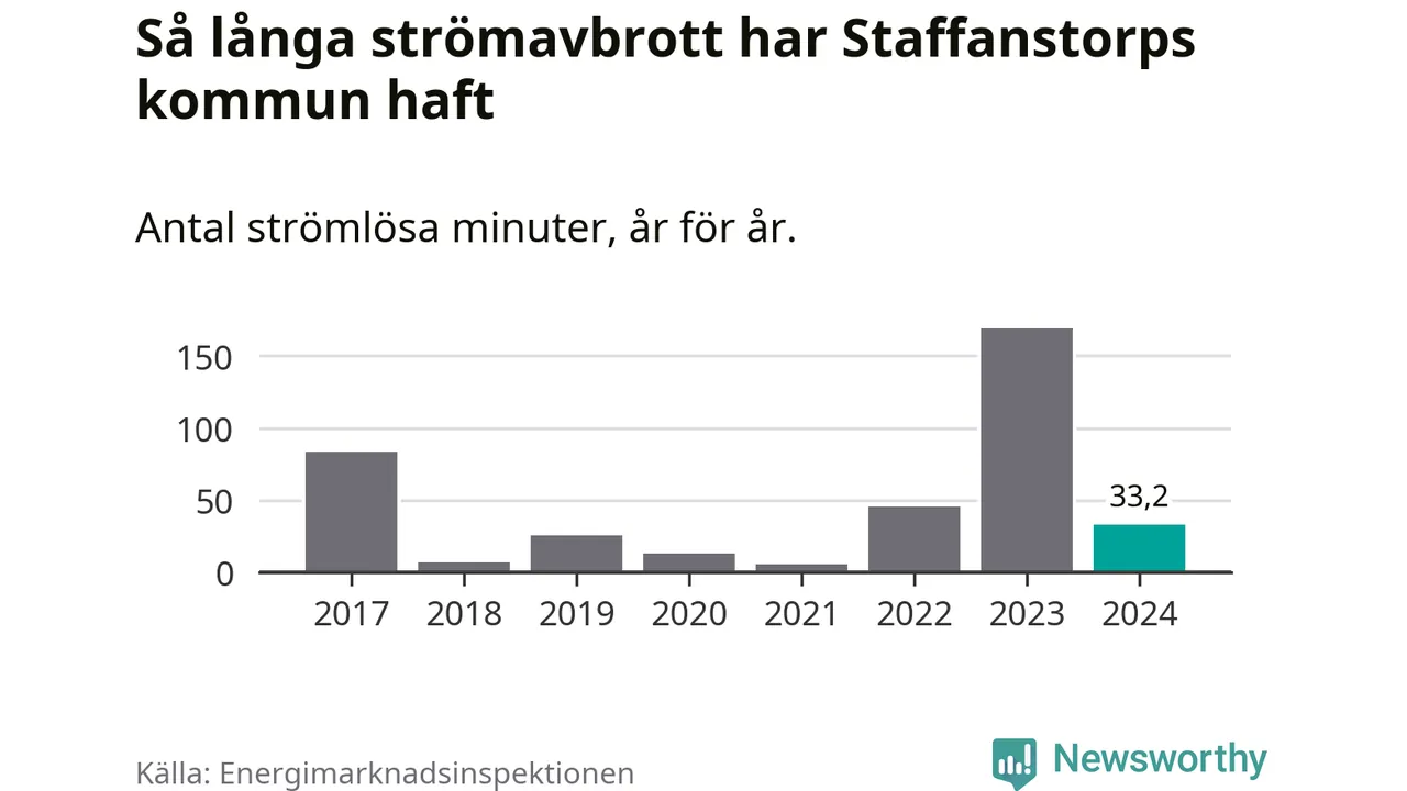 Staffanstorps kommuns hushåll drabbas normalt inte ens av ett enda strömavbrott per år. Om avbrott ändå sker är de relativt korta – i snitt 30 strömlösa minuter per hushåll och år.