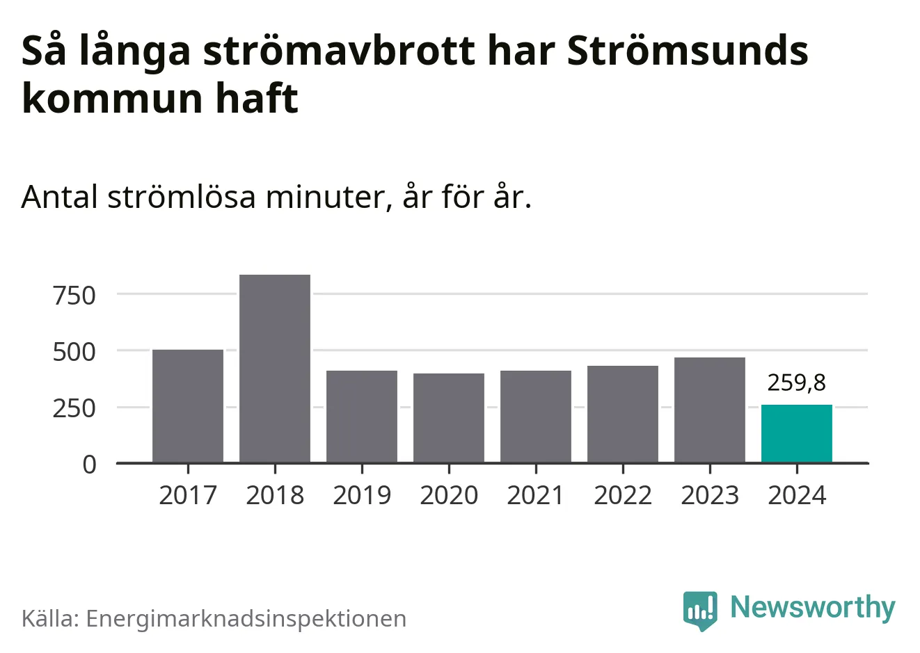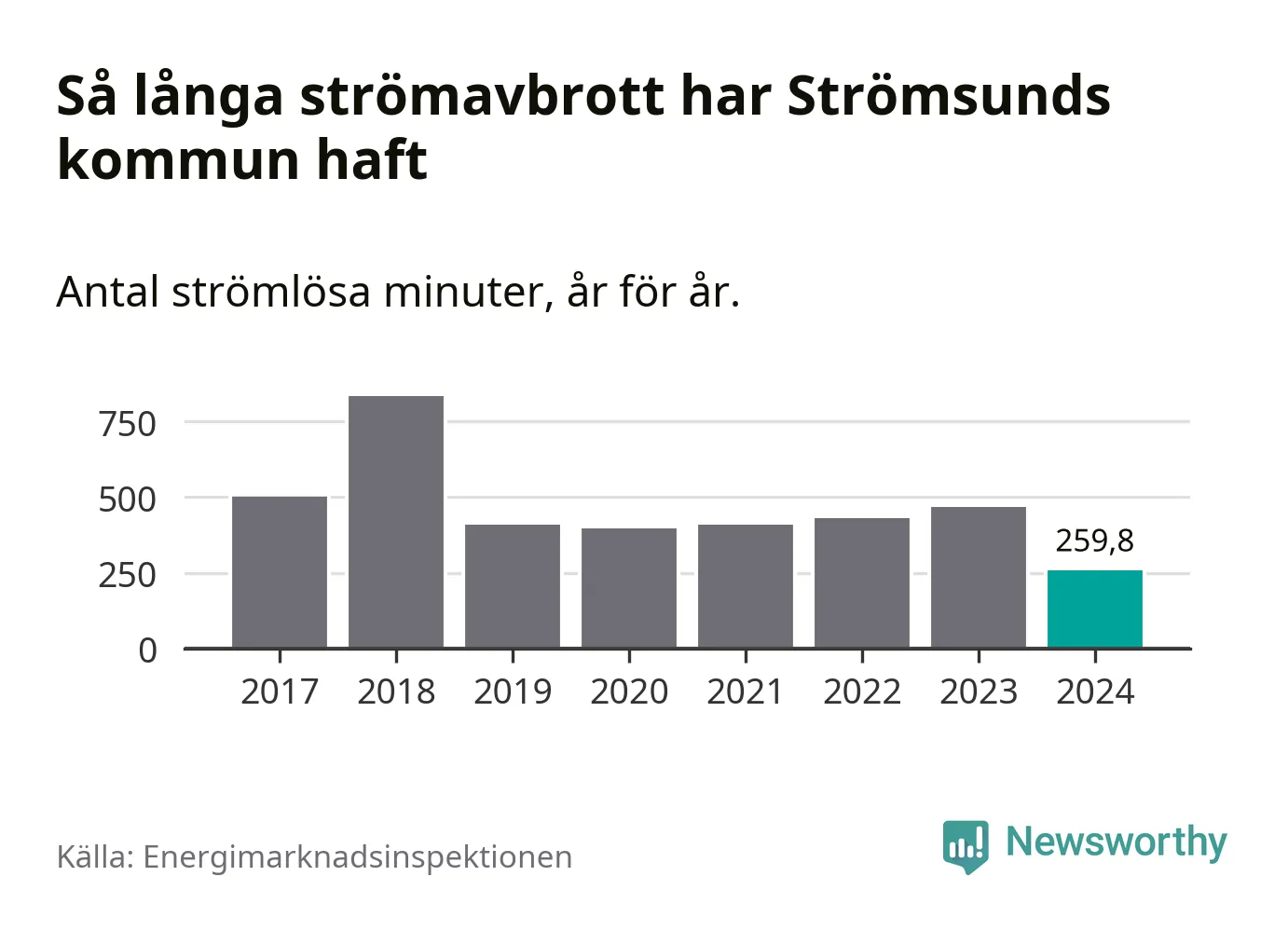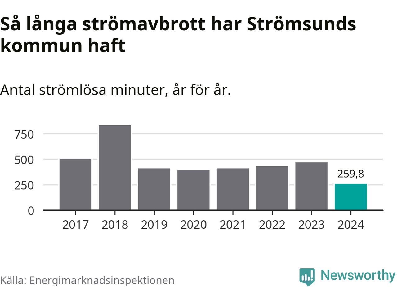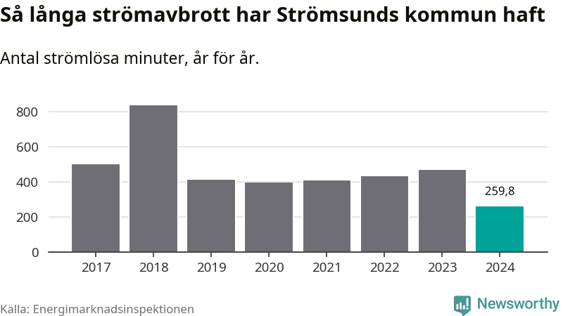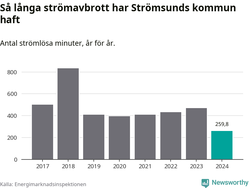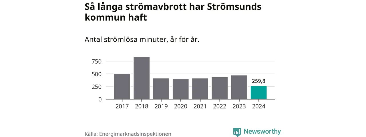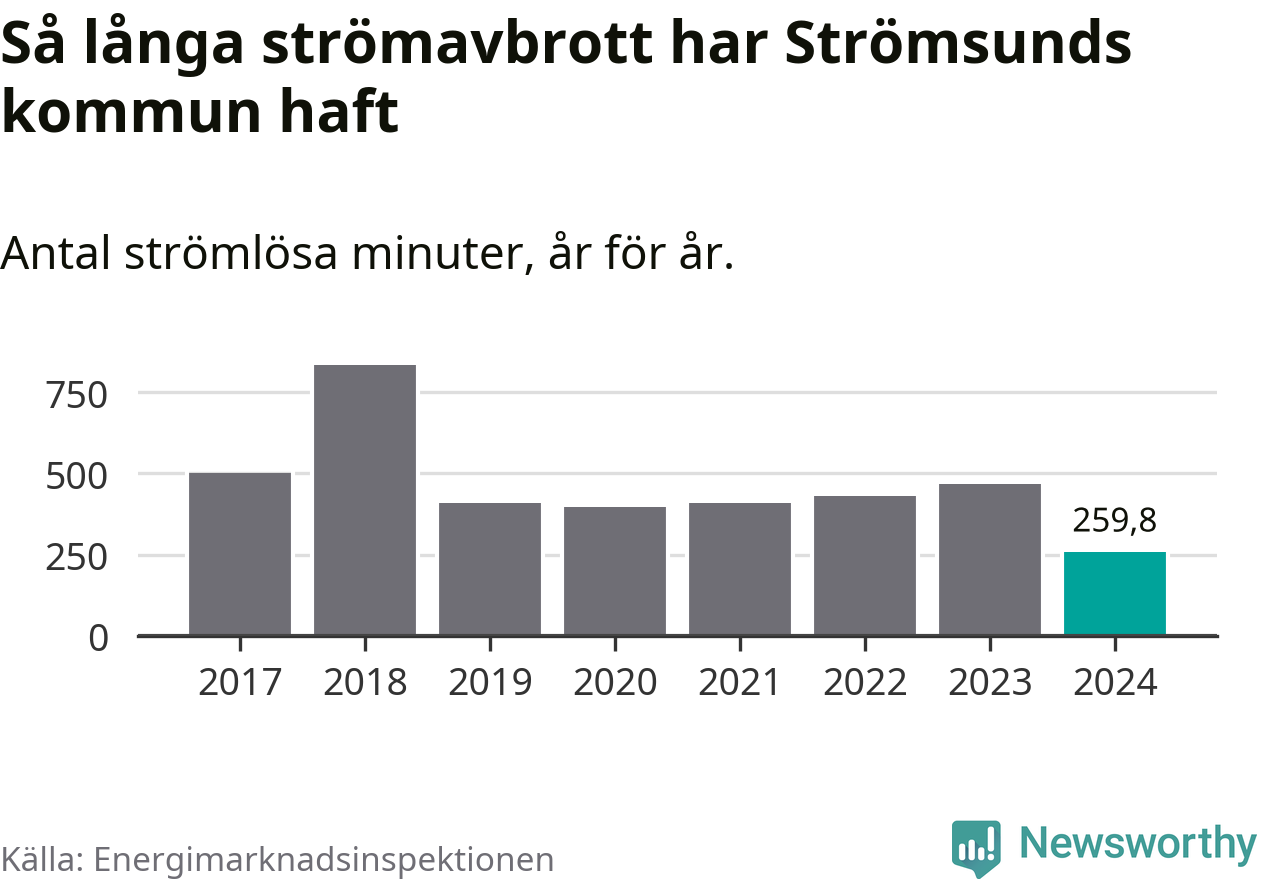 Antalet strömavbrott och total strömlös tid varierar något från år till år i Strömsunds kommun. Mest tid utan ström (i alla fall under perioden 2017–2024) fick Strömsundsborna genomleva under 2018 – 13 timmar och 54 minuter. Det är sex timmar och 54 minuter längre än under ett normalår.