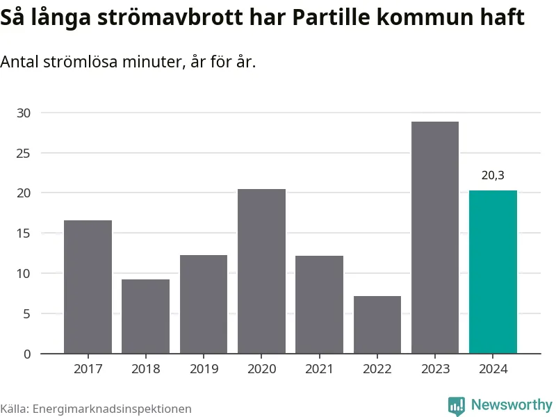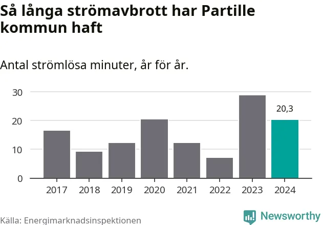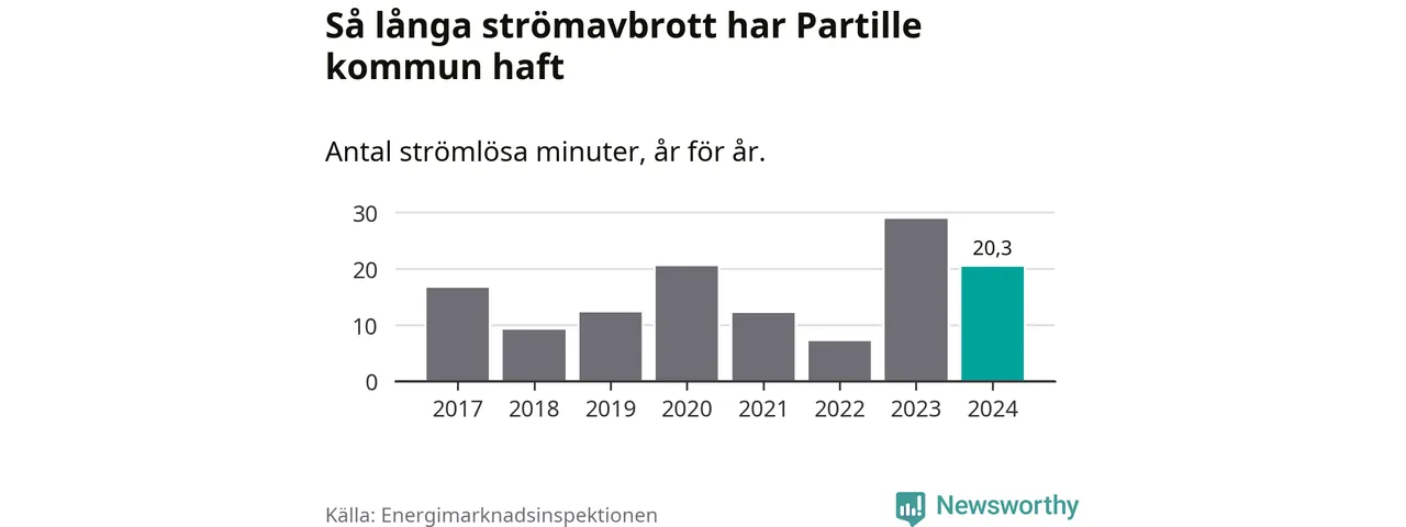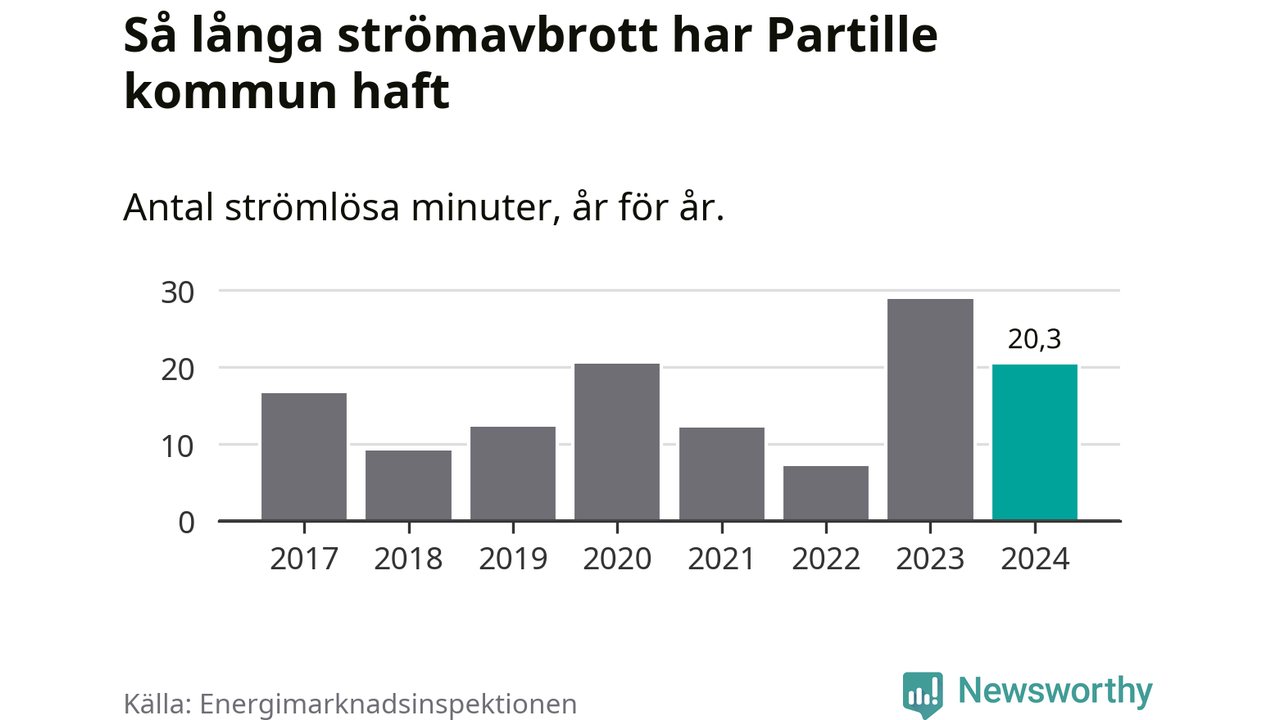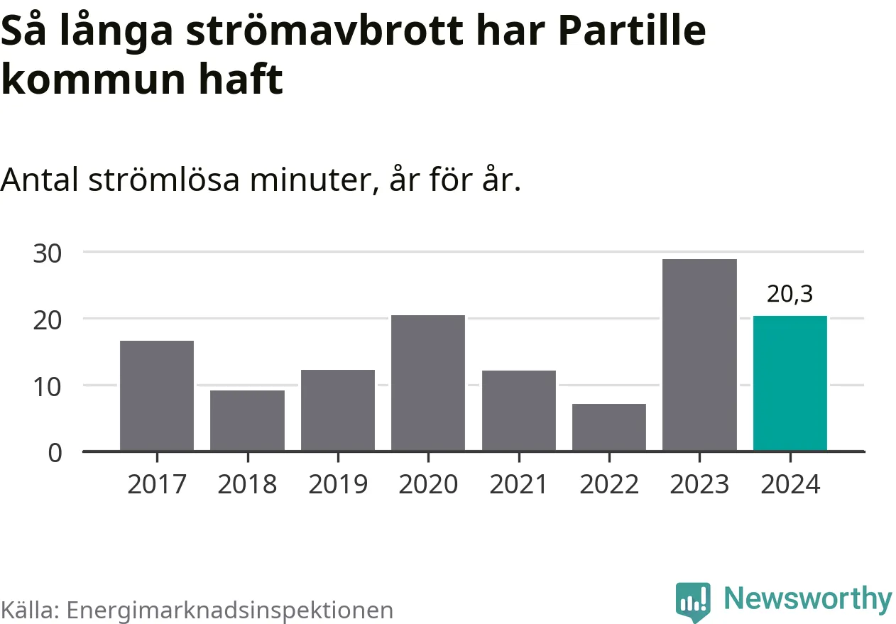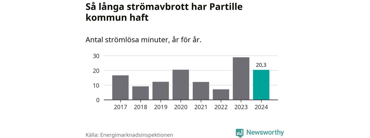 Antalet strömavbrott och total strömlös tid varierar något från år till år i Partille kommun. Mest tid utan ström (i alla fall under perioden 2017–2024) fick Partille­borna genomleva under 2023 – 29 minuter. Det är 14 minuter längre än under ett normalår.