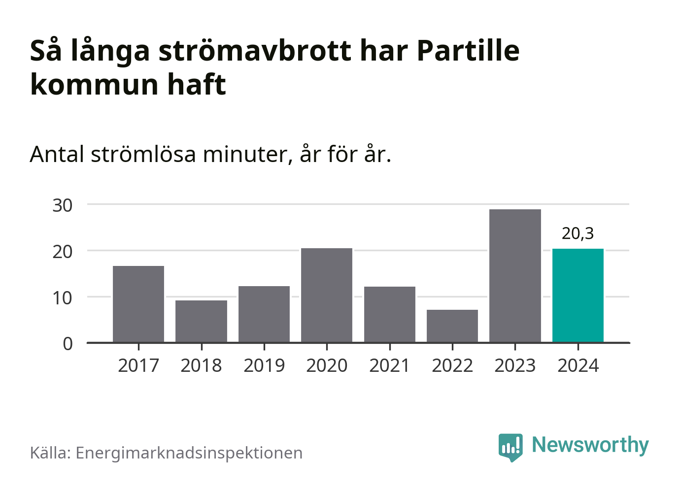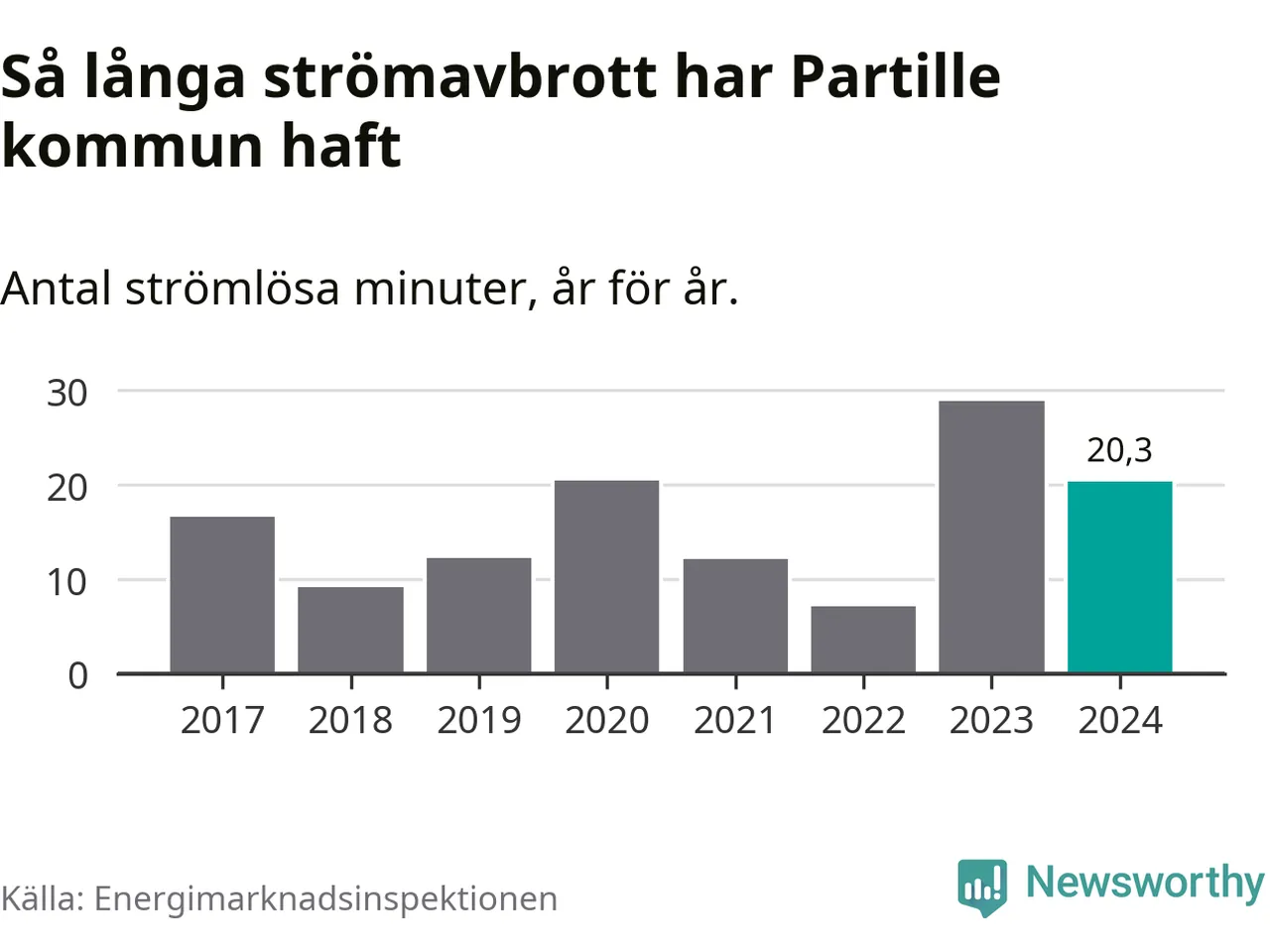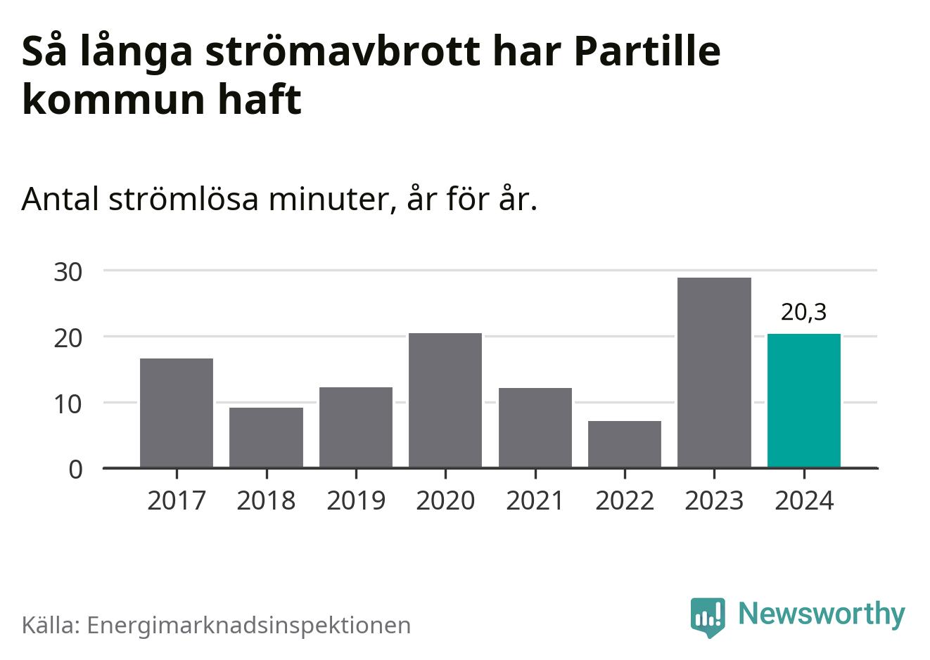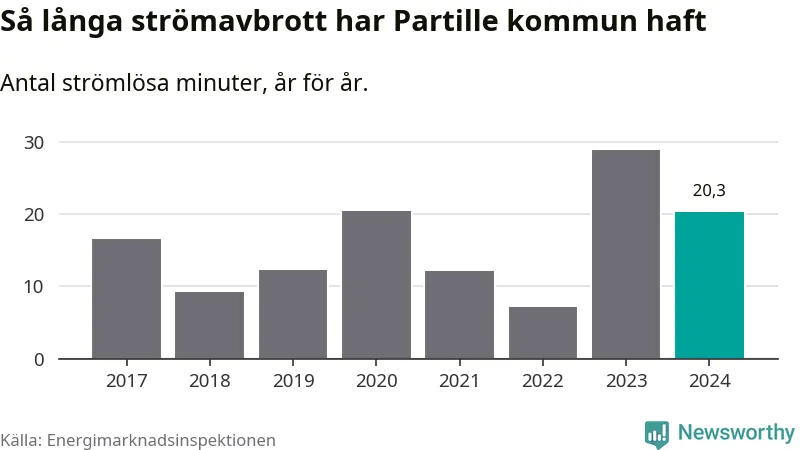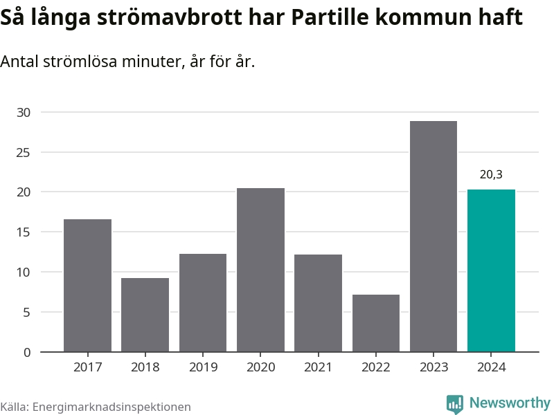 Antalet strömavbrott och total strömlös tid varierar något från år till år i Partille kommun. Mest tid utan ström (i alla fall under perioden 2017–2024) fick Partille­borna genomleva under 2023 – 29 minuter. Det är 14 minuter längre än under ett normalår.