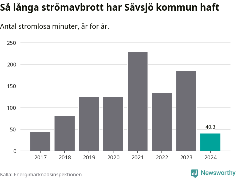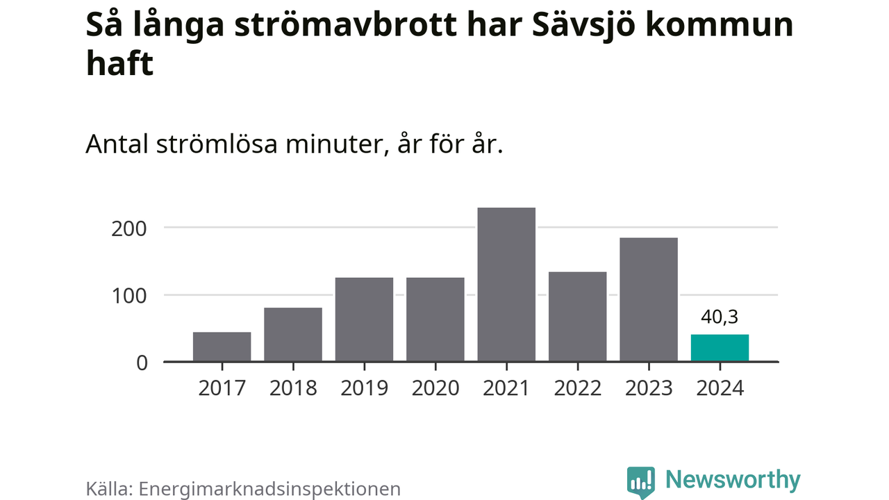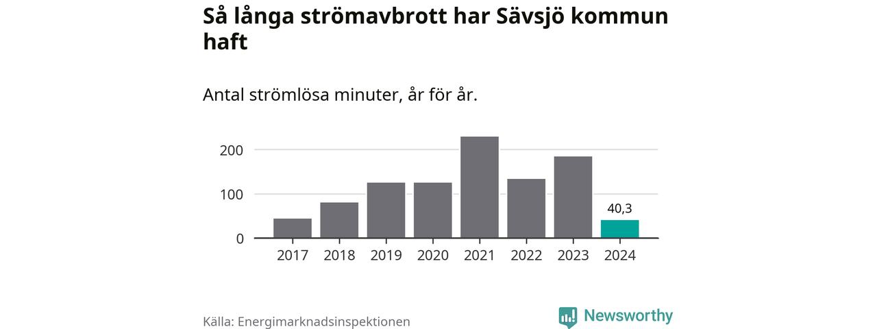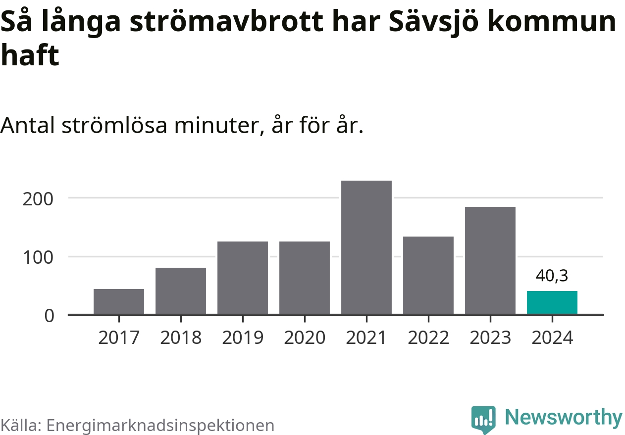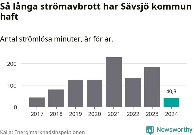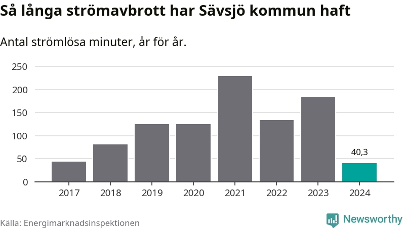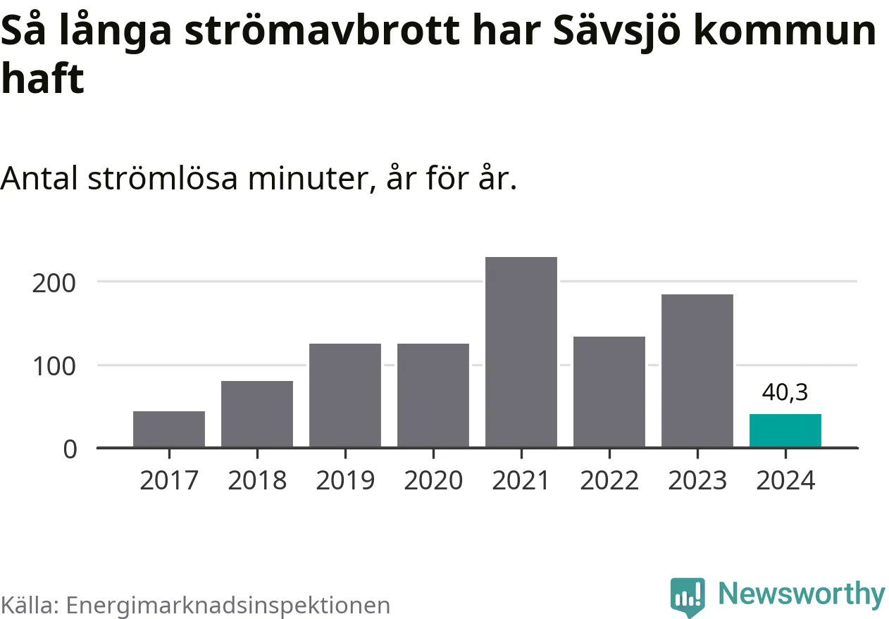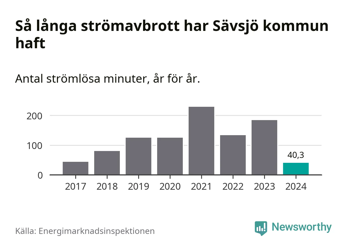 Antalet strömavbrott och total strömlös tid varierar något från år till år i Sävsjö kommun. Mest tid utan ström (i alla fall under perioden 2017–2024) fick Sävsjöborna genomleva under 2021 – tre timmar och 49 minuter. Det är en timme och 44 minuter längre än under ett normalår.
