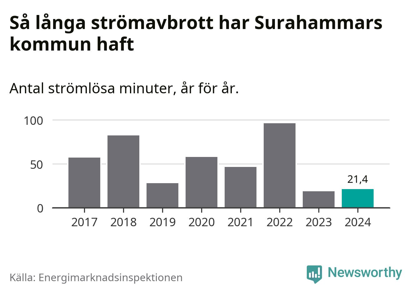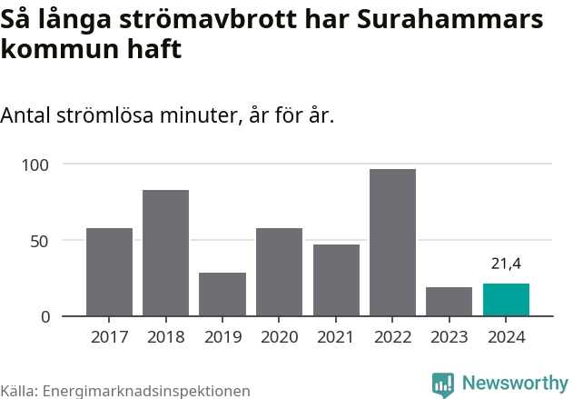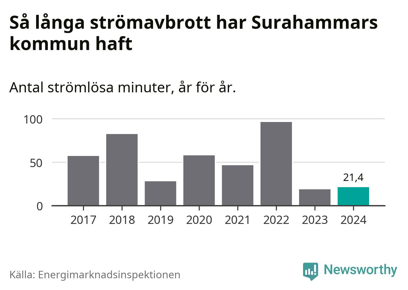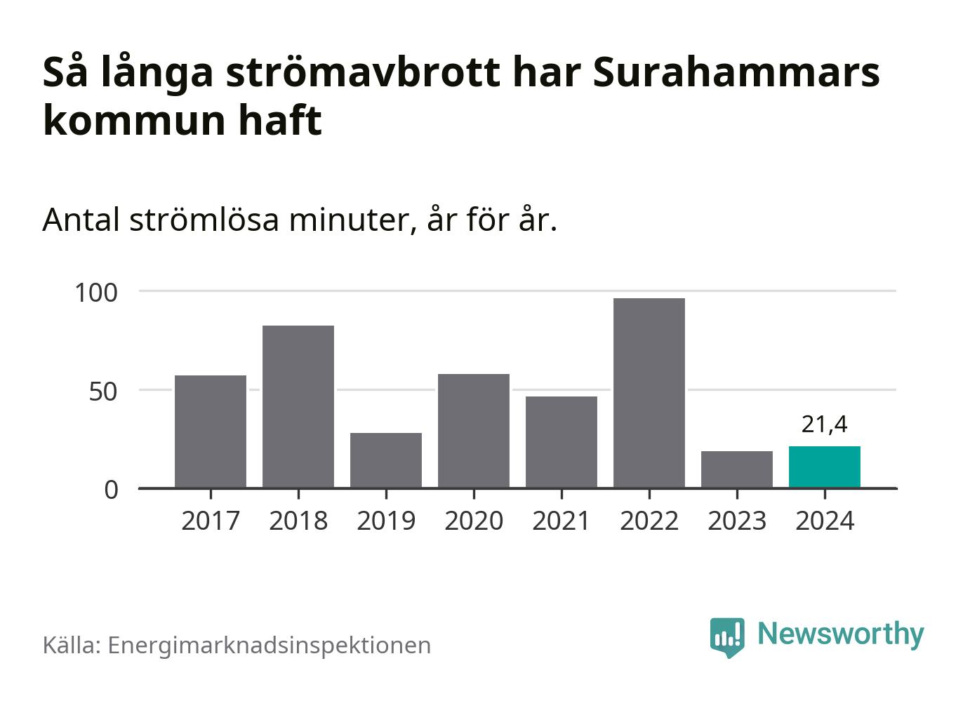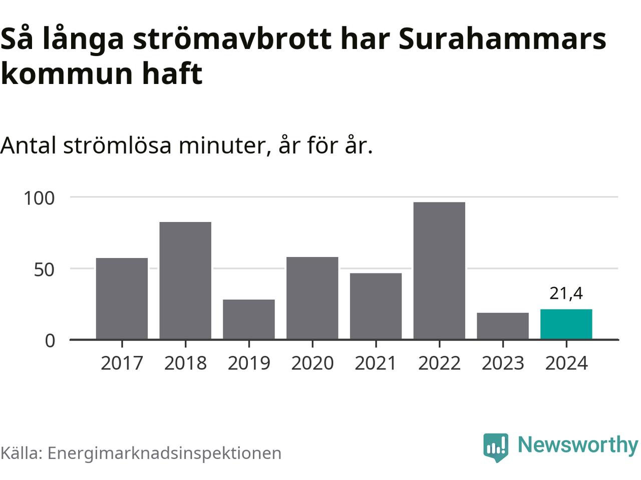 Antalet strömavbrott och total strömlös tid varierar något från år till år i Surahammars kommun. Mest tid utan ström (i alla fall under perioden 2017–2024) fick Surahammarsborna genomleva under 2022 – en timme och 36 minuter. Det är 44 minuter längre än under ett normalår.