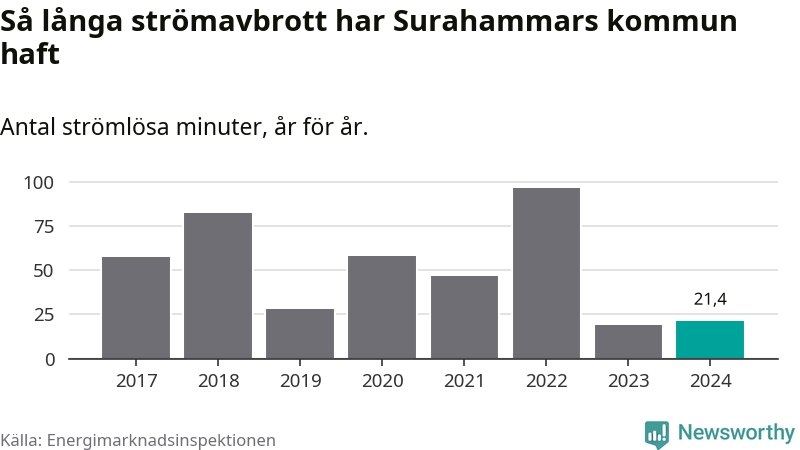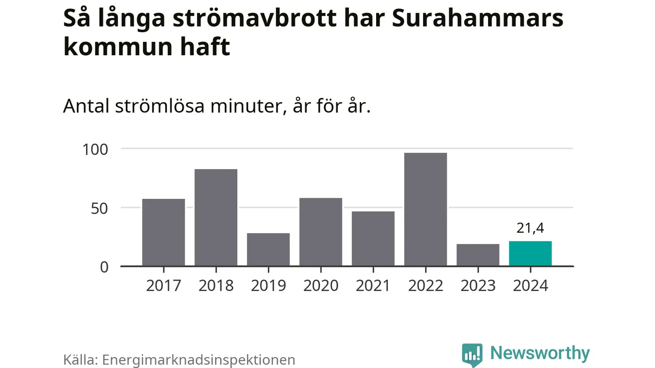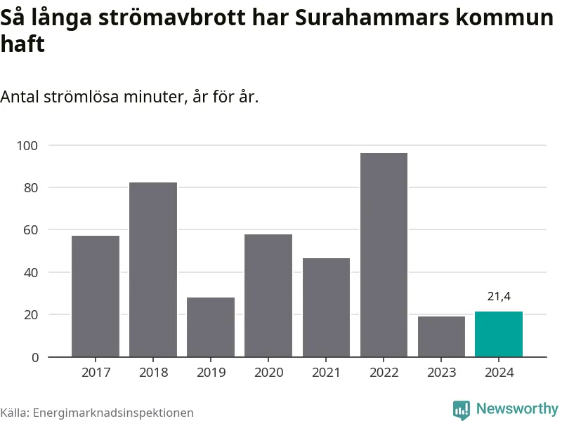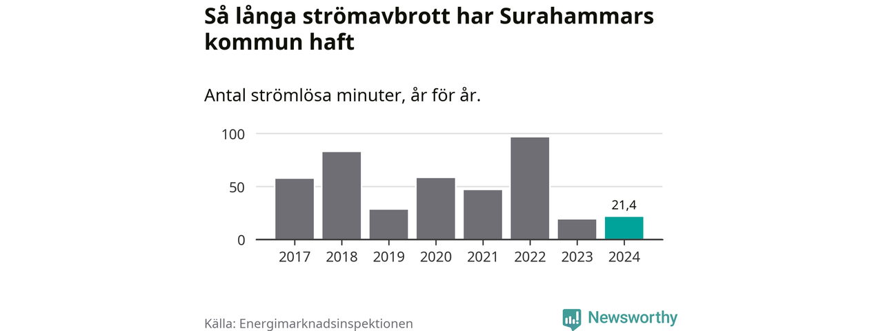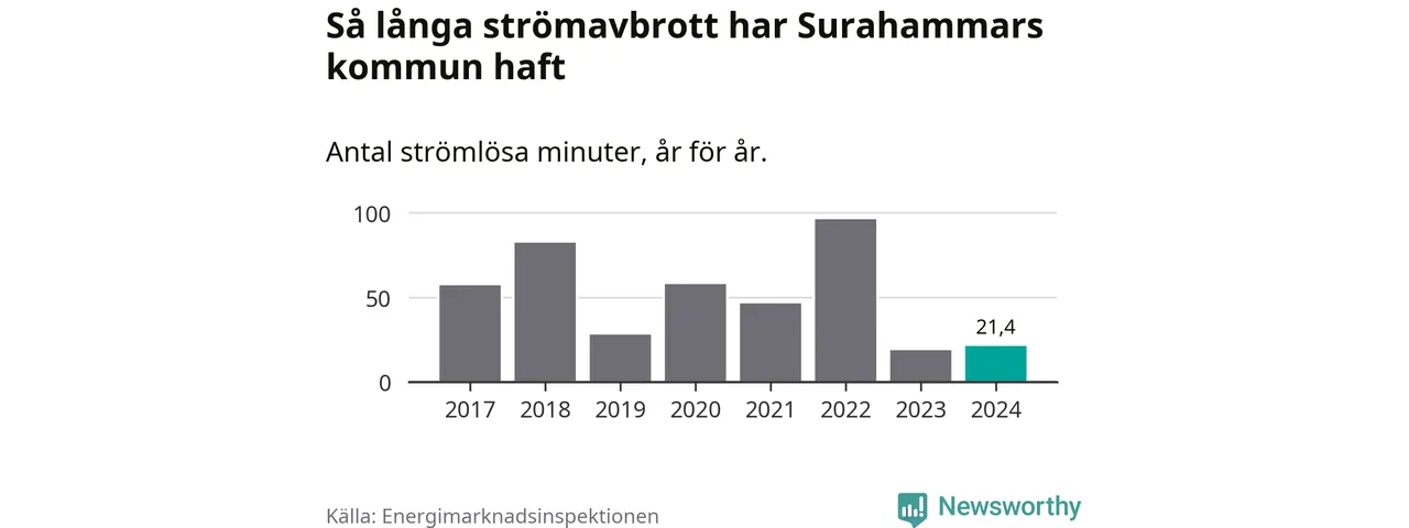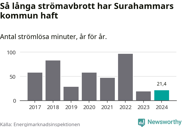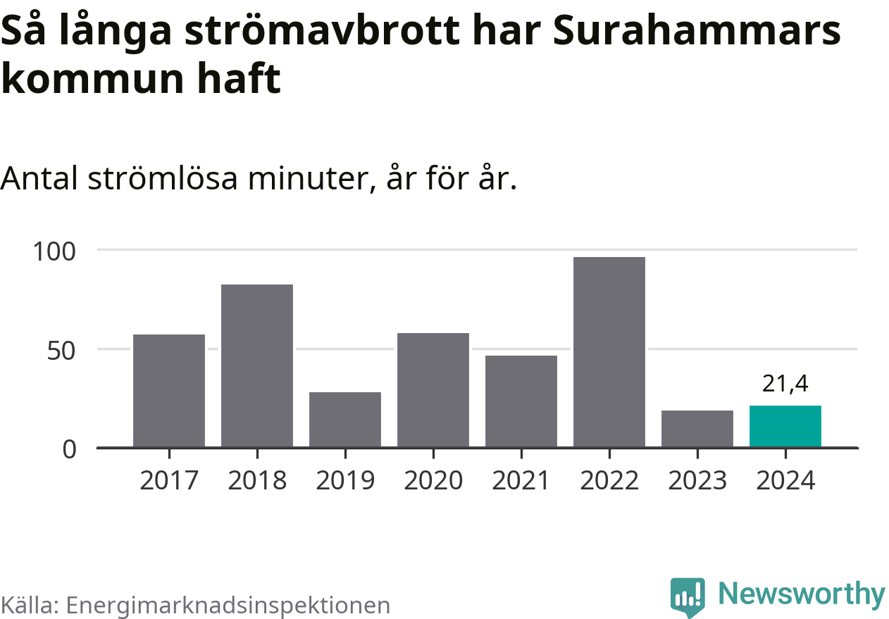 Antalet strömavbrott och total strömlös tid varierar något från år till år i Surahammars kommun. Mest tid utan ström (i alla fall under perioden 2017–2024) fick Surahammarsborna genomleva under 2022 – en timme och 36 minuter. Det är 44 minuter längre än under ett normalår.