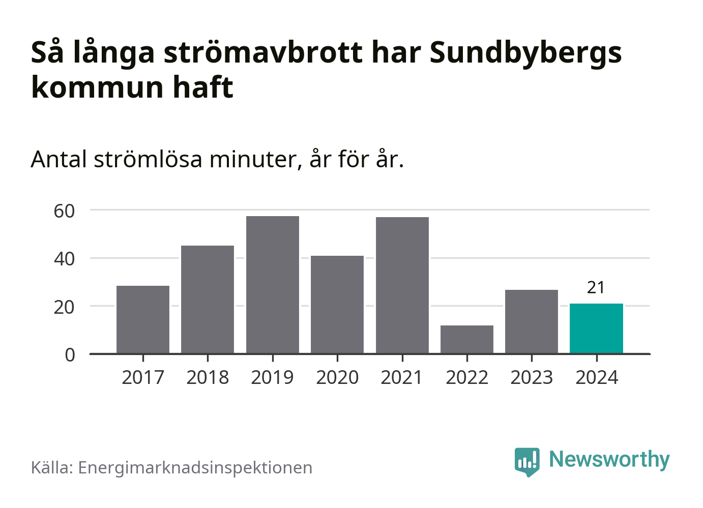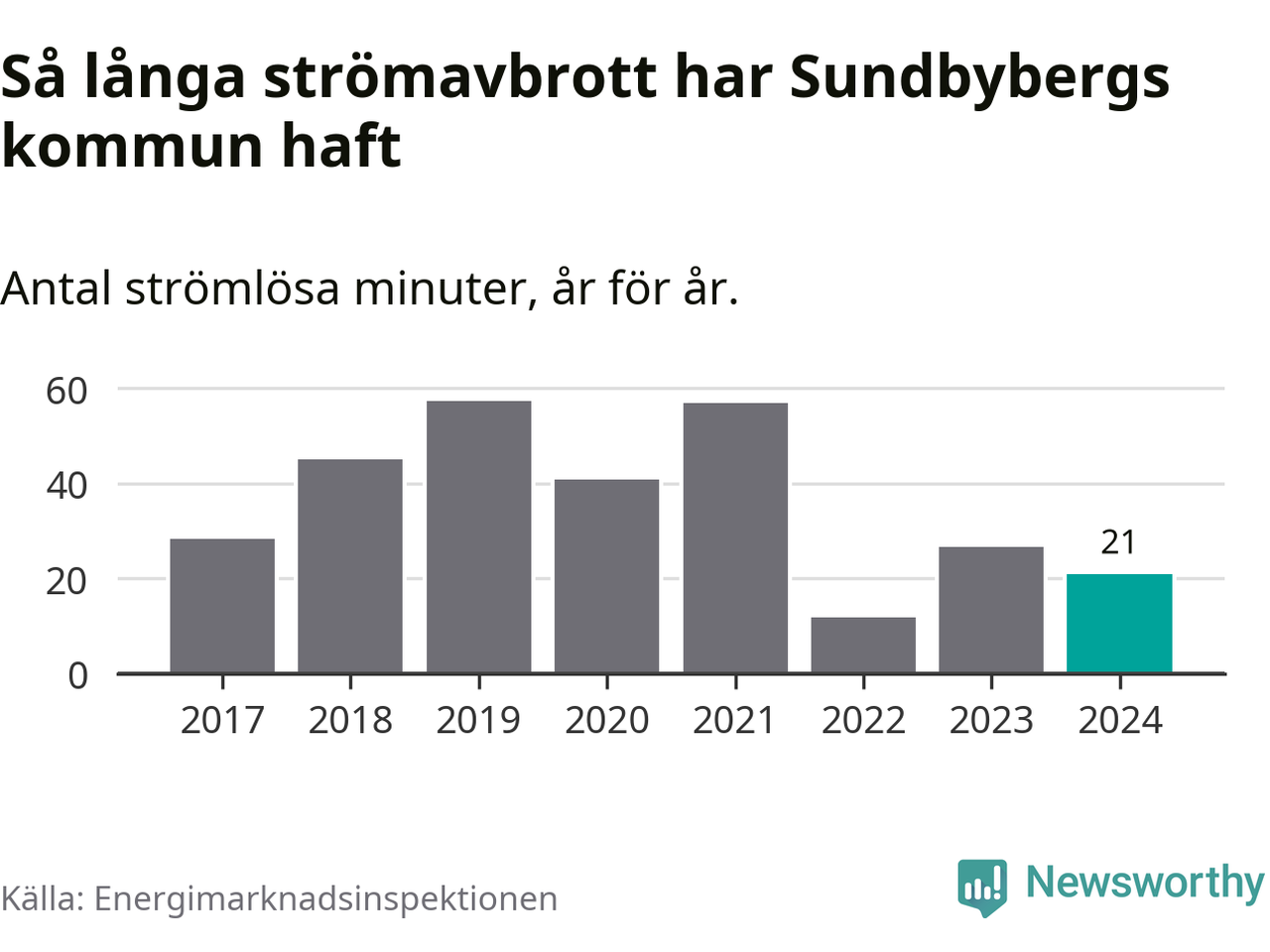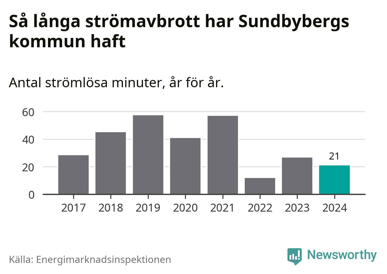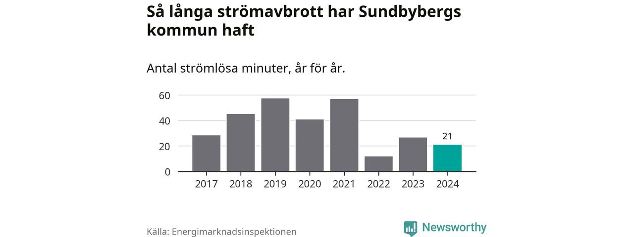 Antalet strömavbrott och total strömlös tid varierar något från år till år i Sundbybergs kommun. Mest tid utan ström (i alla fall under perioden 2017–2024) fick Sundbybergsborna genomleva under 2019 – 57 minuter. Det är 23 minuter längre än under ett normalår.