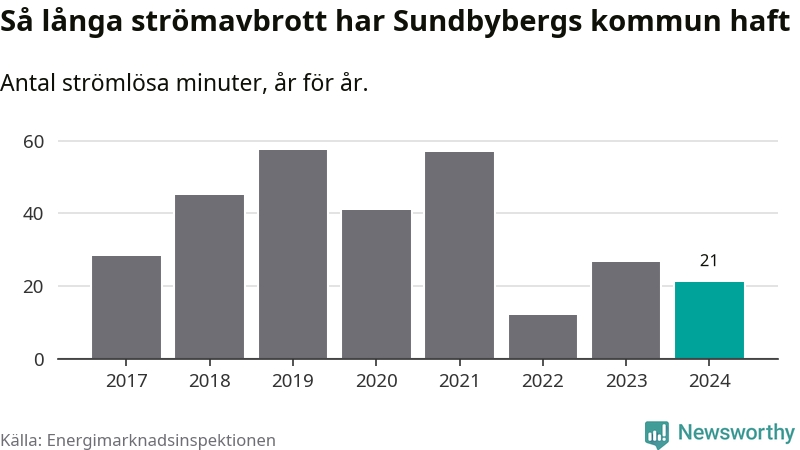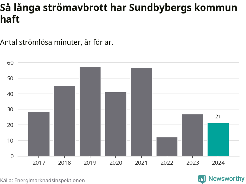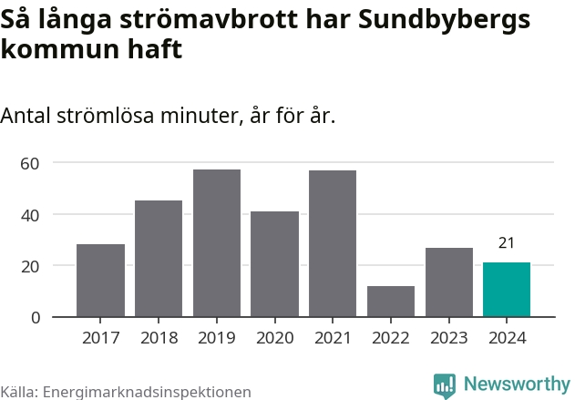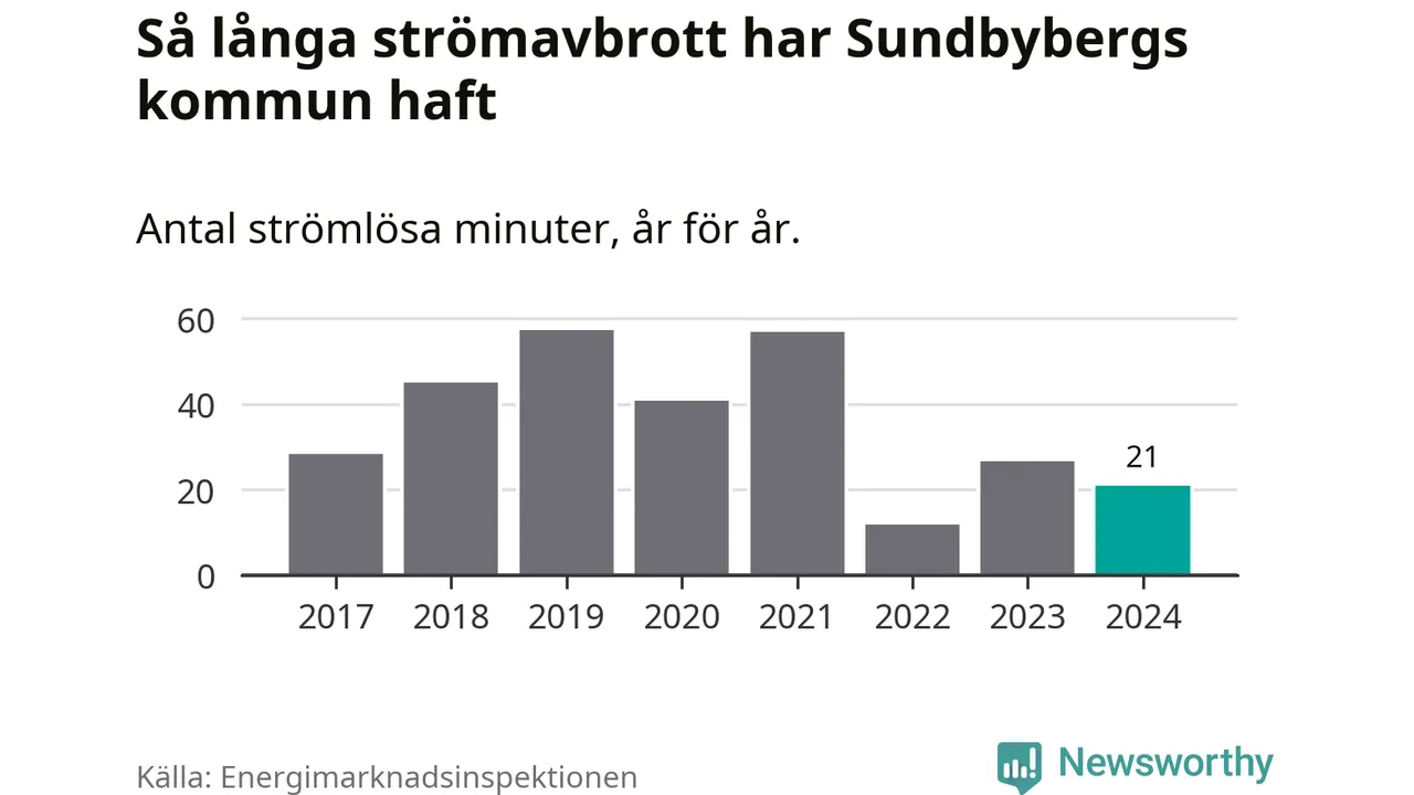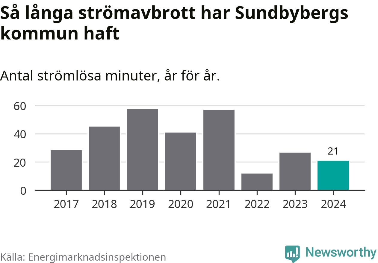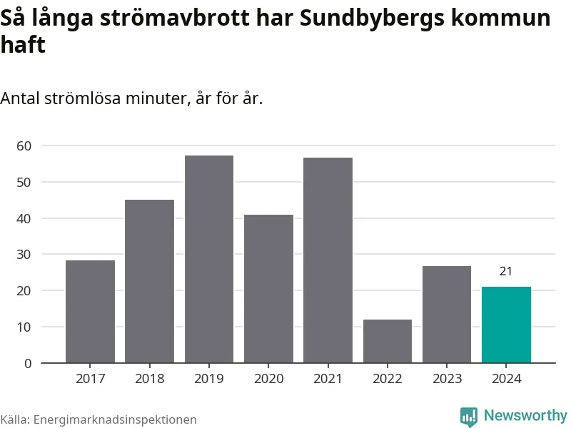 Antalet strömavbrott och total strömlös tid varierar något från år till år i Sundbybergs kommun. Mest tid utan ström (i alla fall under perioden 2017–2024) fick Sundbybergsborna genomleva under 2019 – 57 minuter. Det är 23 minuter längre än under ett normalår.