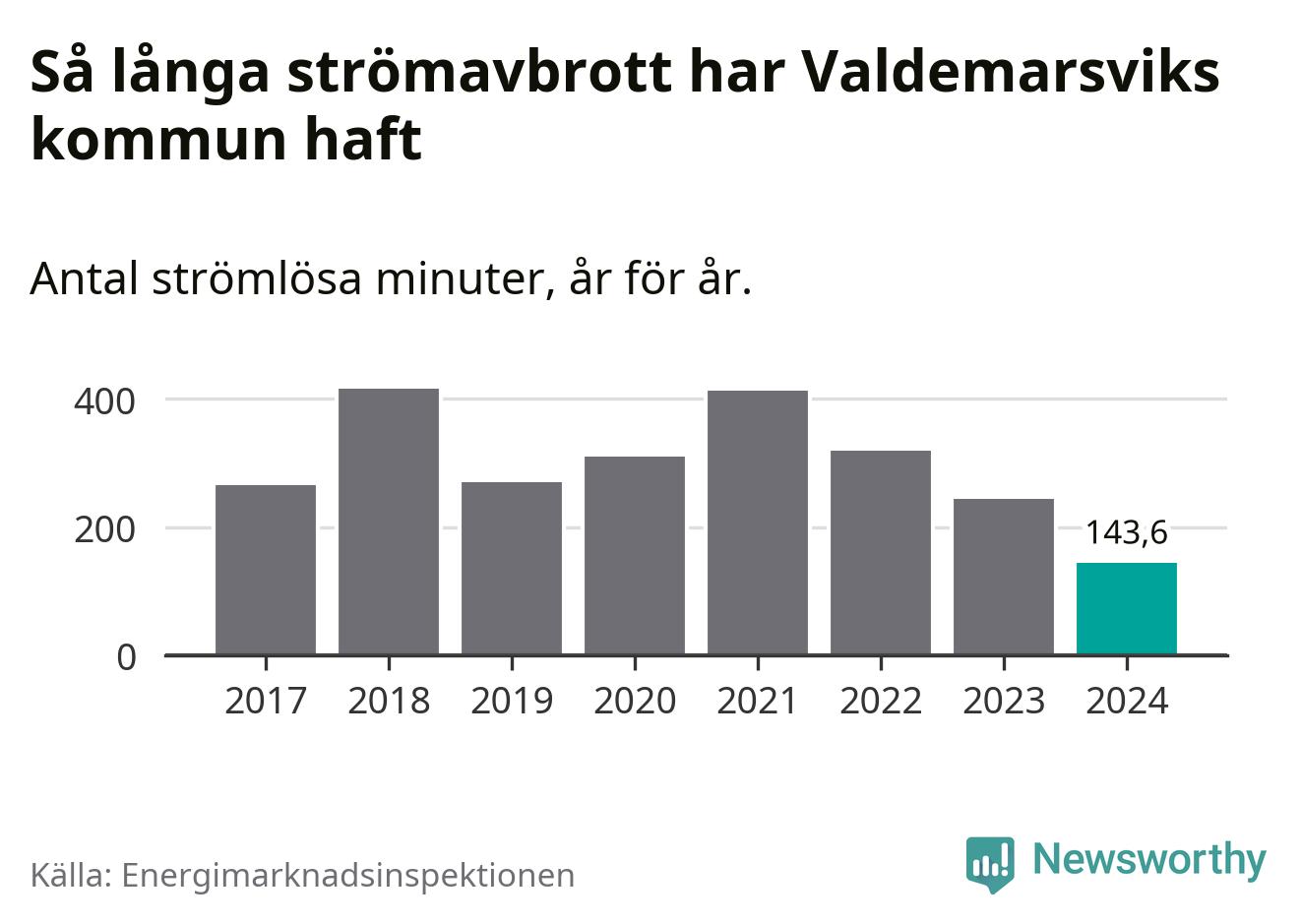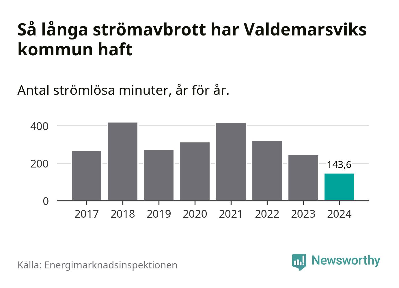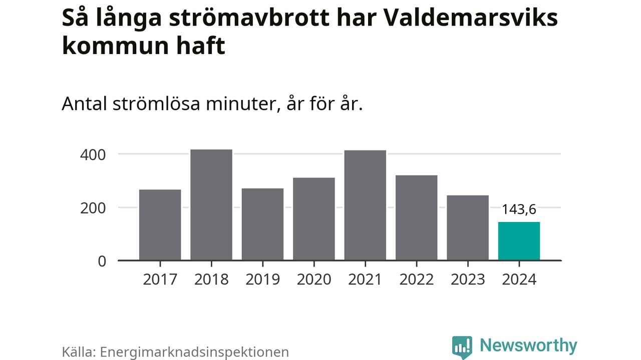 Antalet strömavbrott och total strömlös tid varierar något från år till år i Valdemarsviks kommun. Mest tid utan ström (i alla fall under perioden 2017–2024) fick Valdemarsviksborna genomleva under 2018 – sex timmar och 56 minuter. Det är två timmar och sex minuter längre än under ett normalår.