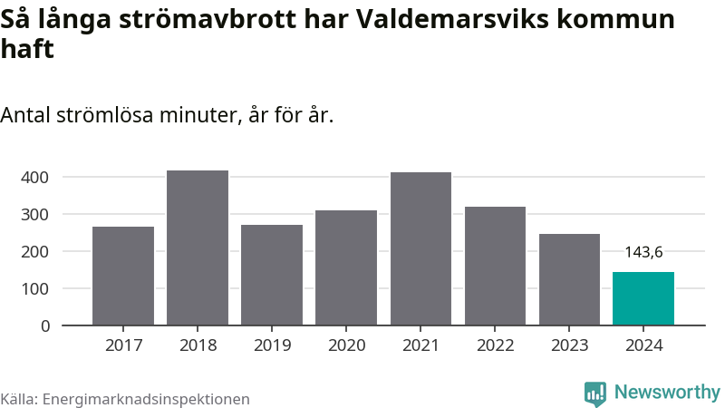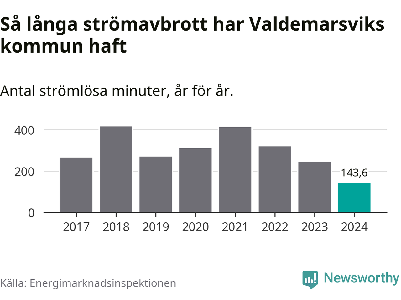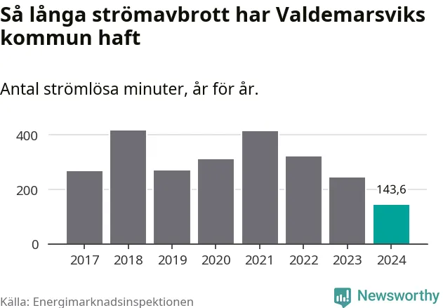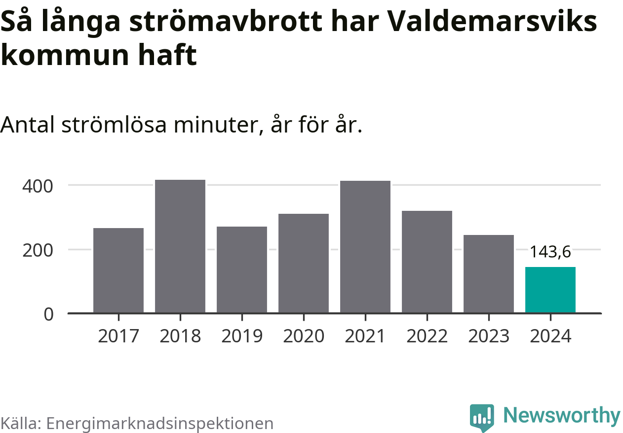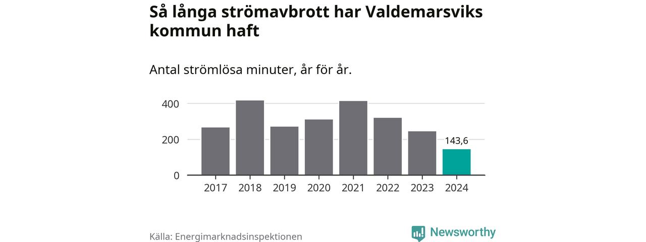 Antalet strömavbrott och total strömlös tid varierar något från år till år i Valdemarsviks kommun. Mest tid utan ström (i alla fall under perioden 2017–2024) fick Valdemarsviksborna genomleva under 2018 – sex timmar och 56 minuter. Det är två timmar och sex minuter längre än under ett normalår.