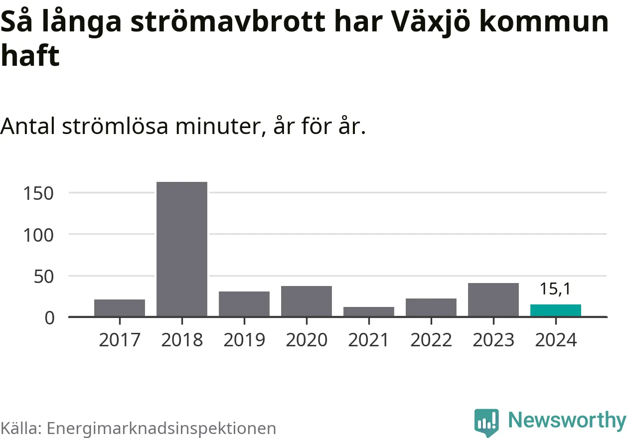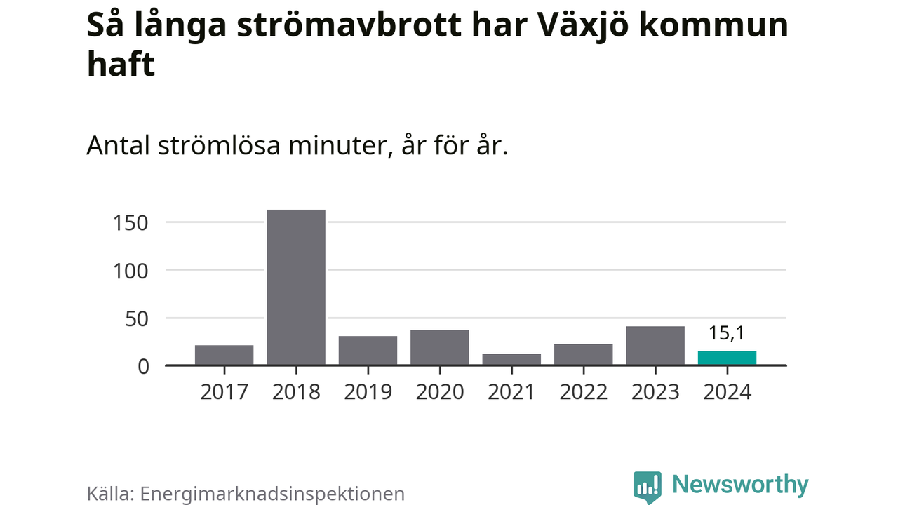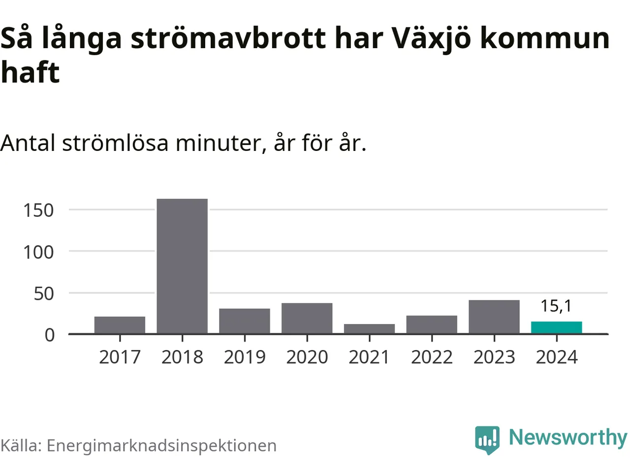 Antalet strömavbrott och total strömlös tid varierar från år till år i Växjö kommun. Mest tid utan ström (i alla fall under perioden 2017–2024) fick Växjö­borna genomleva under 2018 – två timmar och 42 minuter. Det är två timmar och 16 minuter längre än under ett normalår.