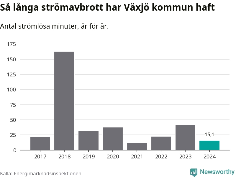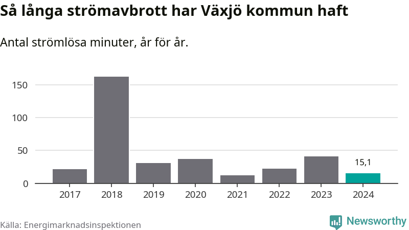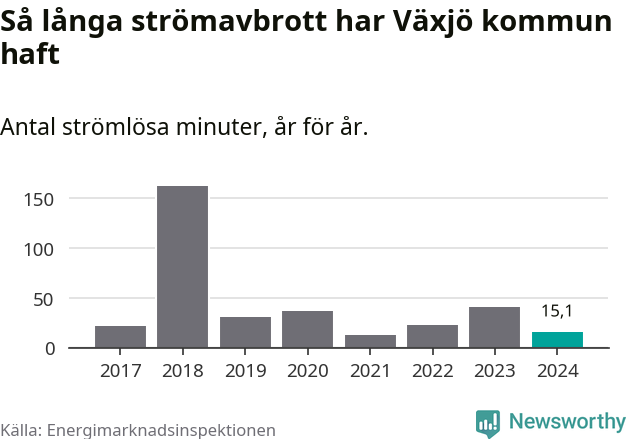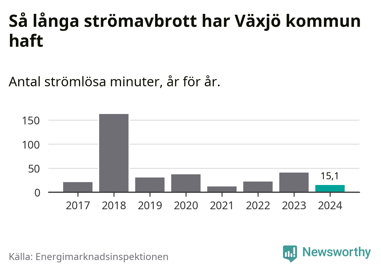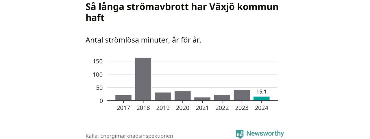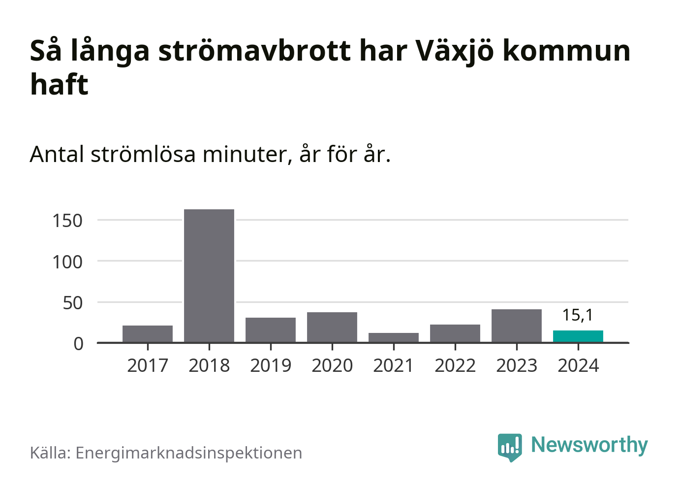 Antalet strömavbrott och total strömlös tid varierar från år till år i Växjö kommun. Mest tid utan ström (i alla fall under perioden 2017–2024) fick Växjö­borna genomleva under 2018 – två timmar och 42 minuter. Det är två timmar och 16 minuter längre än under ett normalår.
