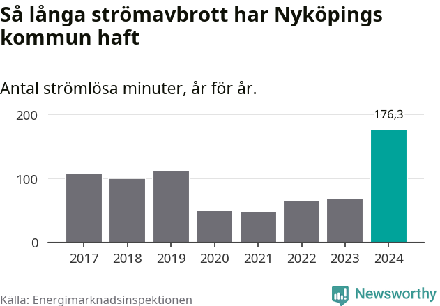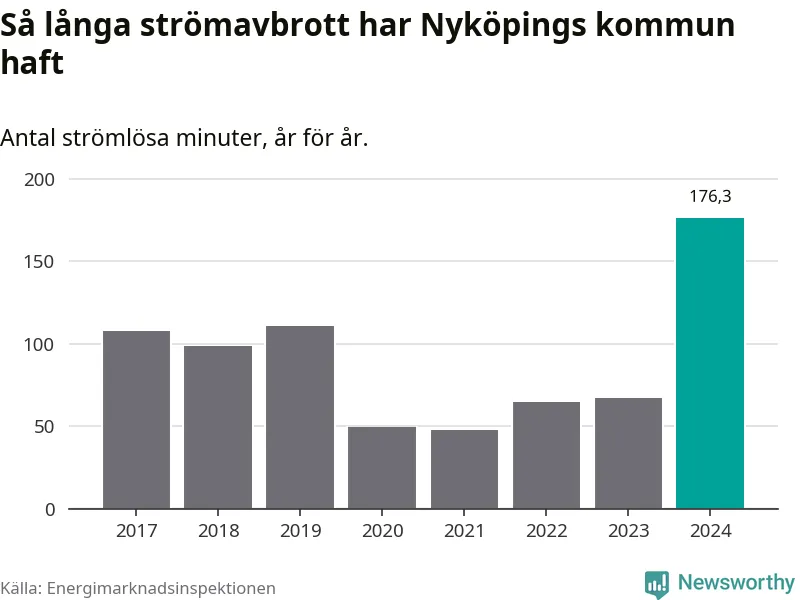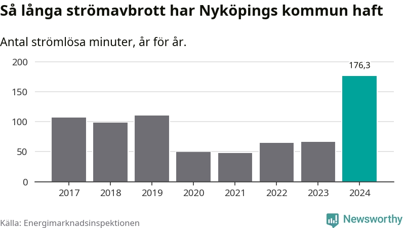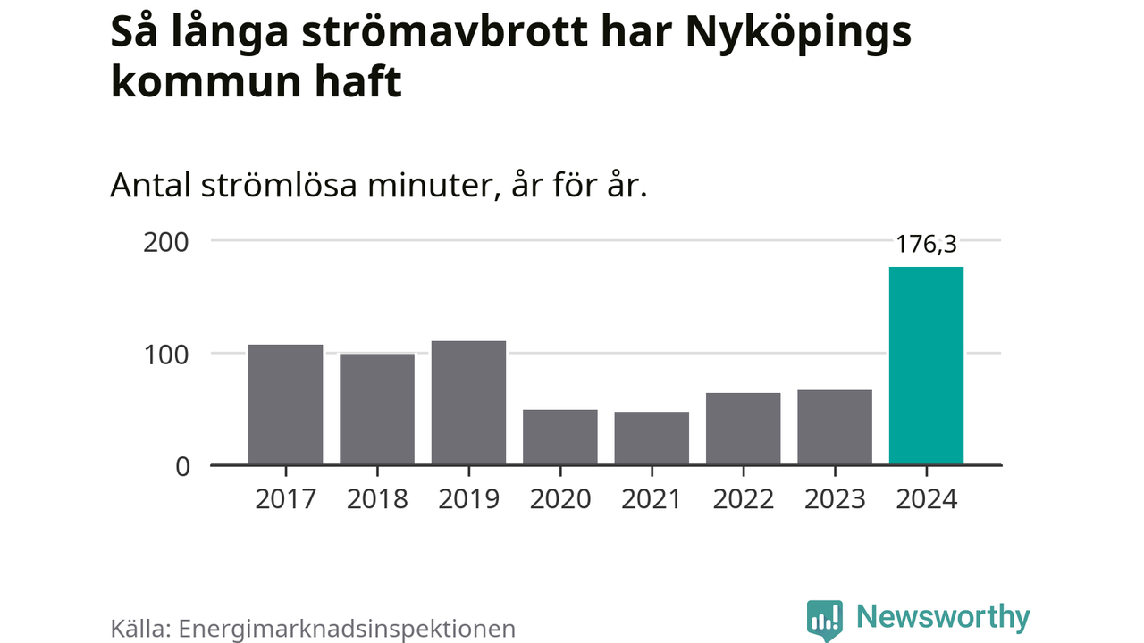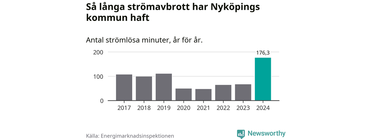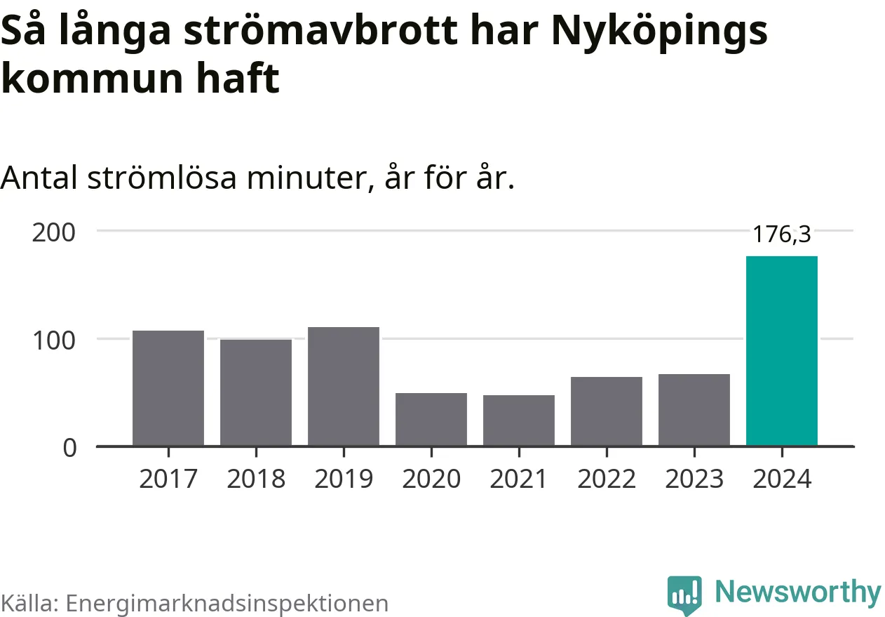 Antalet strömavbrott och total strömlös tid varierar från år till år i Nyköpings kommun. Mest tid utan ström (i alla fall under perioden 2017–2024) fick Nyköpingsborna genomleva under 2024 – två timmar och 56 minuter. Det är en timme och 34 minuter längre än under ett normalår.