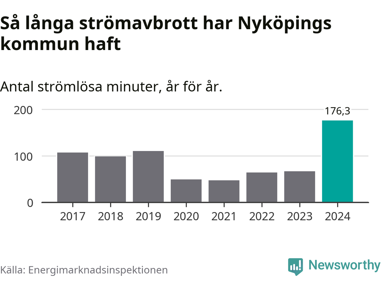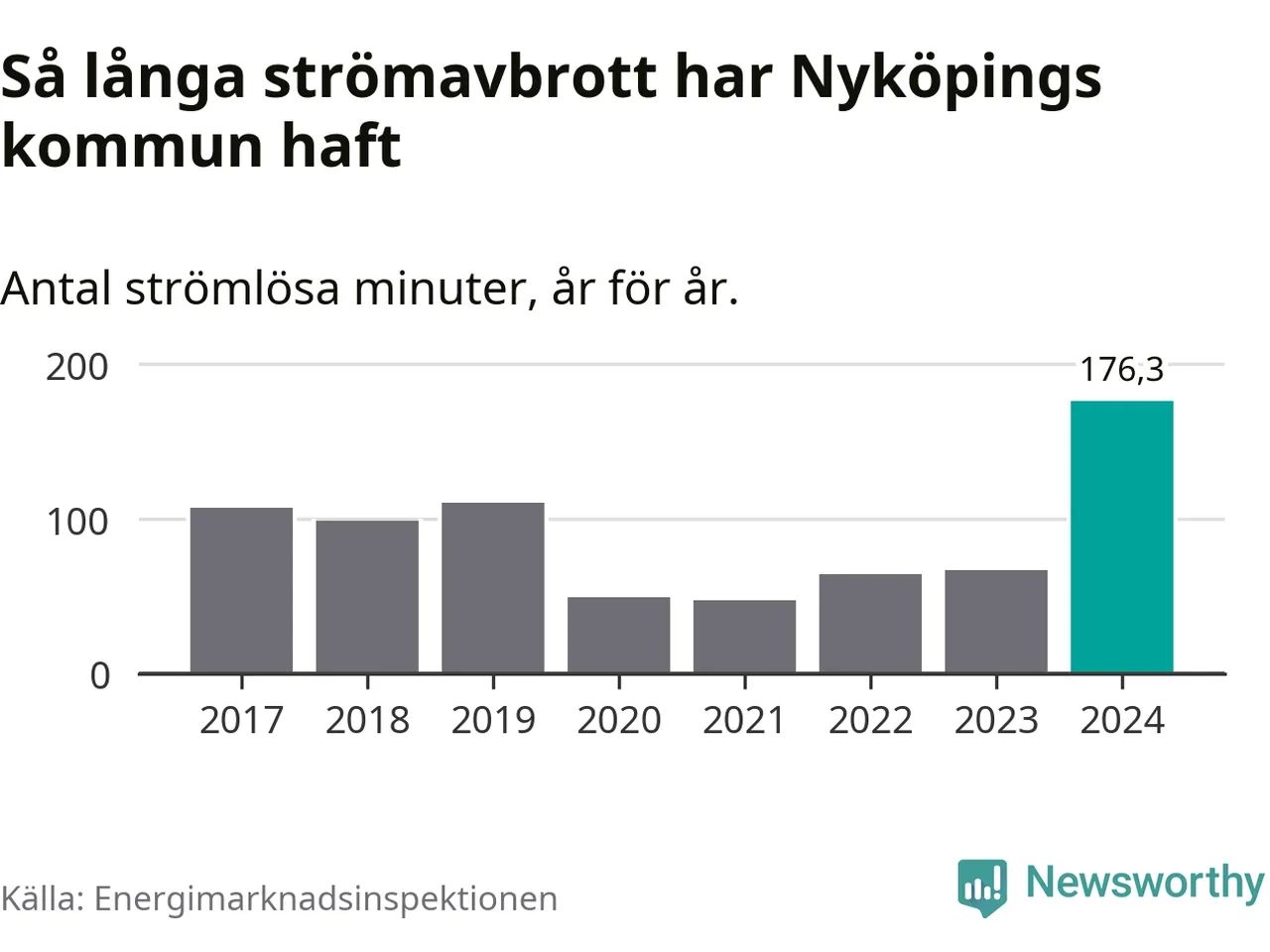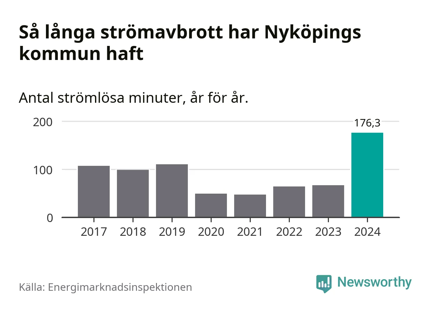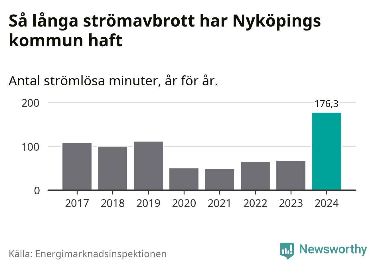Antalet strömavbrott och total strömlös tid varierar från år till år i Nyköpings kommun. Mest tid utan ström (i alla fall under perioden 2017–2024) fick Nyköpingsborna genomleva under 2024 – två timmar och 56 minuter. Det är en timme och 34 minuter längre än under ett normalår.