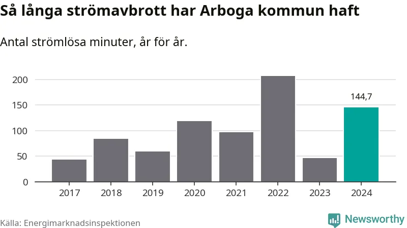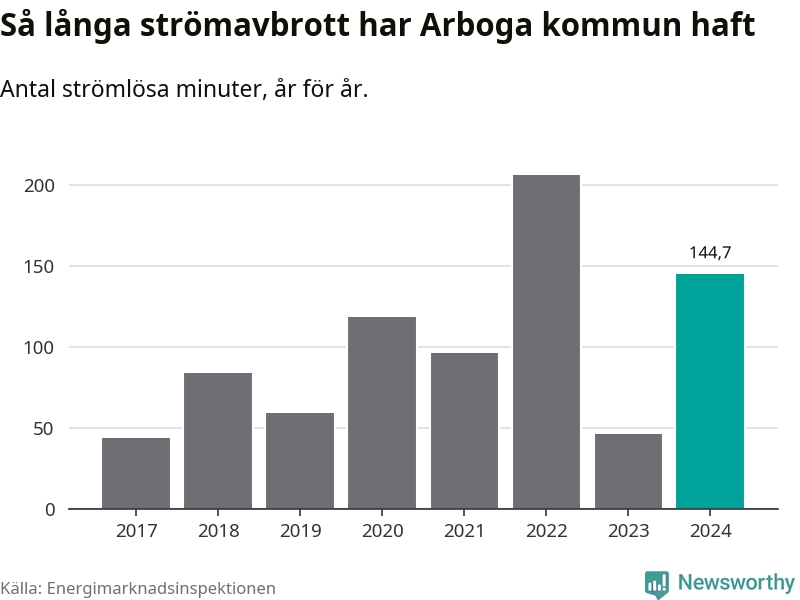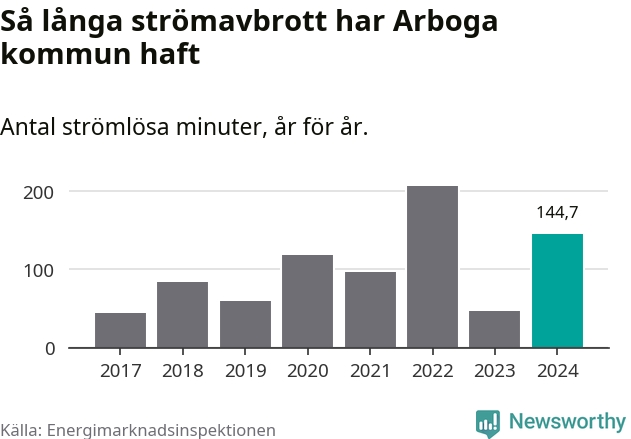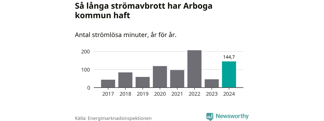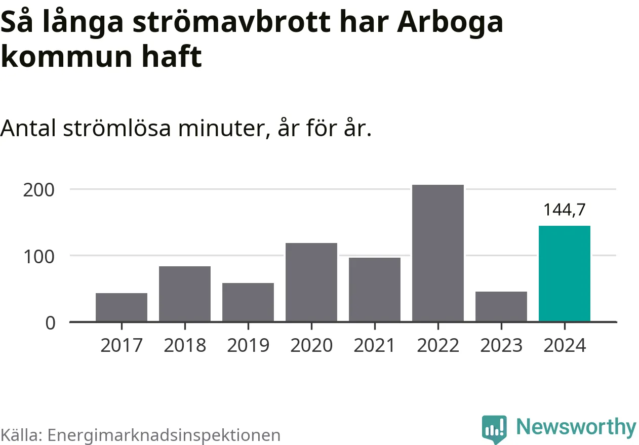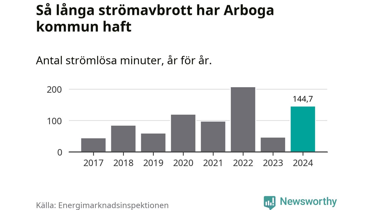 Antalet strömavbrott och total strömlös tid varierar från år till år i Arboga kommun. Mest tid utan ström (i alla fall under perioden 2017–2024) fick Arbogaborna genomleva under 2022 – tre timmar och 26 minuter. Det är en timme och 56 minuter längre än under ett normalår.