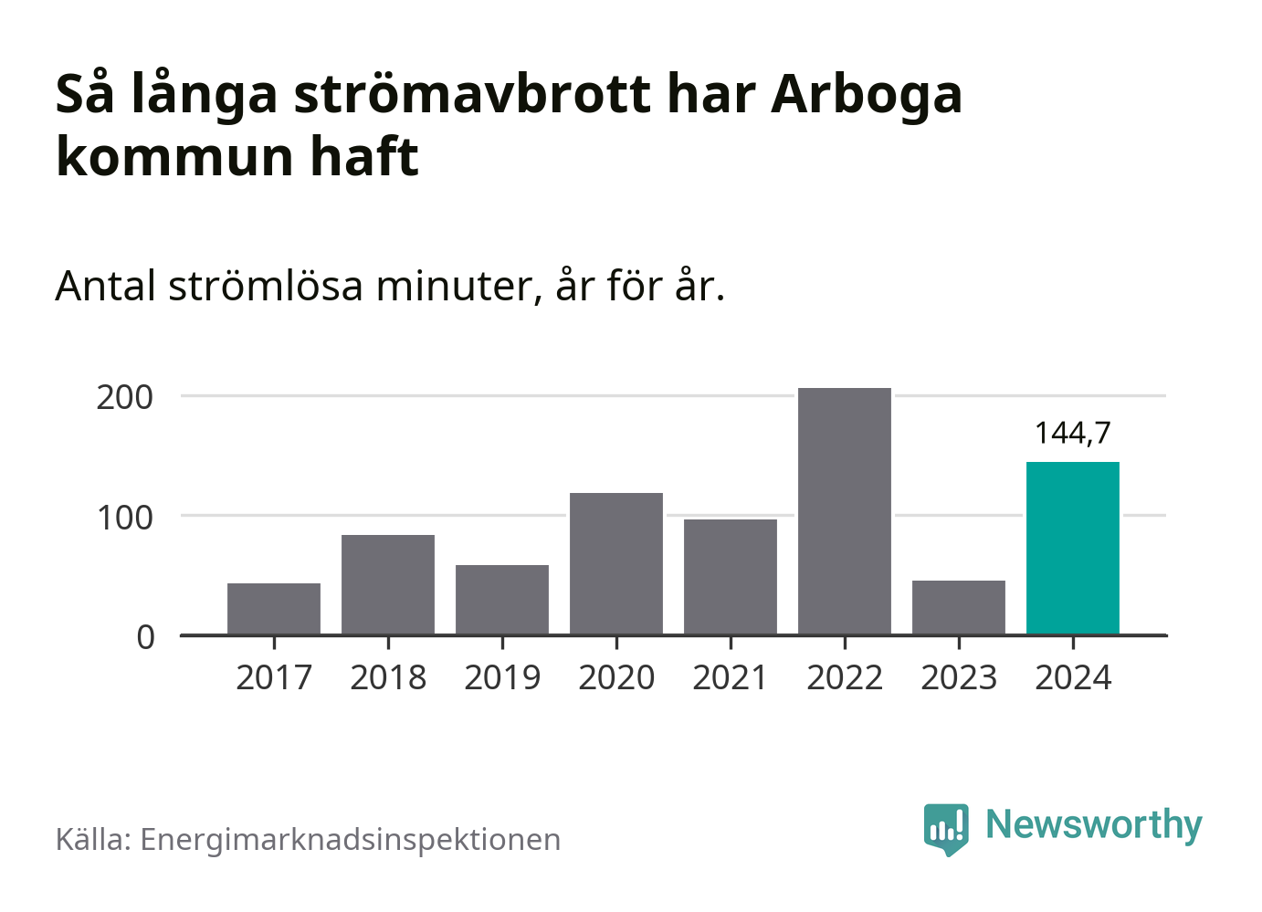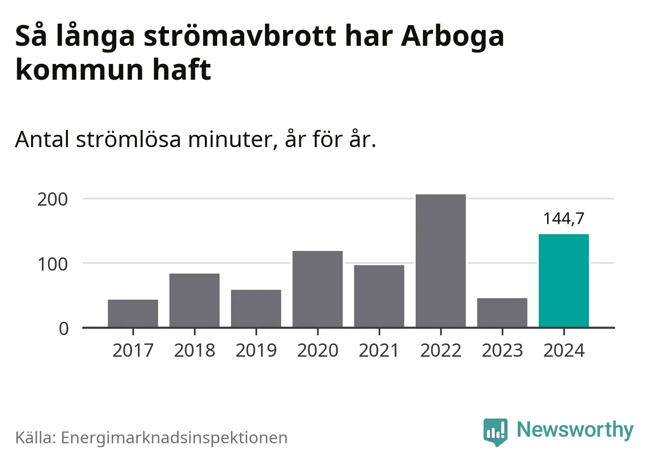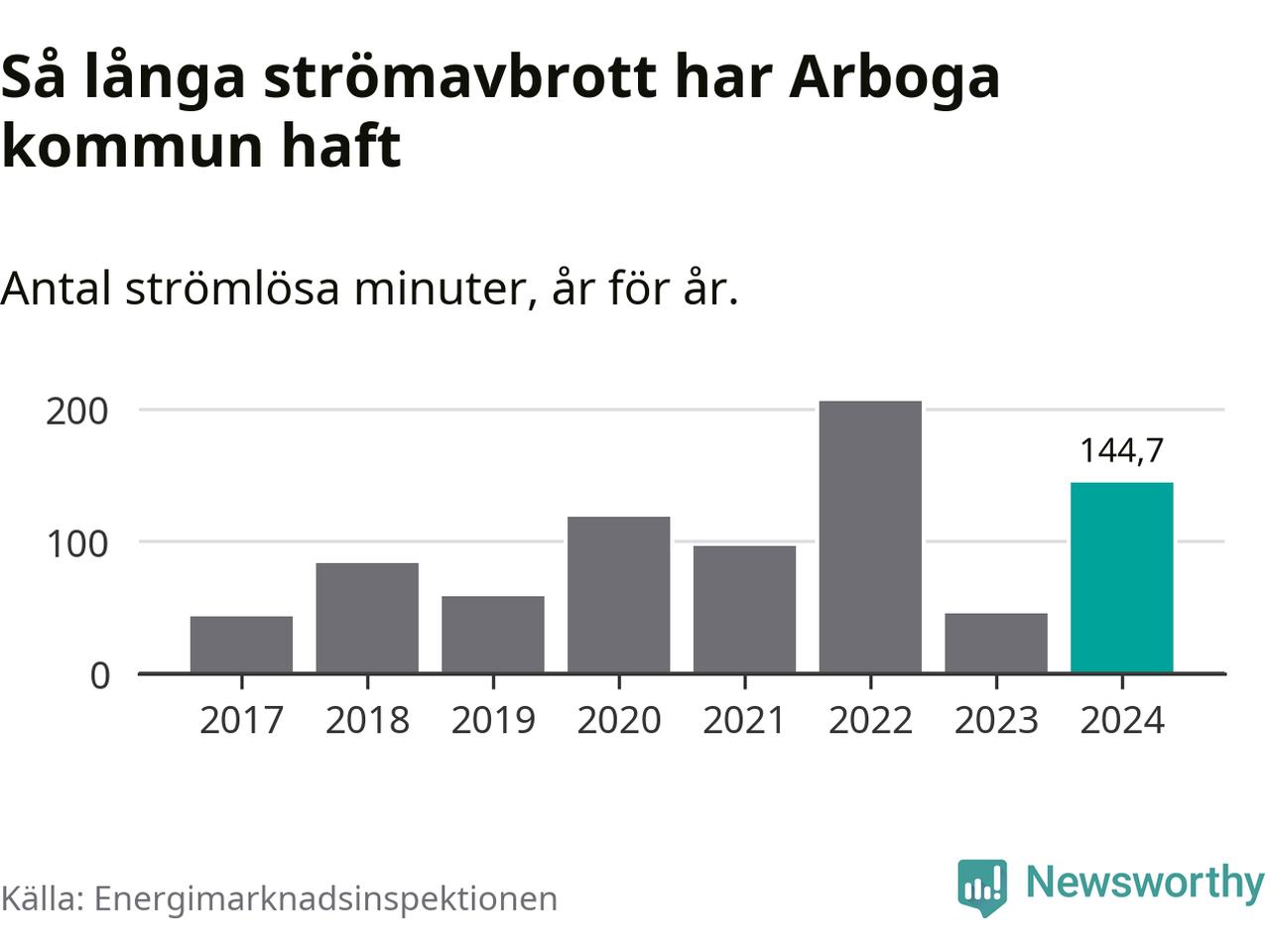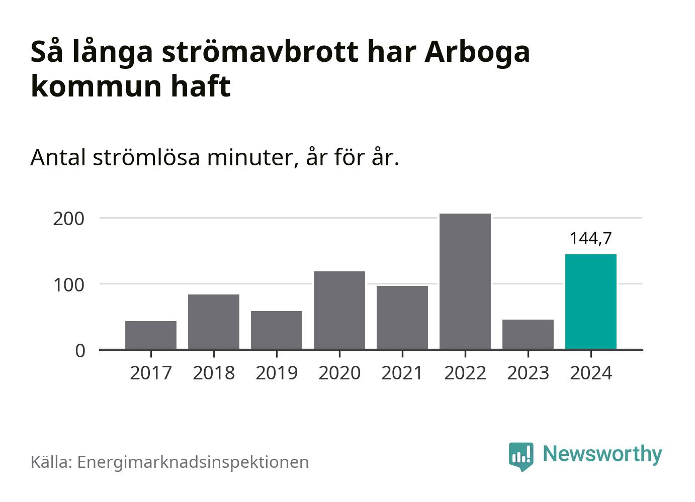 Antalet strömavbrott och total strömlös tid varierar från år till år i Arboga kommun. Mest tid utan ström (i alla fall under perioden 2017–2024) fick Arbogaborna genomleva under 2022 – tre timmar och 26 minuter. Det är en timme och 56 minuter längre än under ett normalår.