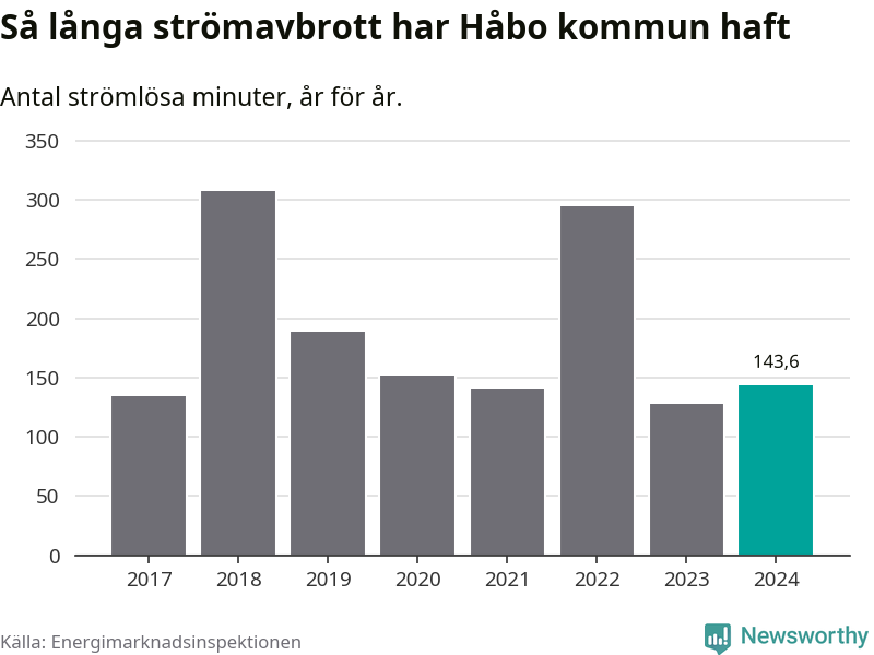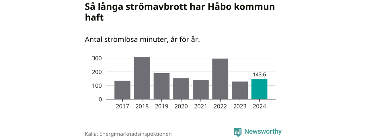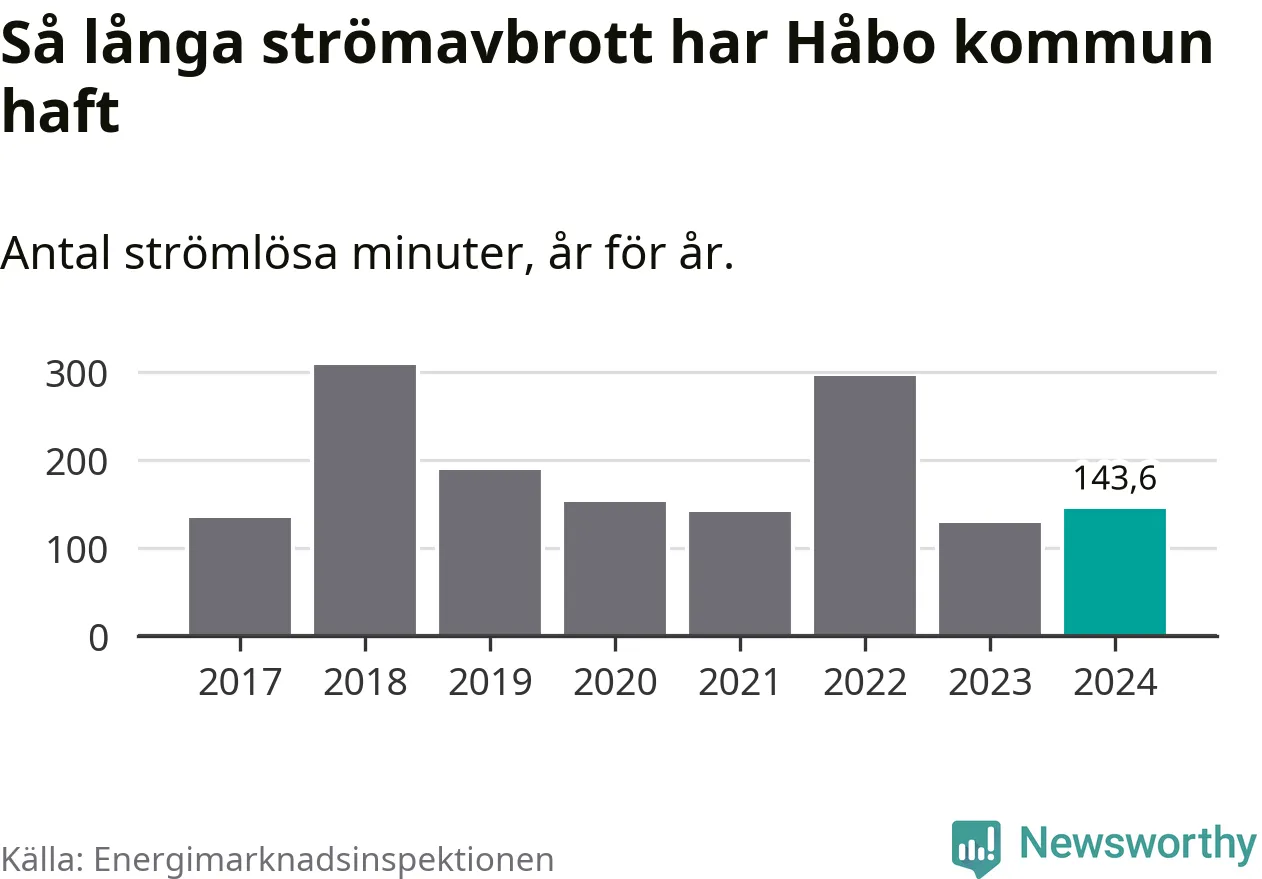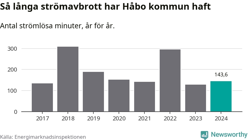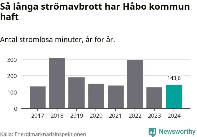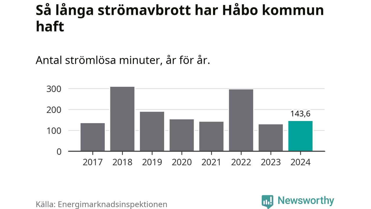 Antalet strömavbrott och total strömlös tid varierar från år till år i Håbo kommun. Mest tid utan ström (i alla fall under perioden 2017–2024) fick Håboborna genomleva under 2018 – fem timmar och åtta minuter. Det är två timmar och 40 minuter längre än under ett normalår.