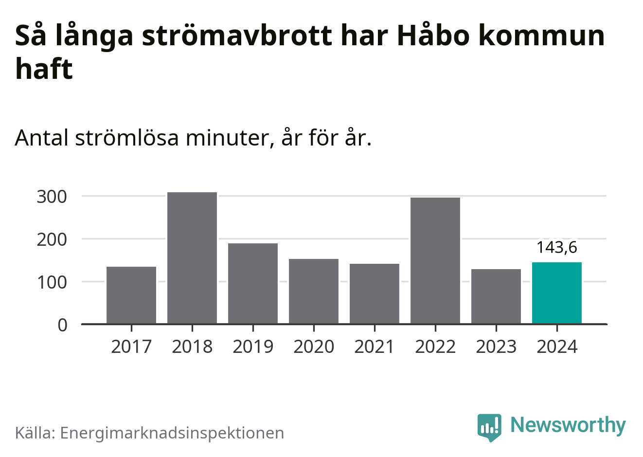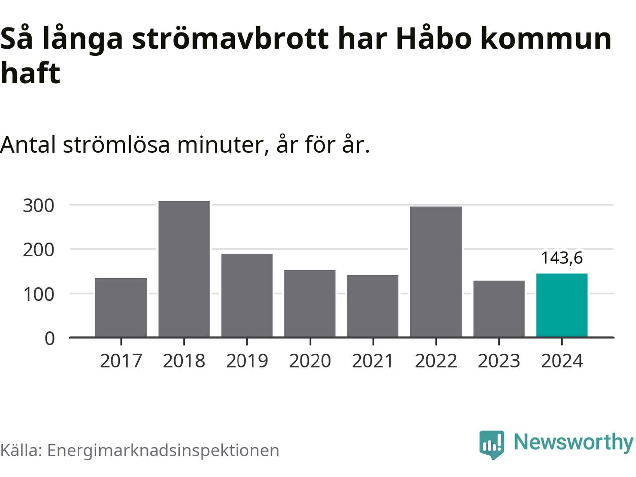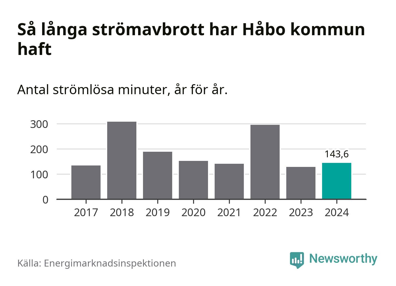 Antalet strömavbrott och total strömlös tid varierar från år till år i Håbo kommun. Mest tid utan ström (i alla fall under perioden 2017–2024) fick Håboborna genomleva under 2018 – fem timmar och åtta minuter. Det är två timmar och 40 minuter längre än under ett normalår.