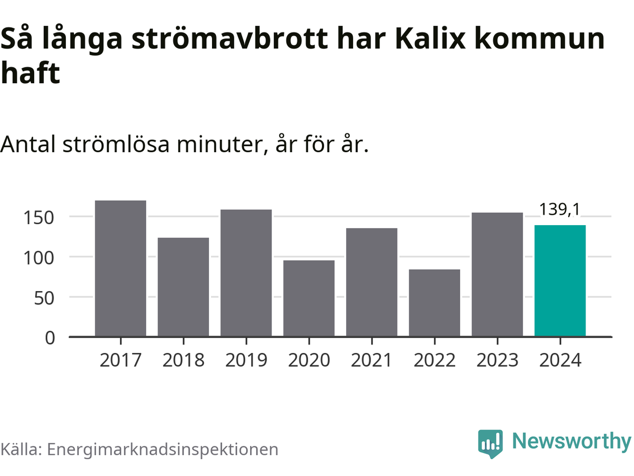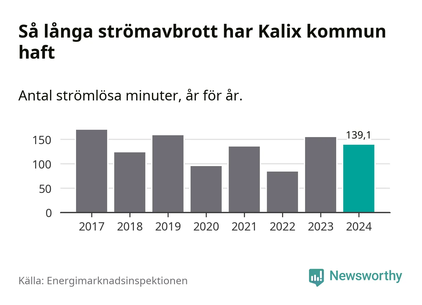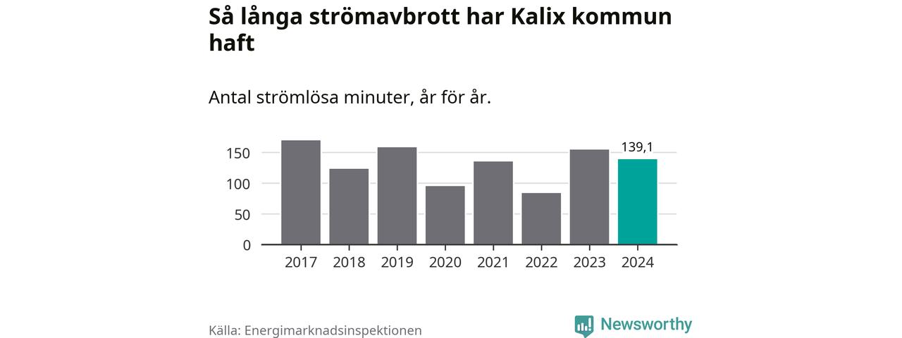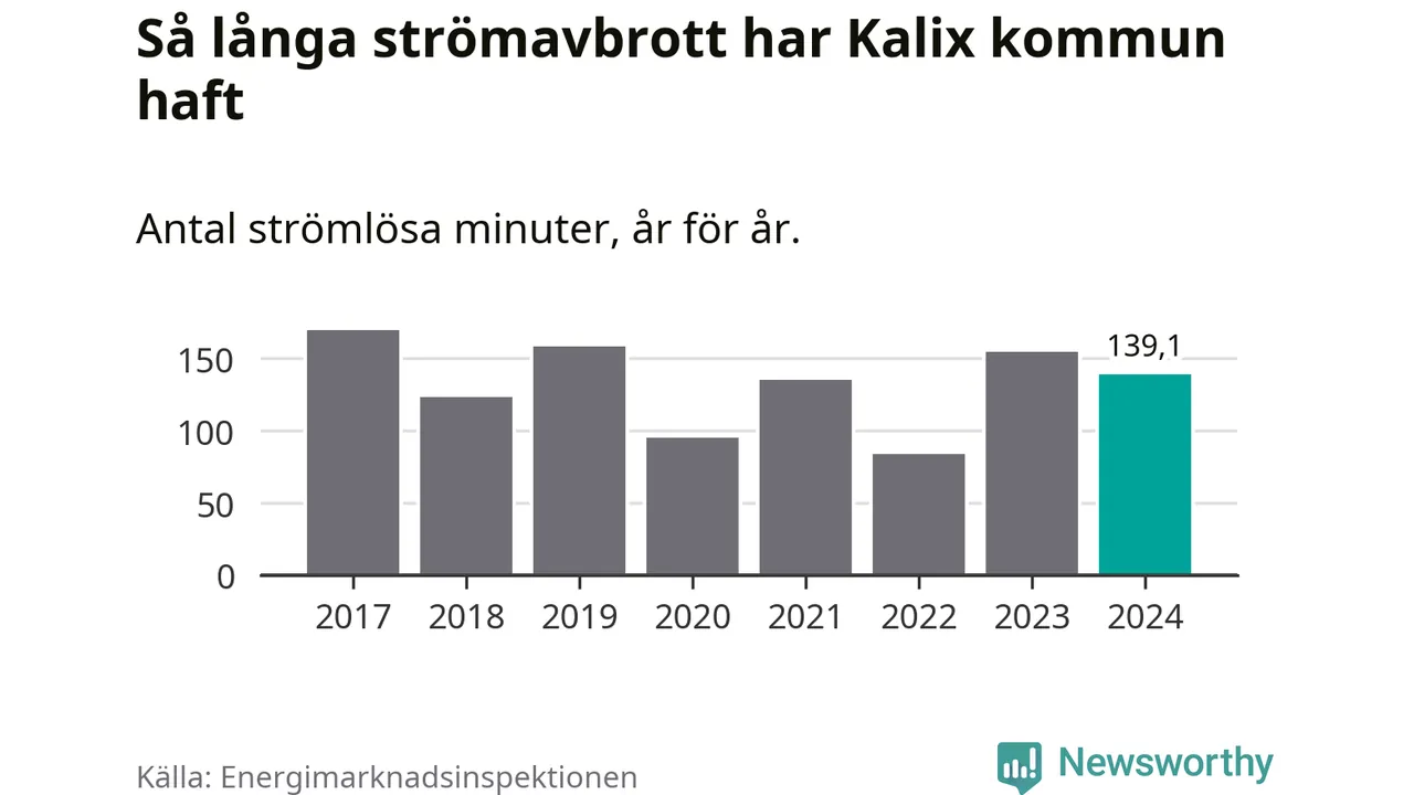 Antalet strömavbrott och total strömlös tid varierar något från år till år i Kalix kommun. Mest tid utan ström (i alla fall under perioden 2017–2024) fick Kalixborna genomleva under 2017 – två timmar och 50 minuter. Det är 32 minuter längre än under ett normalår.