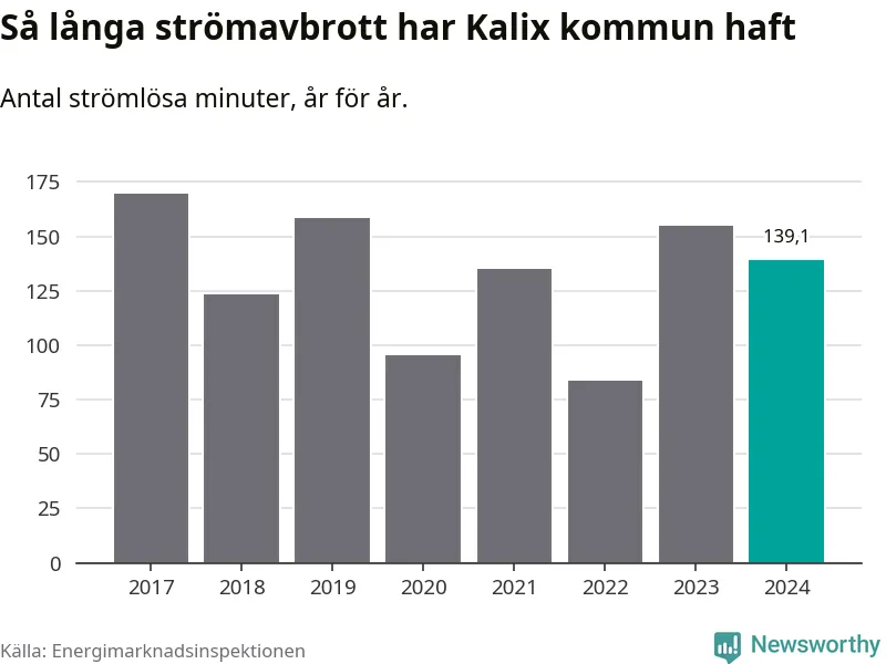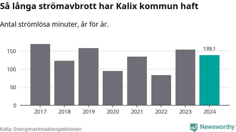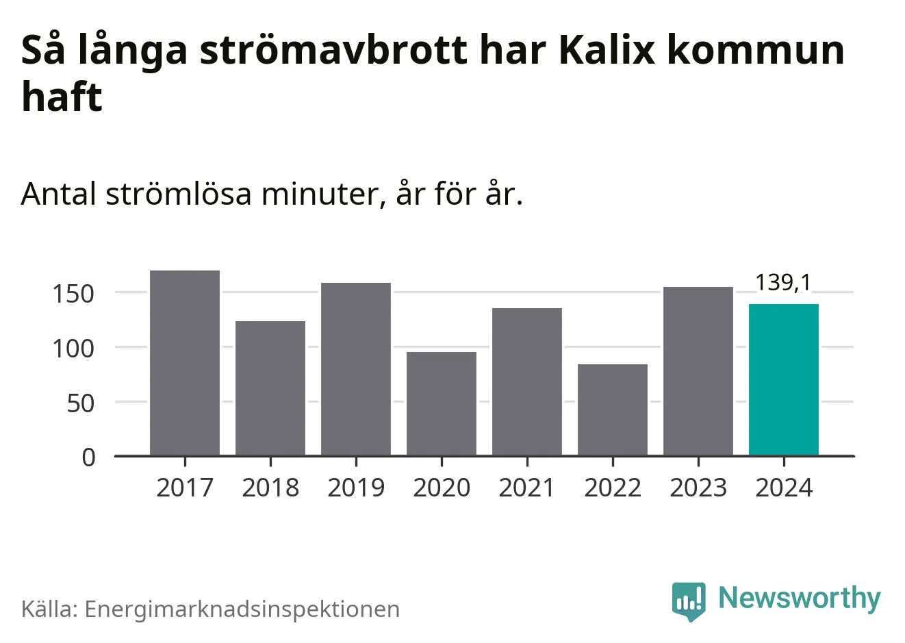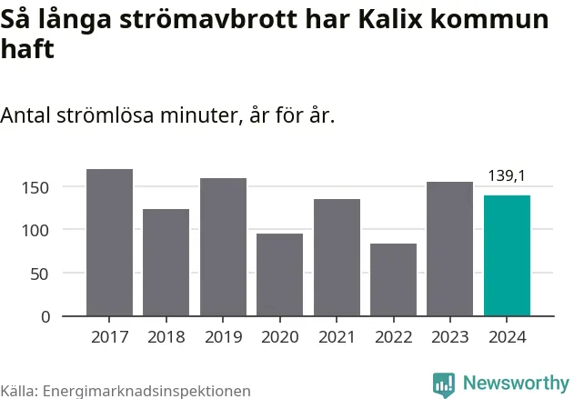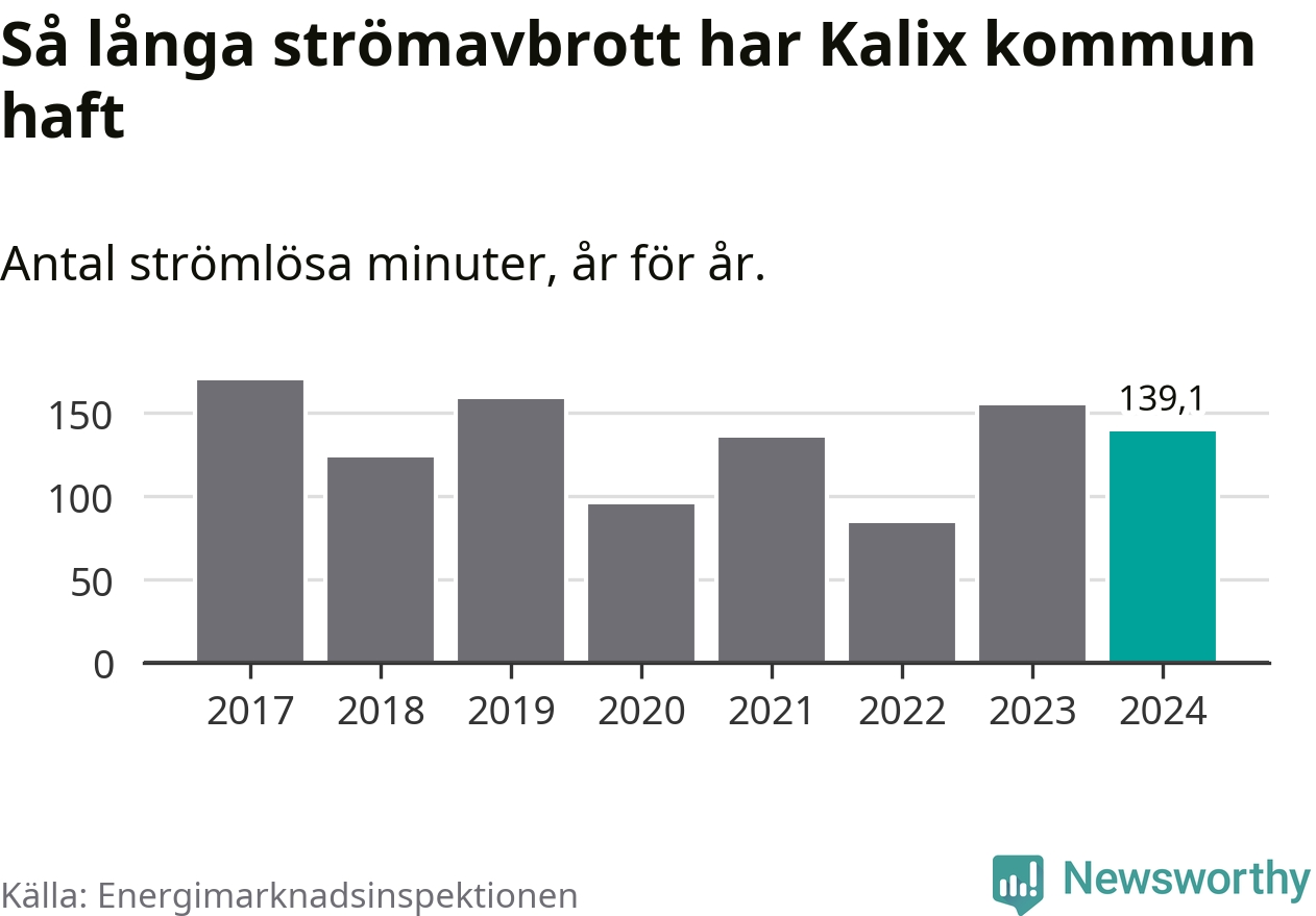 Antalet strömavbrott och total strömlös tid varierar något från år till år i Kalix kommun. Mest tid utan ström (i alla fall under perioden 2017–2024) fick Kalixborna genomleva under 2017 – två timmar och 50 minuter. Det är 32 minuter längre än under ett normalår.