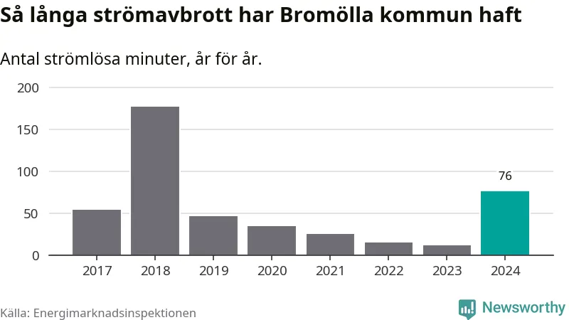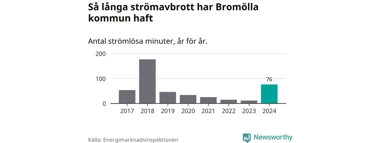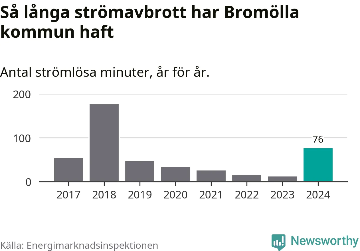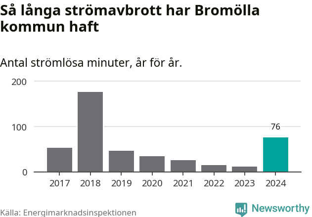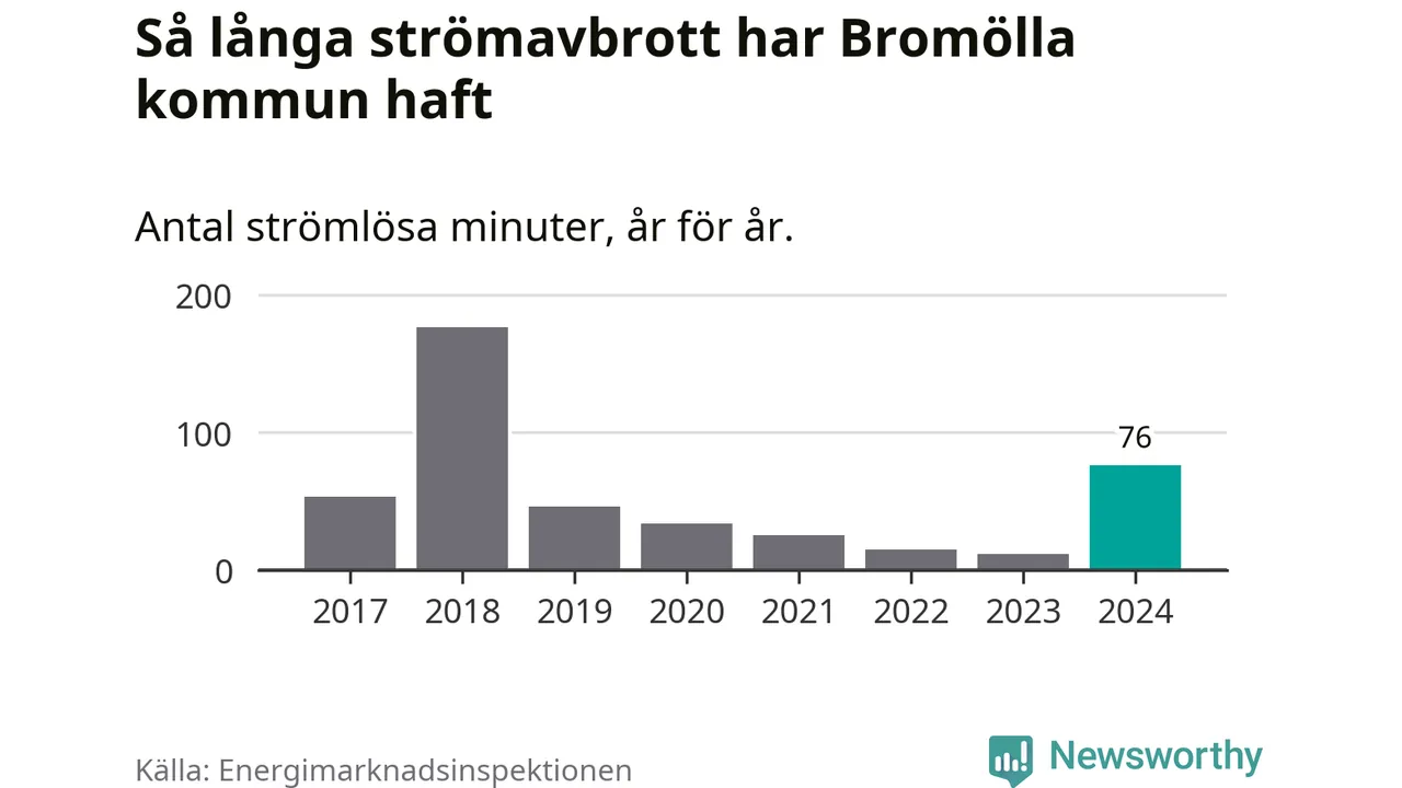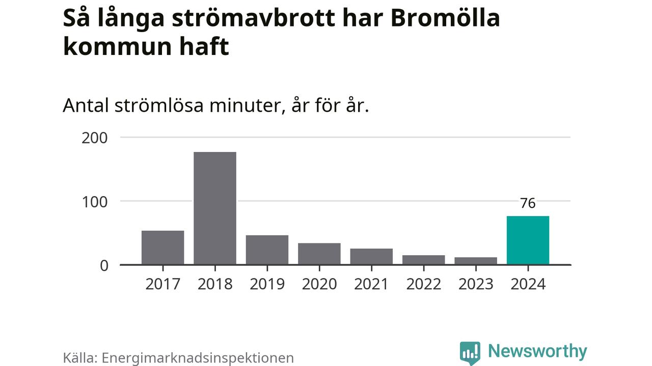 Antalet strömavbrott och total strömlös tid varierar från år till år i Bromölla kommun. Mest tid utan ström (i alla fall under perioden 2017–2024) fick Bromöllaborna genomleva under 2018 – två timmar och 57 minuter. Det är två timmar och 16 minuter längre än under ett normalår.