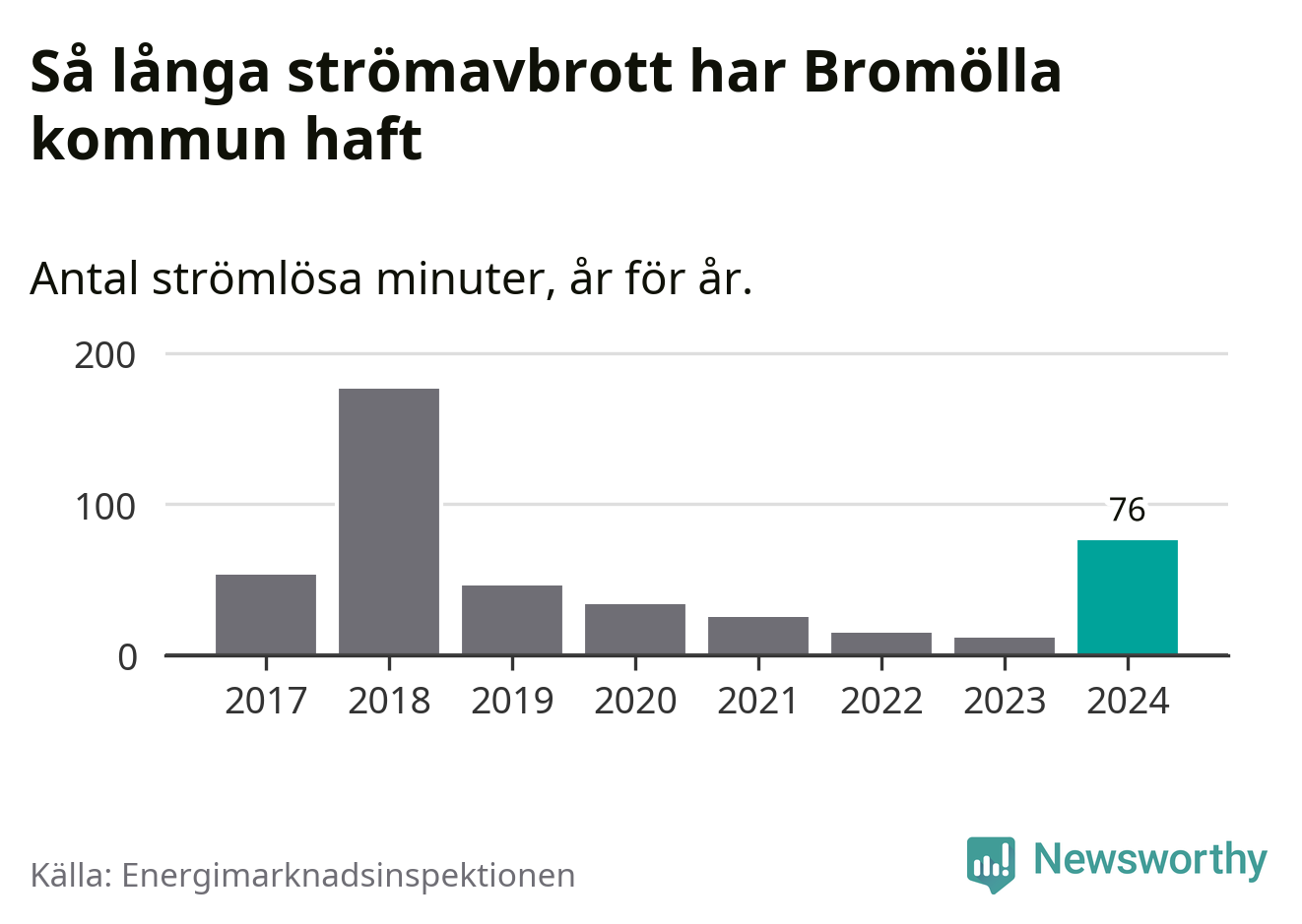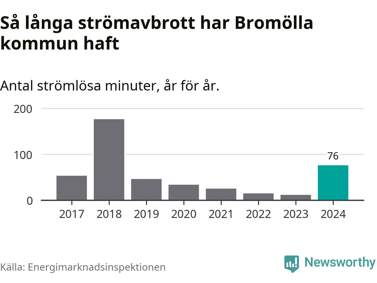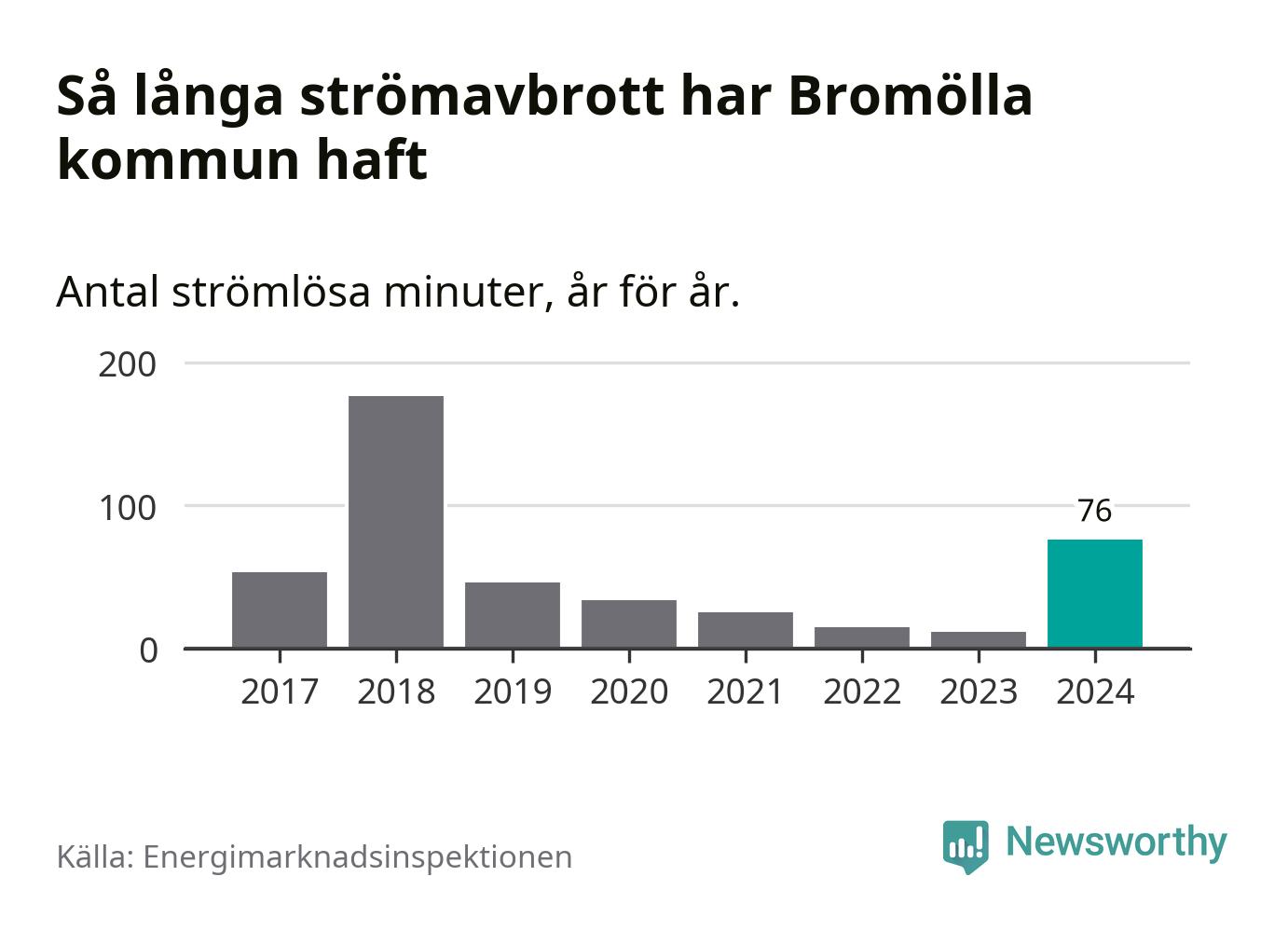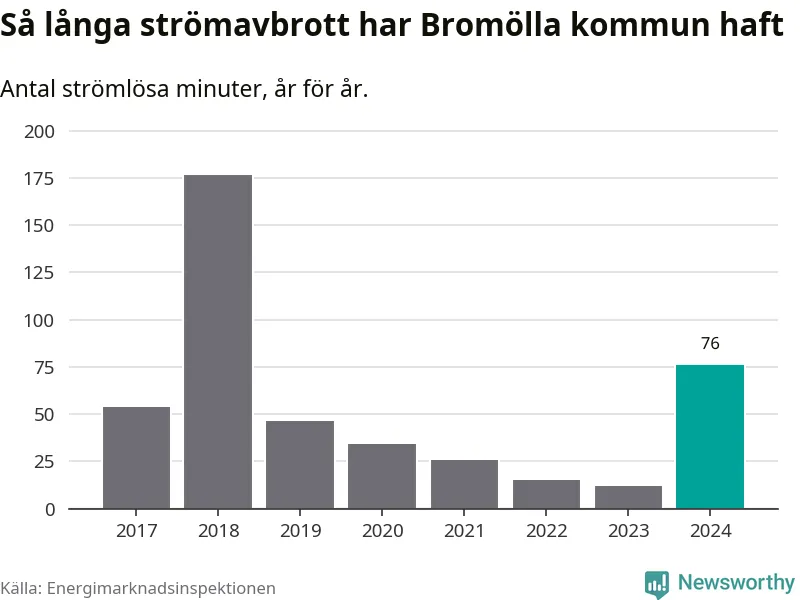 Antalet strömavbrott och total strömlös tid varierar från år till år i Bromölla kommun. Mest tid utan ström (i alla fall under perioden 2017–2024) fick Bromöllaborna genomleva under 2018 – två timmar och 57 minuter. Det är två timmar och 16 minuter längre än under ett normalår.