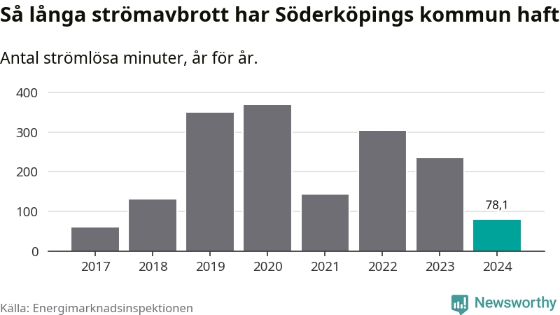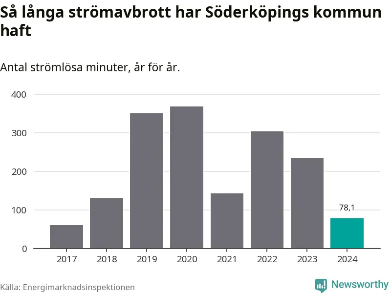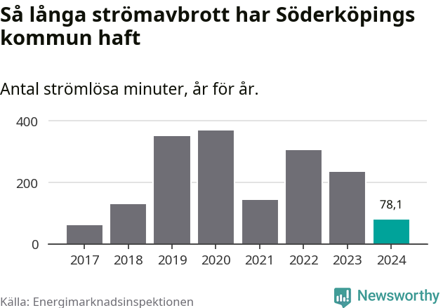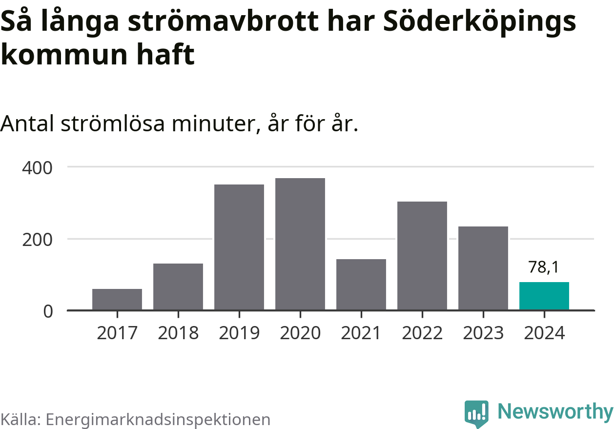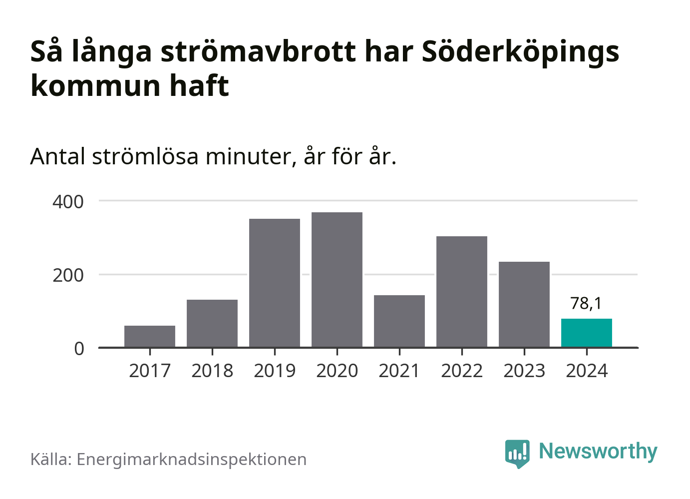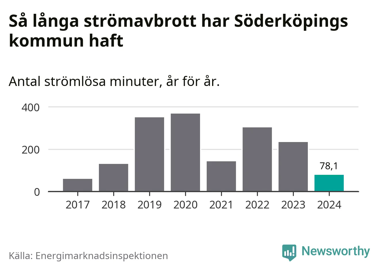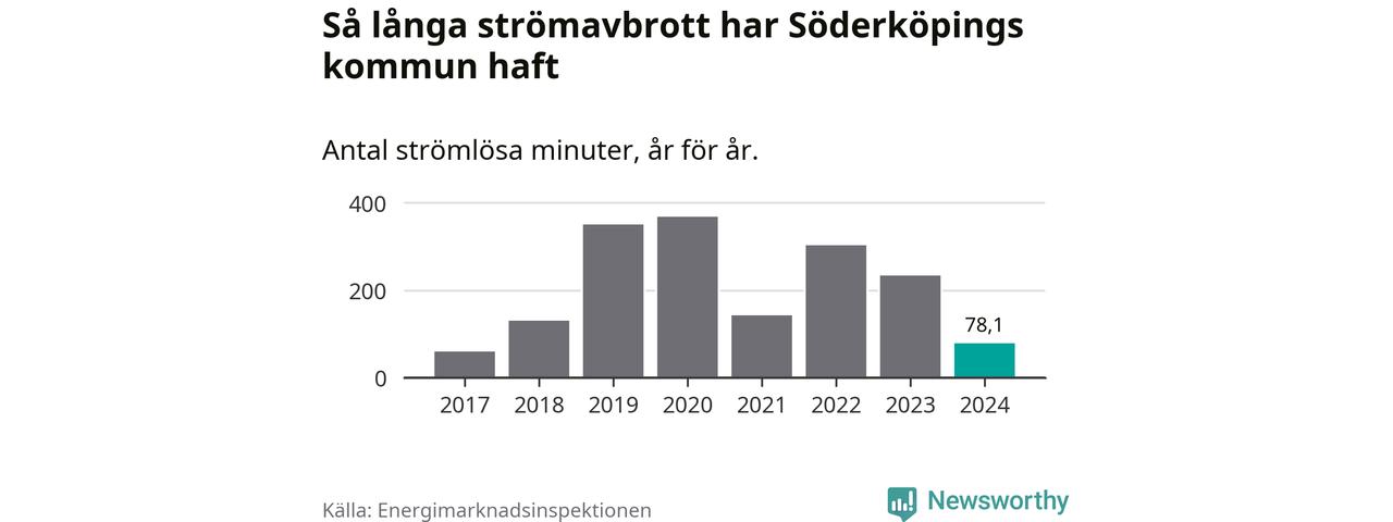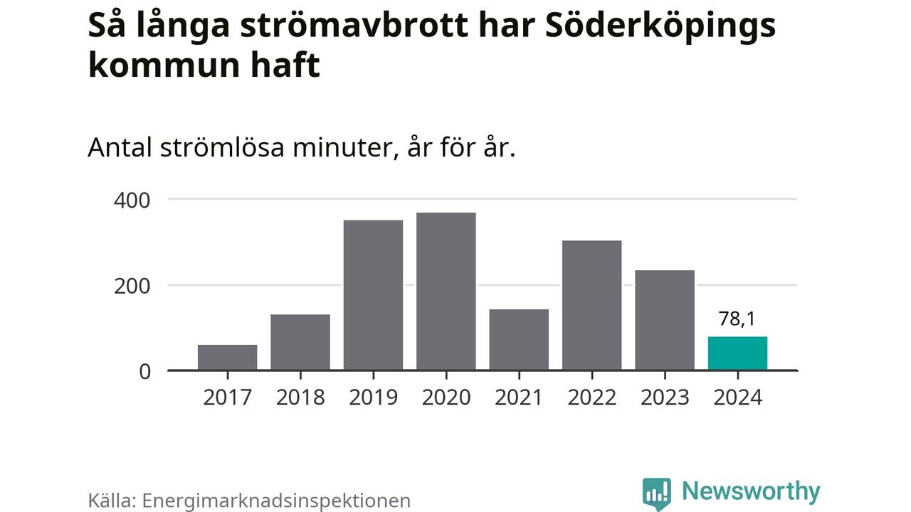 Antalet strömavbrott och total strömlös tid varierar något från år till år i Söderköpings kommun. Mest tid utan ström (i alla fall under perioden 2017–2024) fick Söderköpings­borna genomleva under 2020 – sex timmar och åtta minuter. Det är två timmar och 59 minuter längre än under ett normalår.
